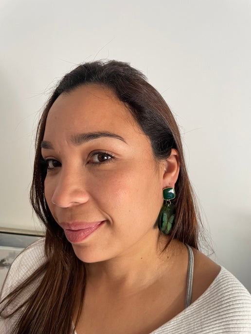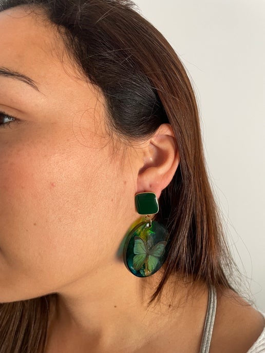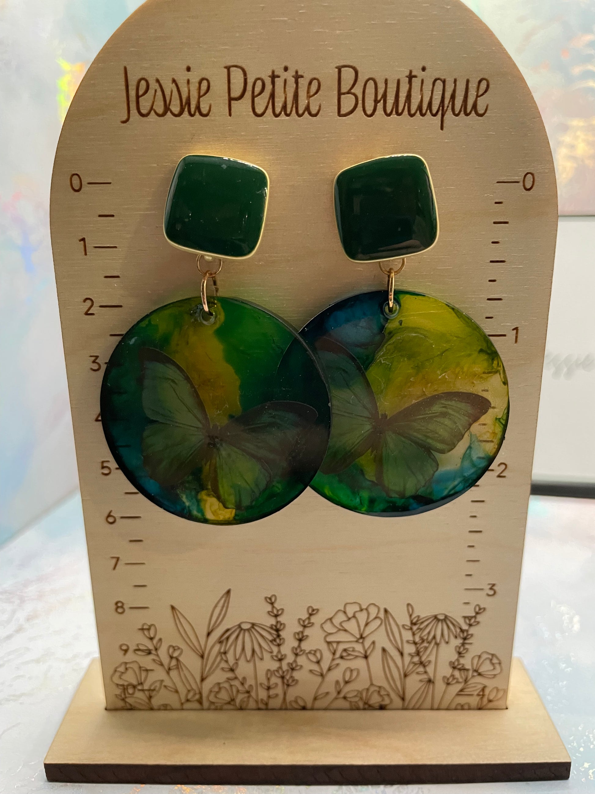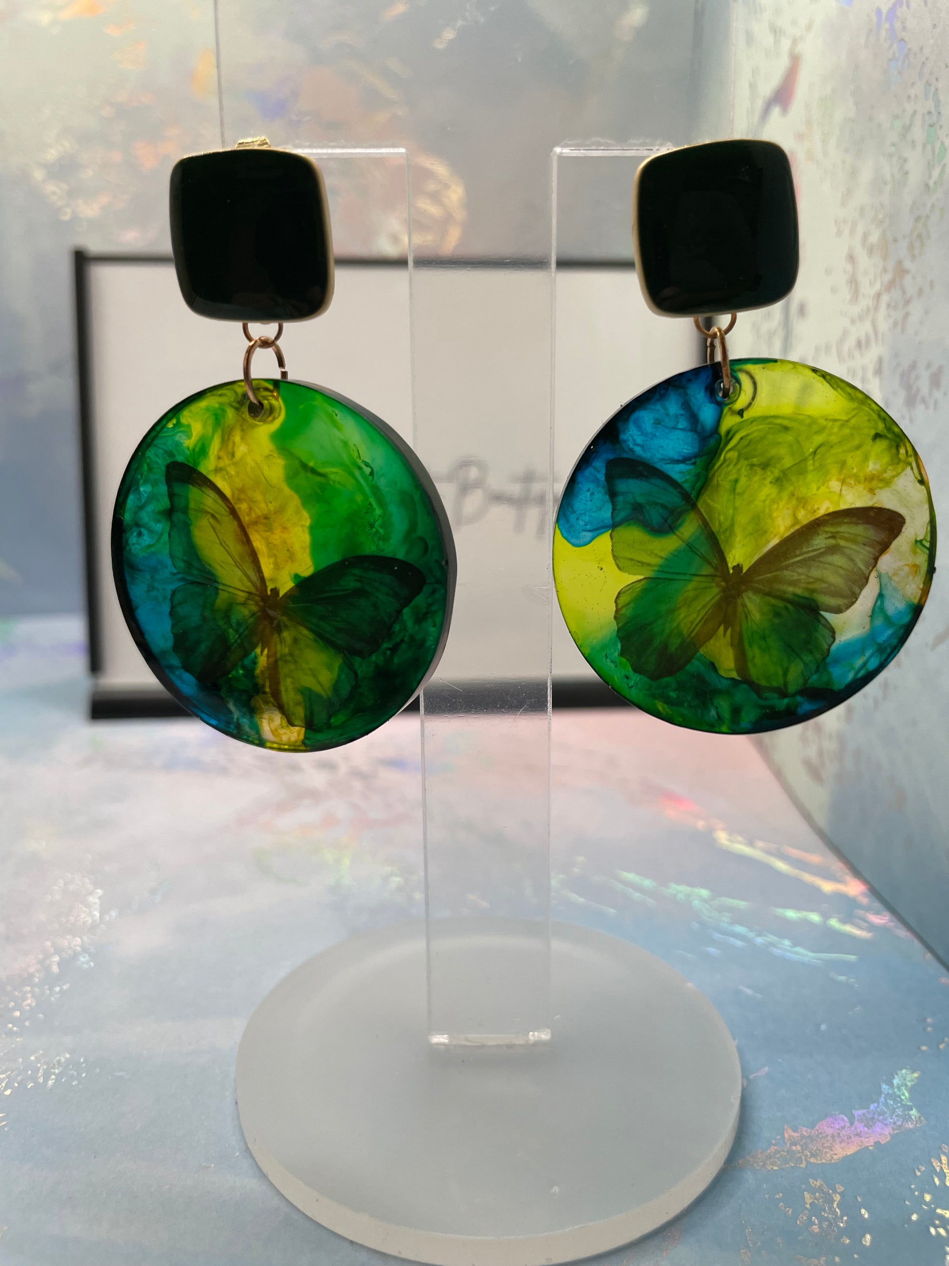 Materials: These earrings are crafted from a plastic butterfly, alcohol ink, and resin, with a green enamel and alloy stud. The nickel-free butterfly closure ensures comfort for sensitive ears.