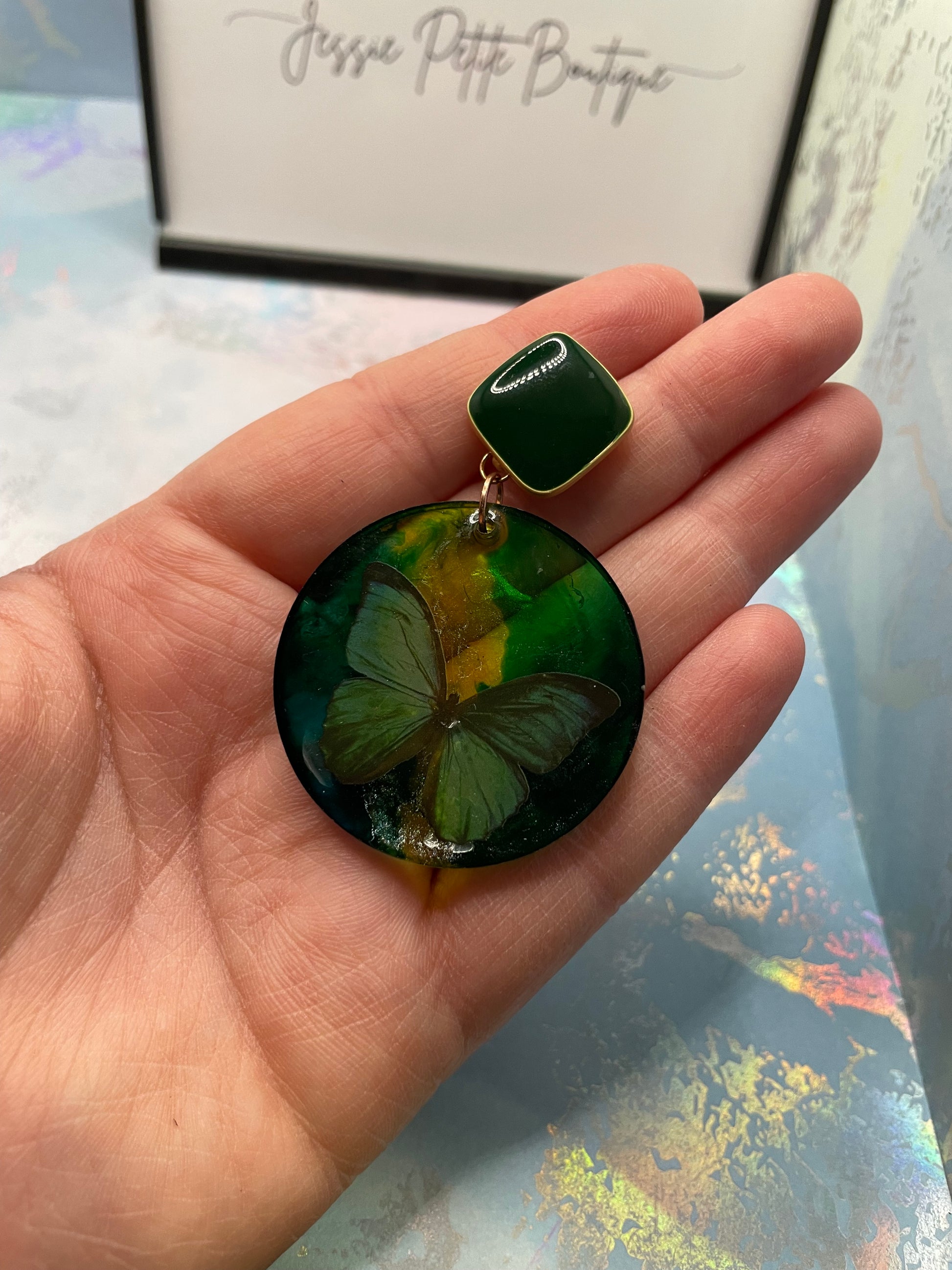 Elevate your style with our "Green Butterfly " round earrings. These captivating earrings feature a vibrant green butterfly design set against translucent green and blue resin. The addition of a green enamel square stud with gold accents brings a touch of sophistication to this nature-inspired look.