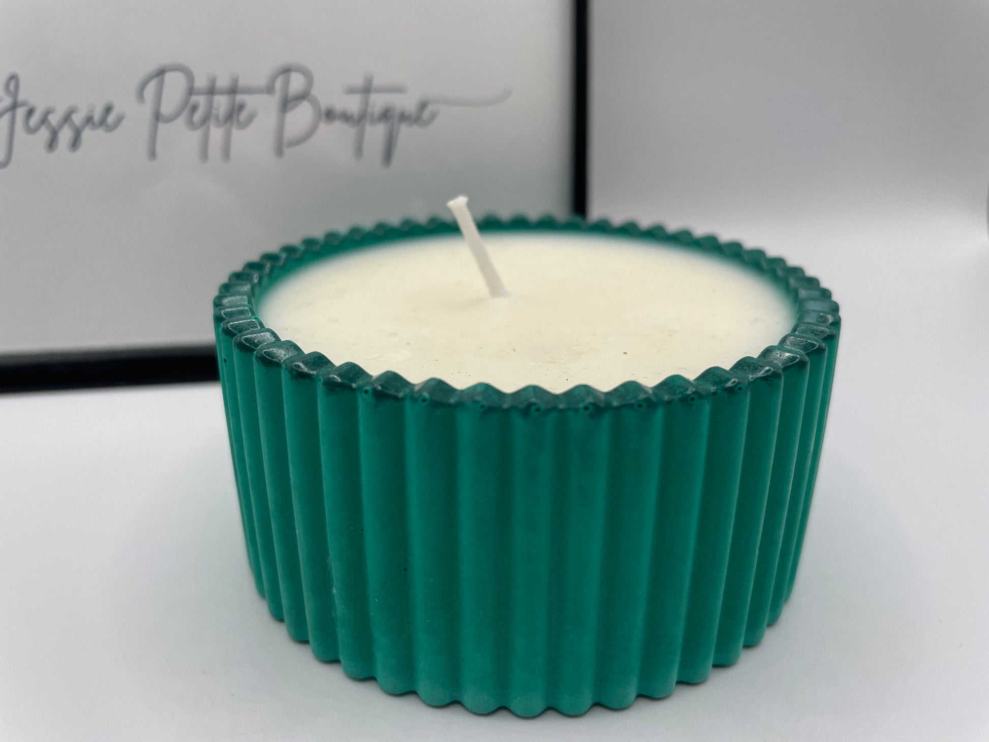 Bring a fresh and vibrant touch to your space with this handmade soy candle, poured into a beautifully crafted green eco-resin container. The container features a modern ribbed design with vertical grooves all around, giving it a clean, contemporary look while keeping a soft round silhouette. Its structured edges create an eye-catching texture that stands out beautifully on any shelf, desk, or bedside table.