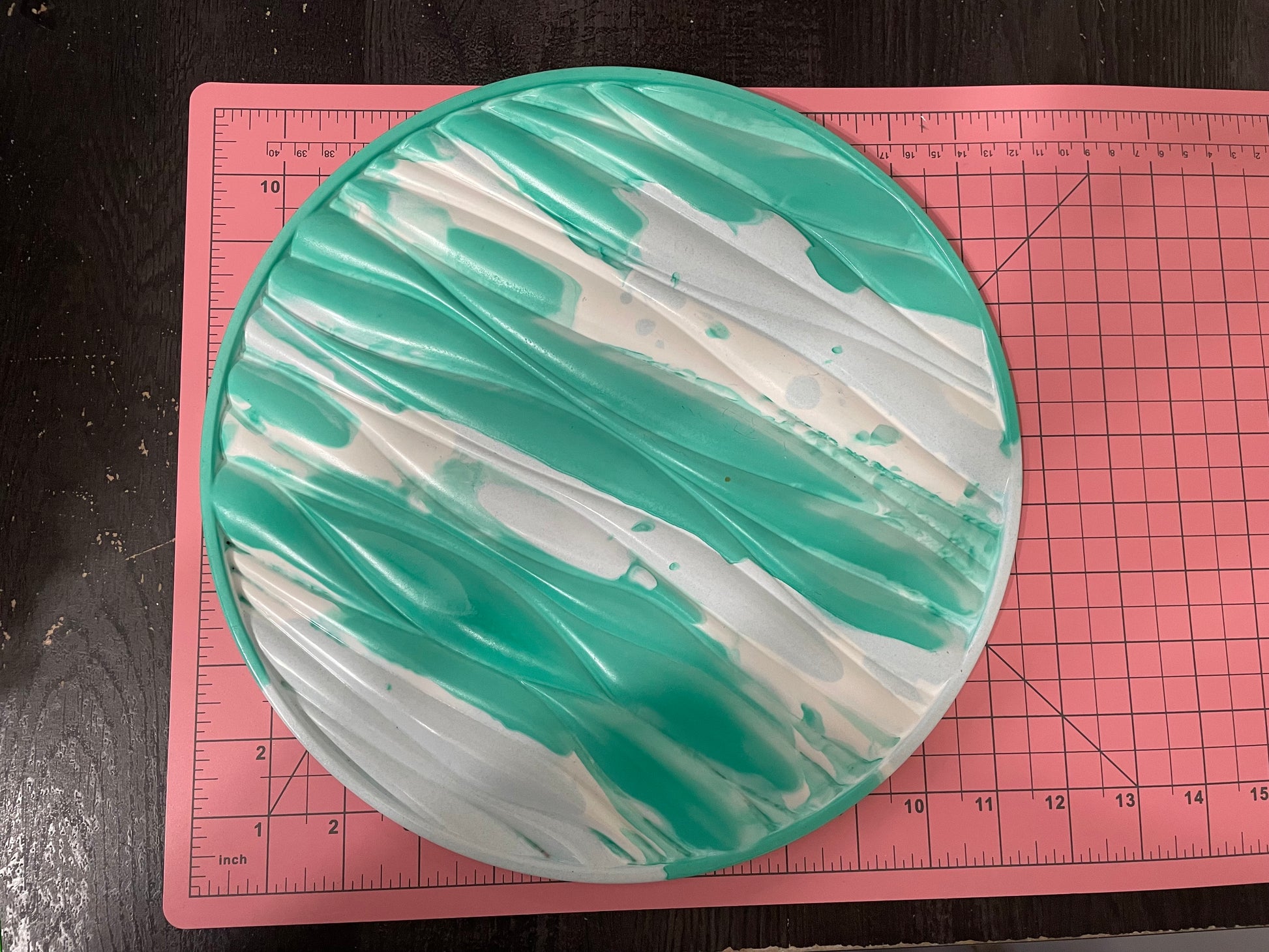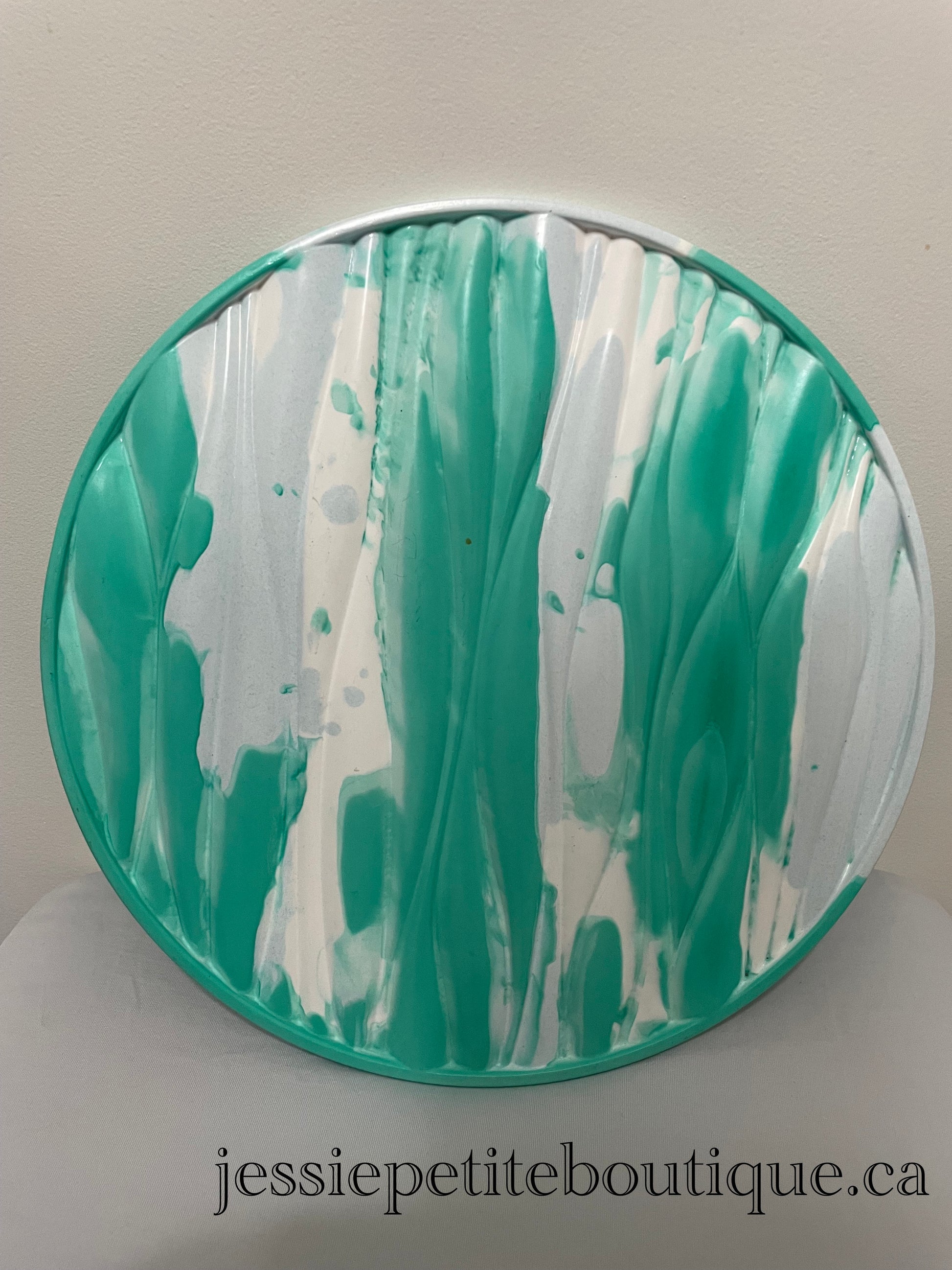Add a bold and artistic touch to your décor with this handmade eco-resin round tray. Featuring a beautiful green and white swirl design, it combines modern style with sustainable craftsmanship. Its funky surface and vibrant pattern make it a versatile piece—perfect for serving, displaying, or decorating.
