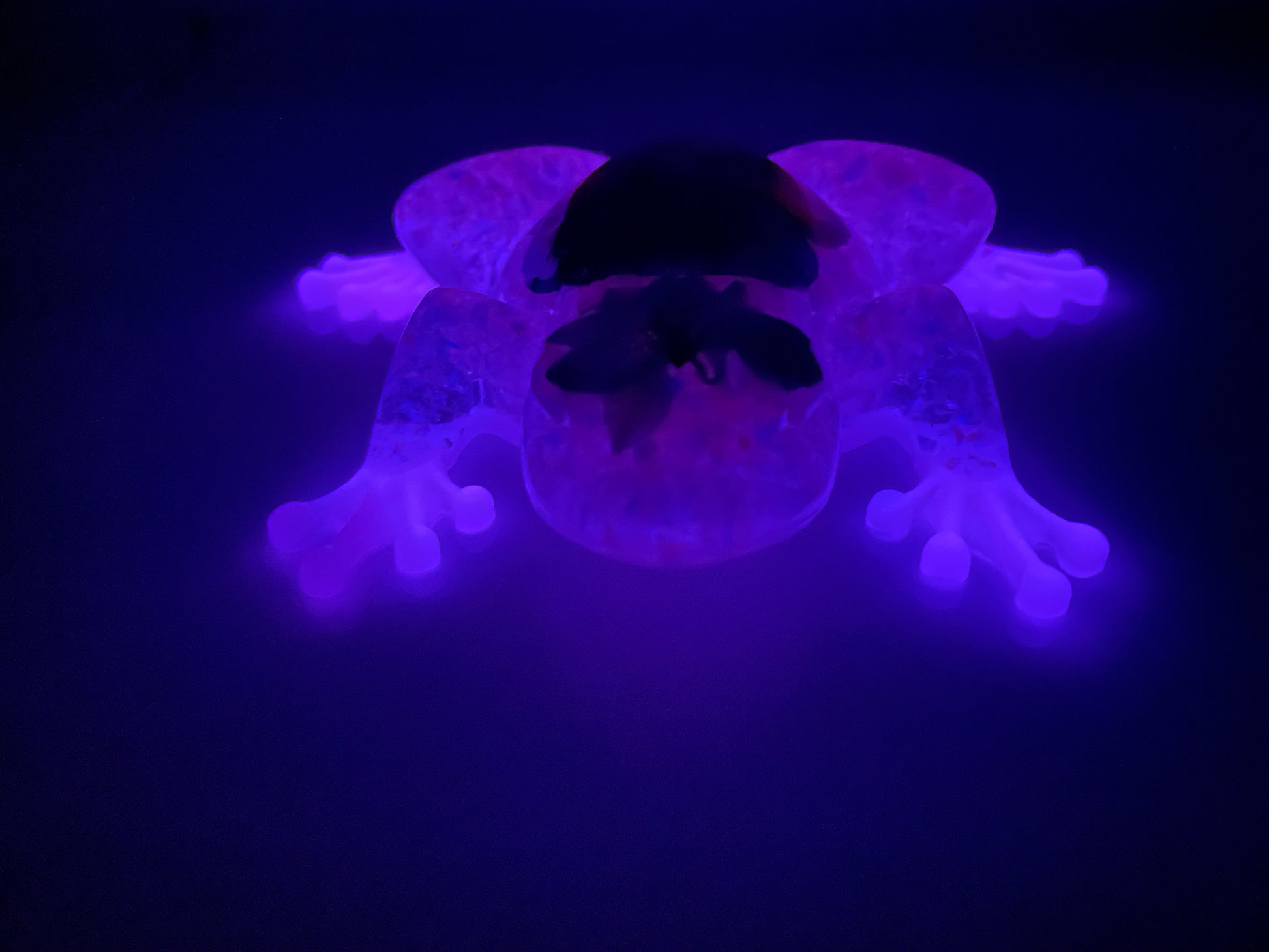 Bring a touch of magic and color to your space with this handmade resin frog figurine. Each piece is carefully crafted with real dried flowers, shimmering foil flakes, and mica powder that glows in the dark, creating a dreamy luminous effect at night.