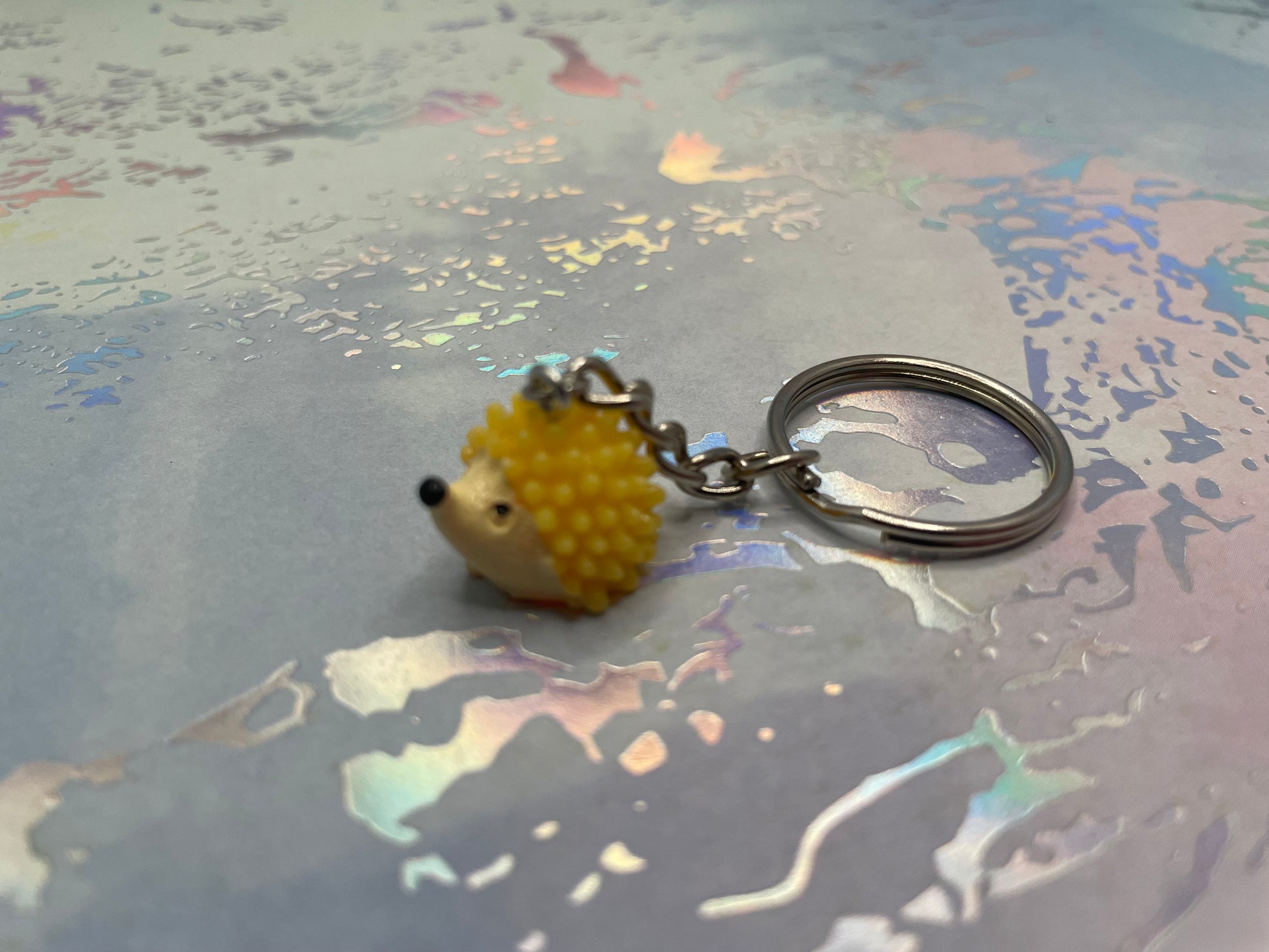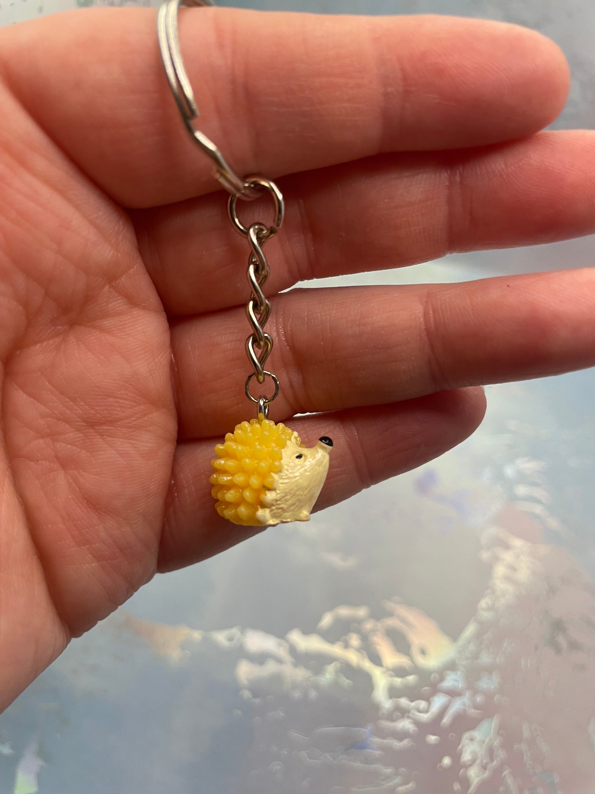 Add a touch of charm to your everyday essentials with this adorable hedgehog keychain. Featuring a finely detailed design, this miniature hedgehog showcases textured yellow spines and a soft neutral body, finished with tiny black eyes and nose for a sweet, lifelike expression.