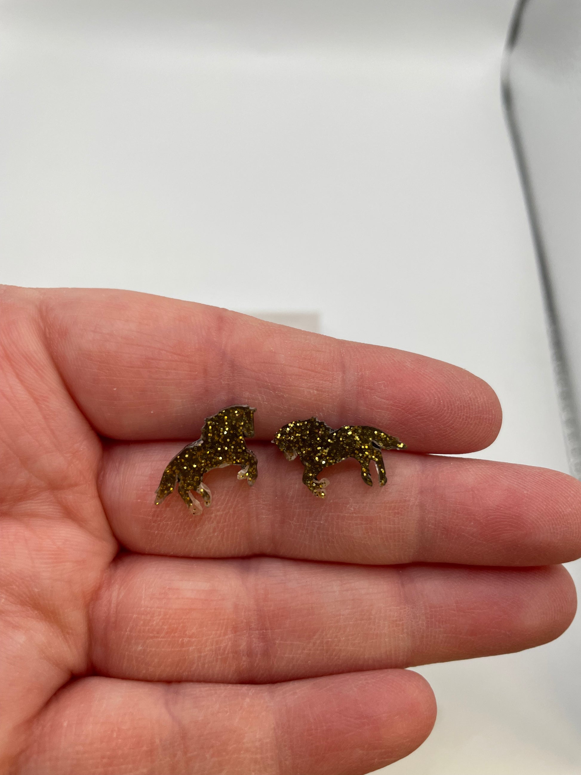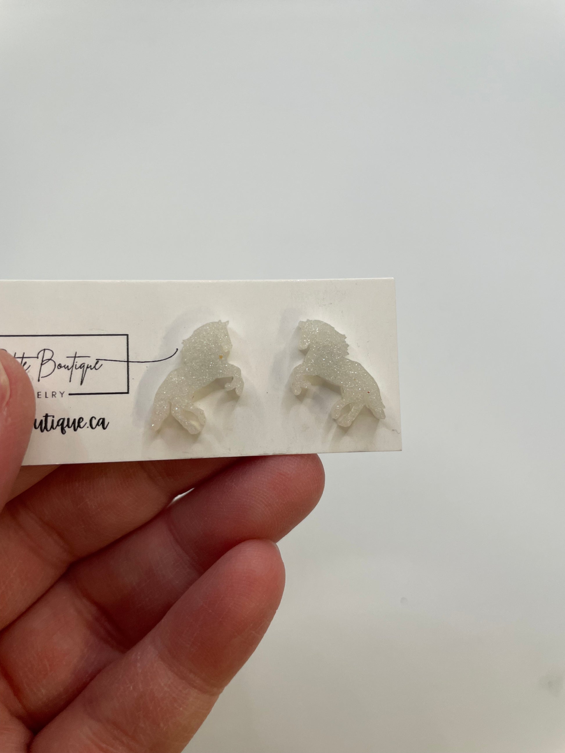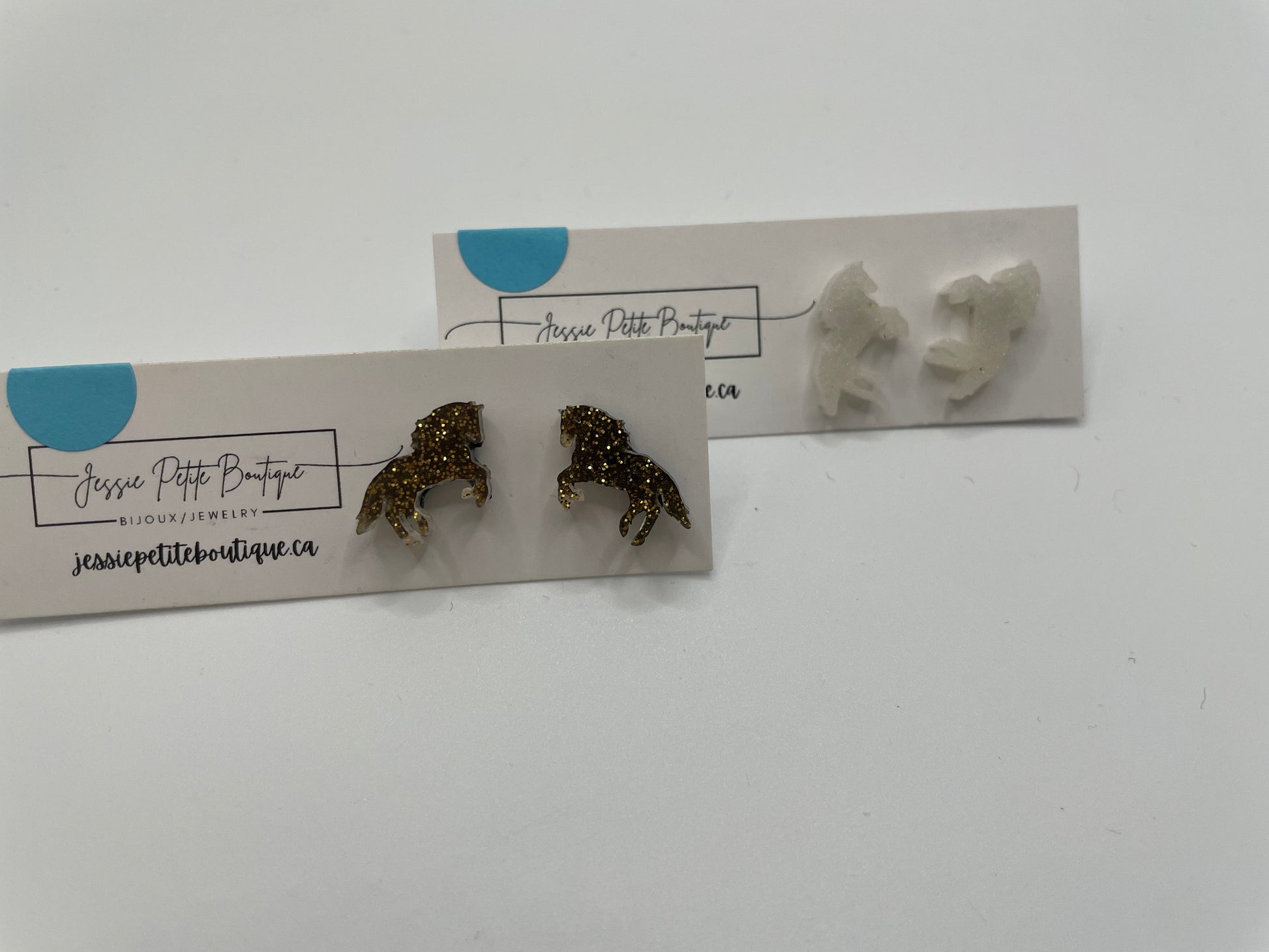 Elegant and full of charm, these handmade horse stud earrings capture a graceful silhouette in a lightweight, comfortable design. Made from resin mixed with mica powder and fine glitter, they shimmer beautifully under the light. Available in two stunning colors — sparkling gold or shimmering white — these nickel-free studs are perfect for everyday wear or as a unique gift for horse lovers.