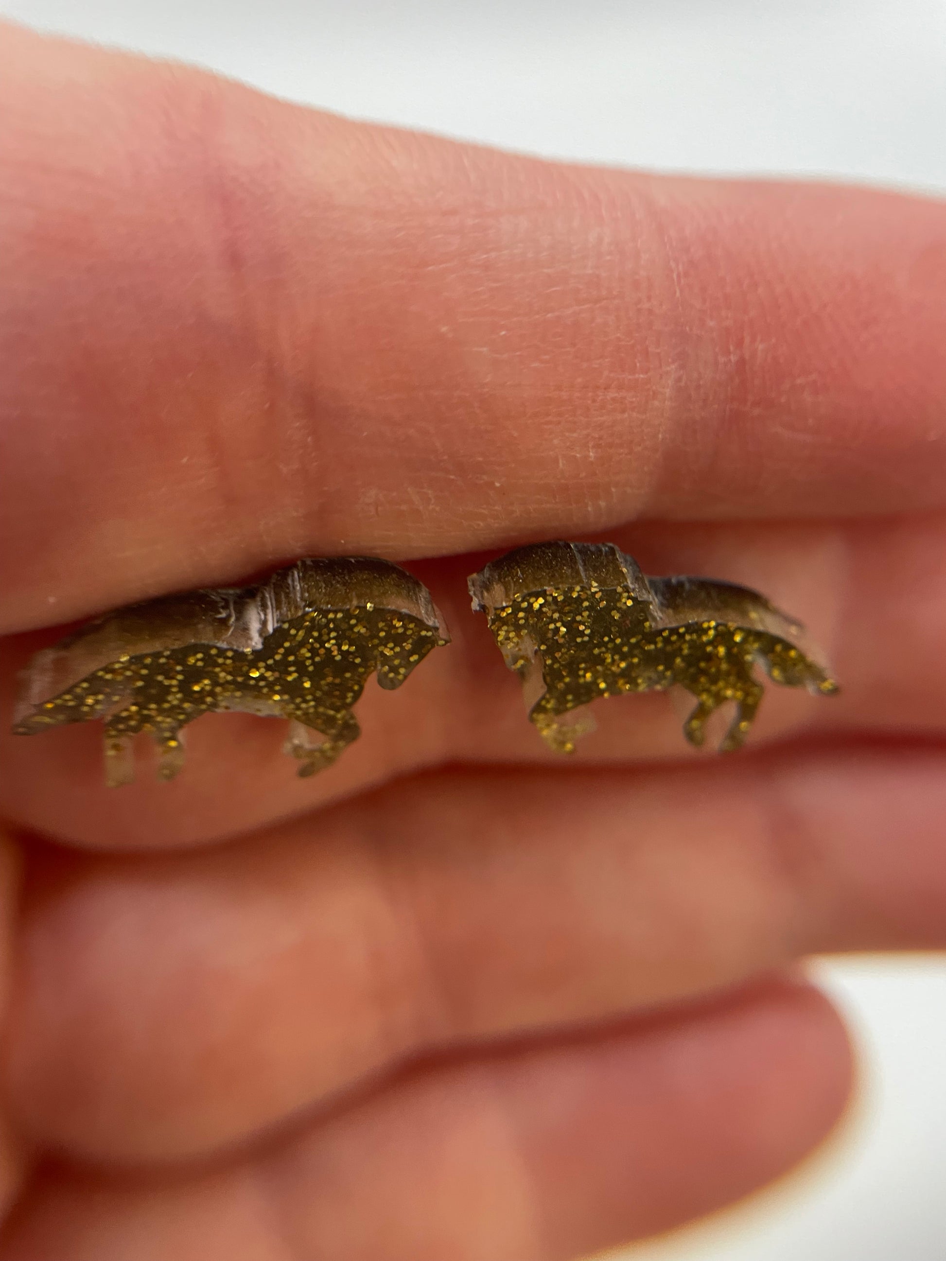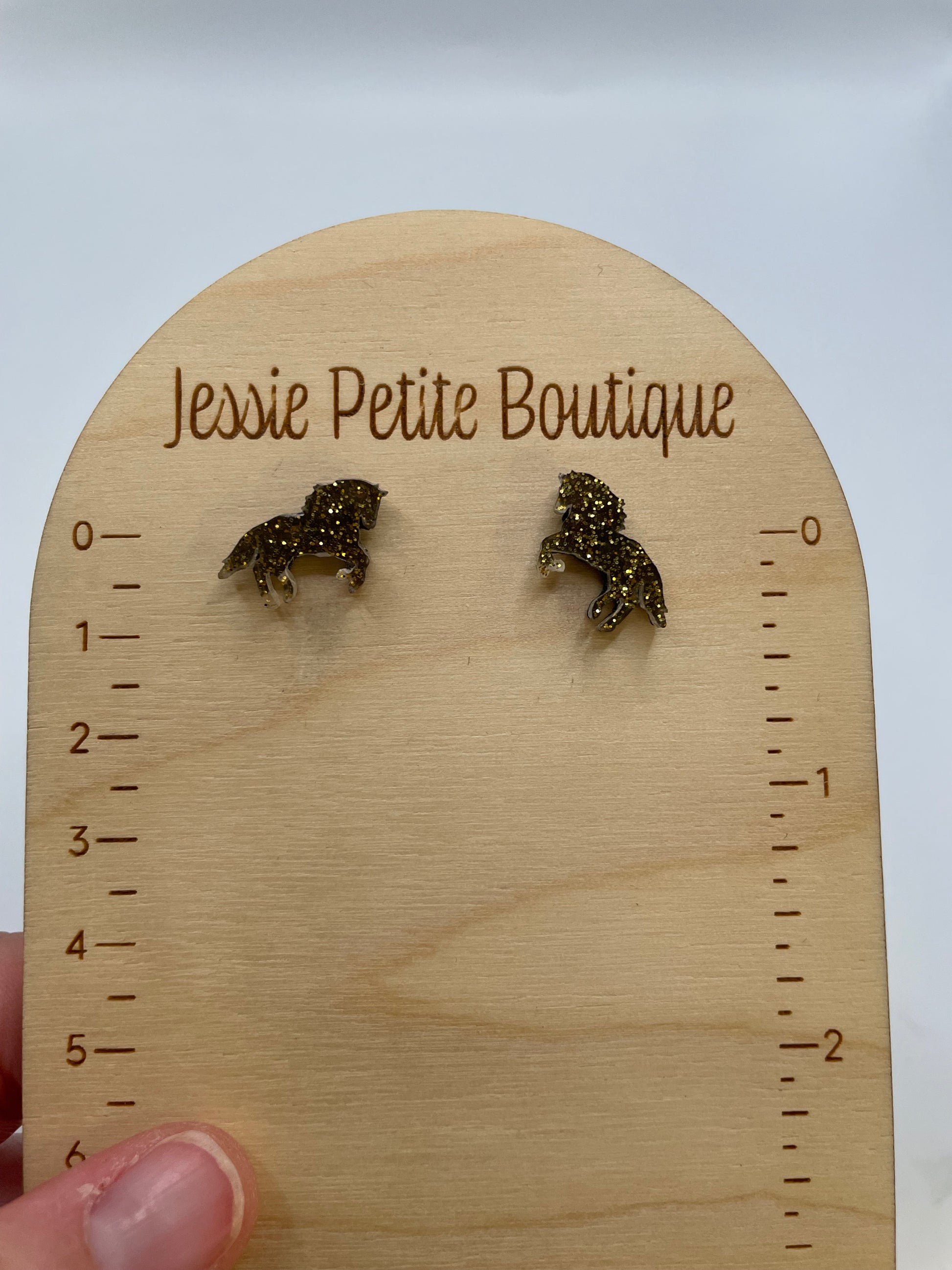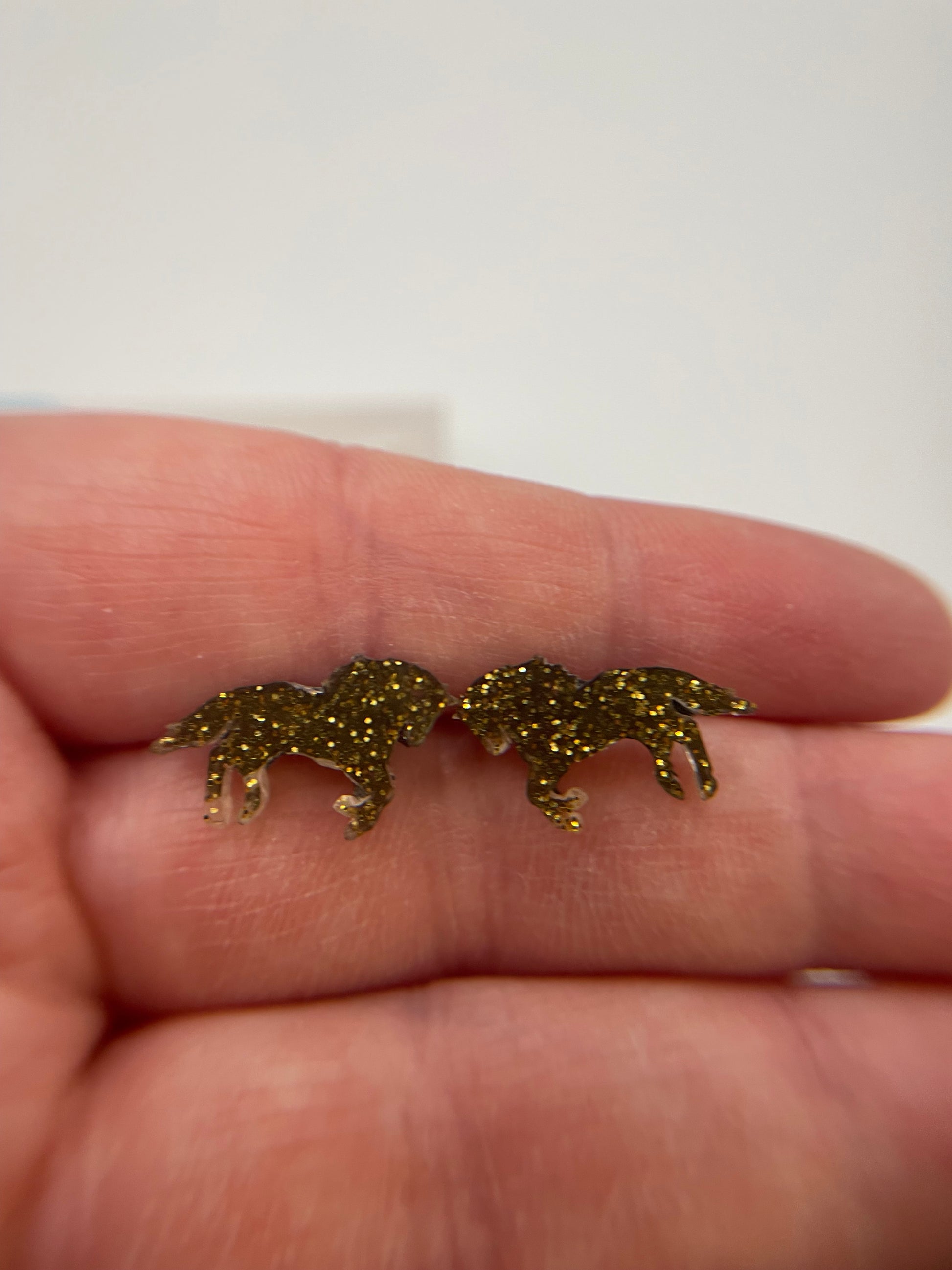 Elegant and full of charm, these handmade horse stud earrings capture a graceful silhouette in a lightweight, comfortable design. Made from resin mixed with mica powder and fine glitter, they shimmer beautifully under the light. Available in two stunning colors — sparkling gold or shimmering white — these nickel-free studs are perfect for everyday wear or as a unique gift for horse lovers.
