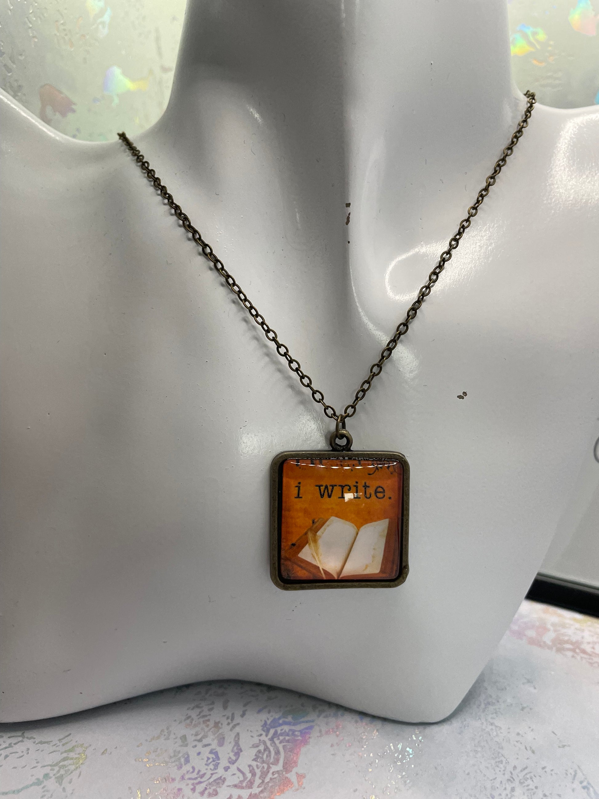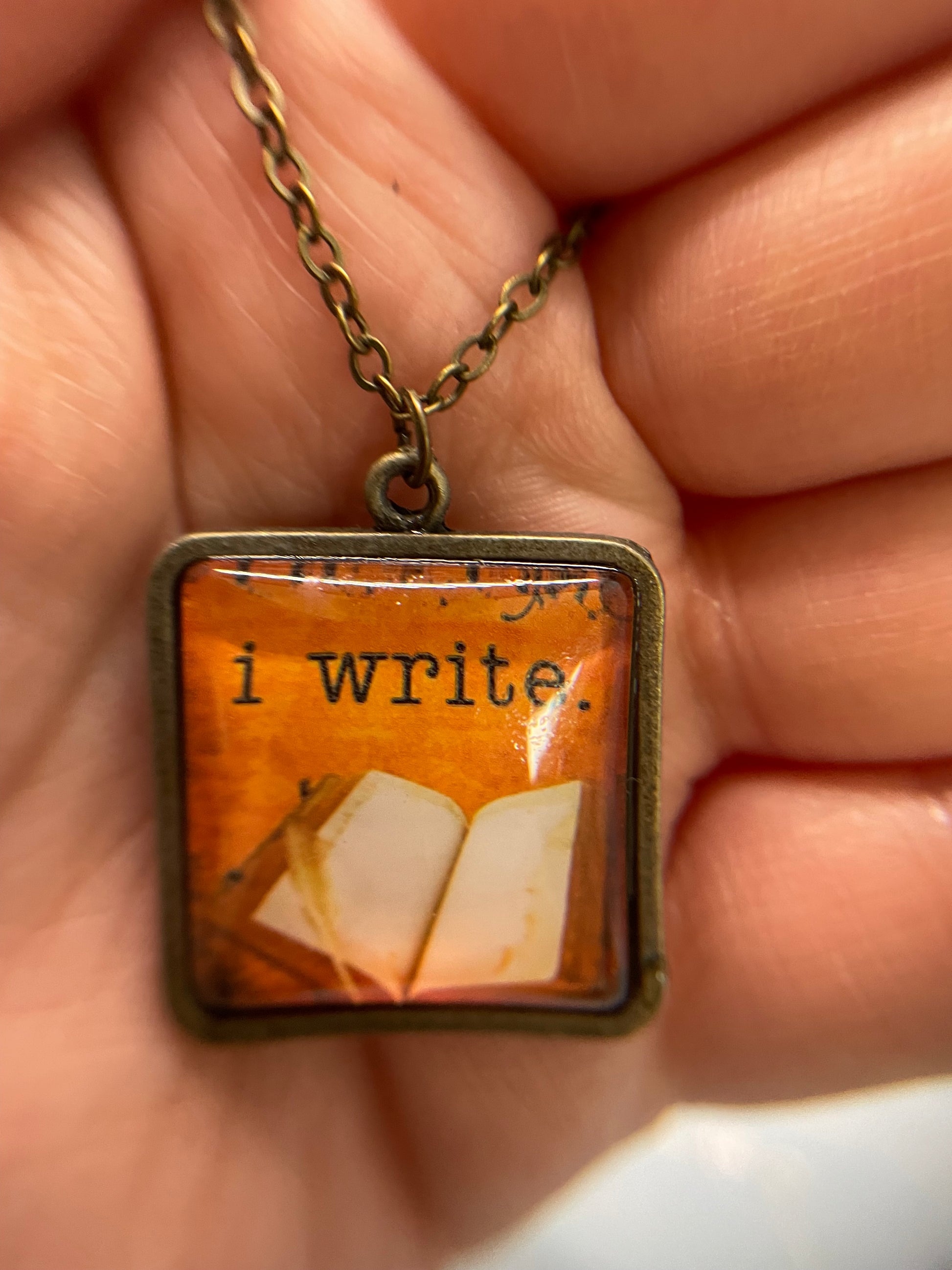 This "I Write" pendant necklace is a beautiful expression of creativity and passion for the written word. Suspended on a 21.5-inch bronze chain, the pendant measures 2.9 cm by 2.9 cm, forming a perfect square with a warm orange and bronze colour palette that complements its vintage-inspired design. The pendant is crafted with paper, and a glass cabochon, all set in a durable bronze frame and hold together with resin.