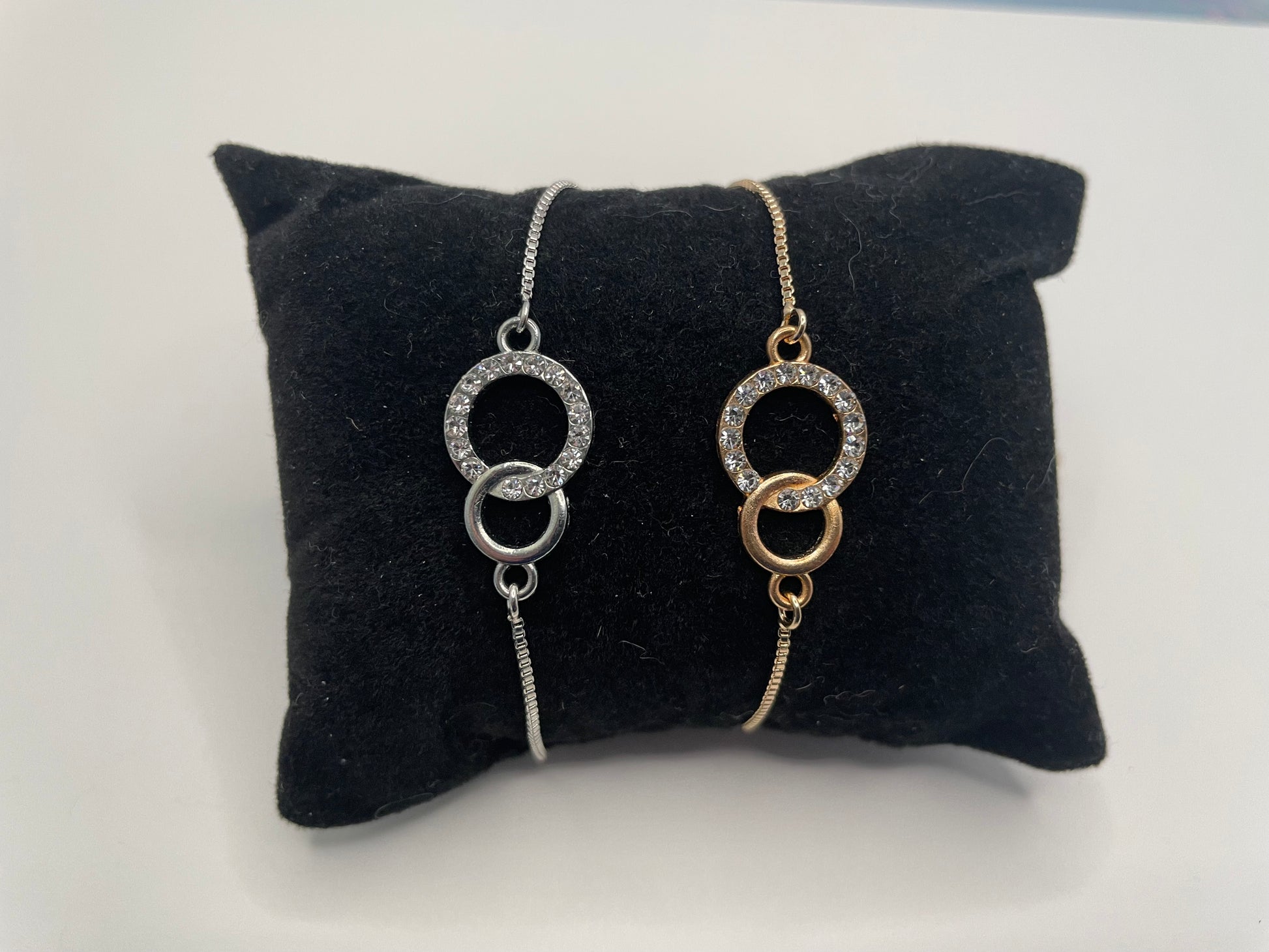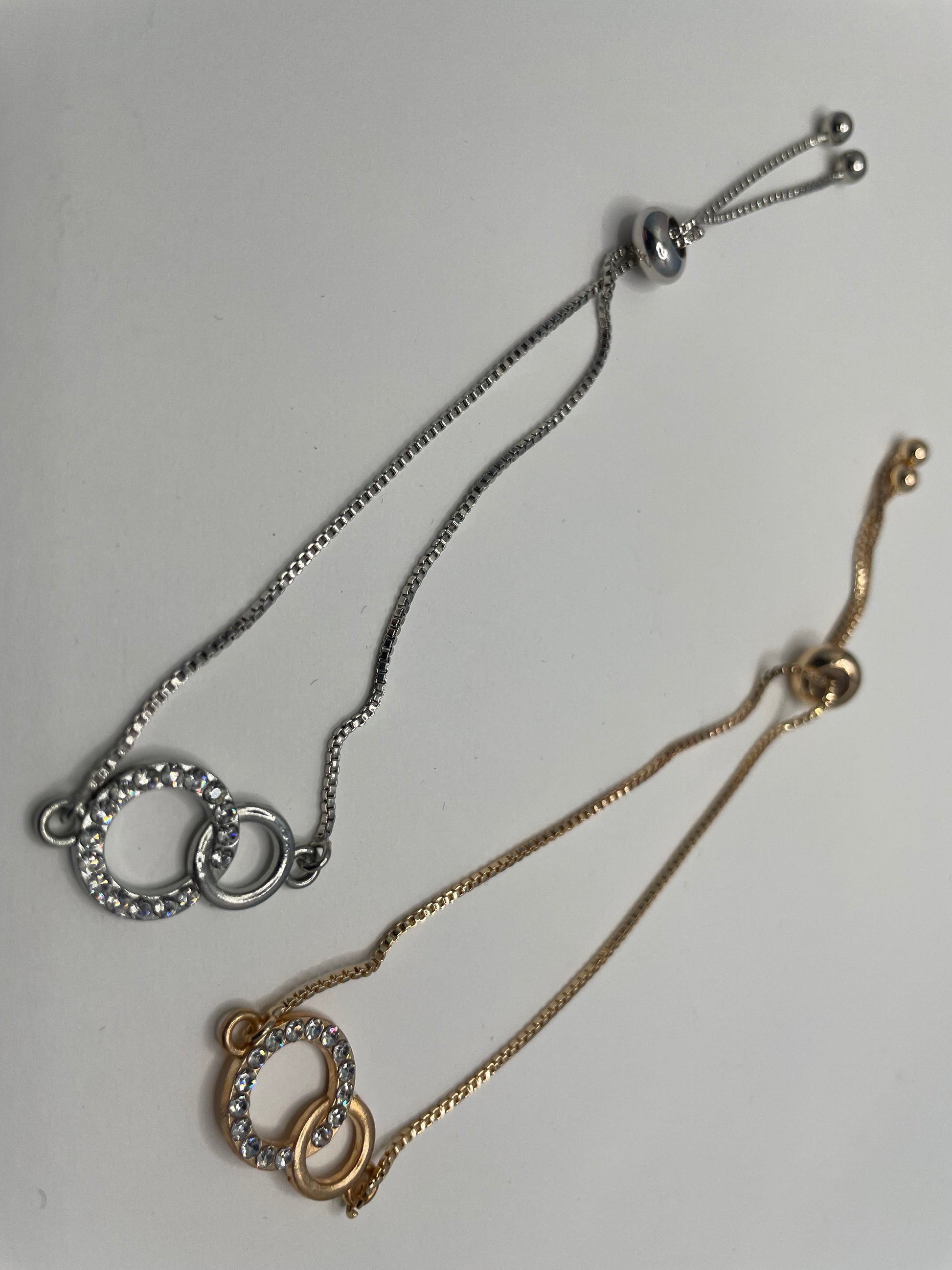 This delicate adjustable bracelet features two interlinked circular charms accented with sparkling zirconia, creating a refined and modern look. Available in silver or gold tone, the sleek design is crafted from stainless steel, offering both durability and everyday elegance.