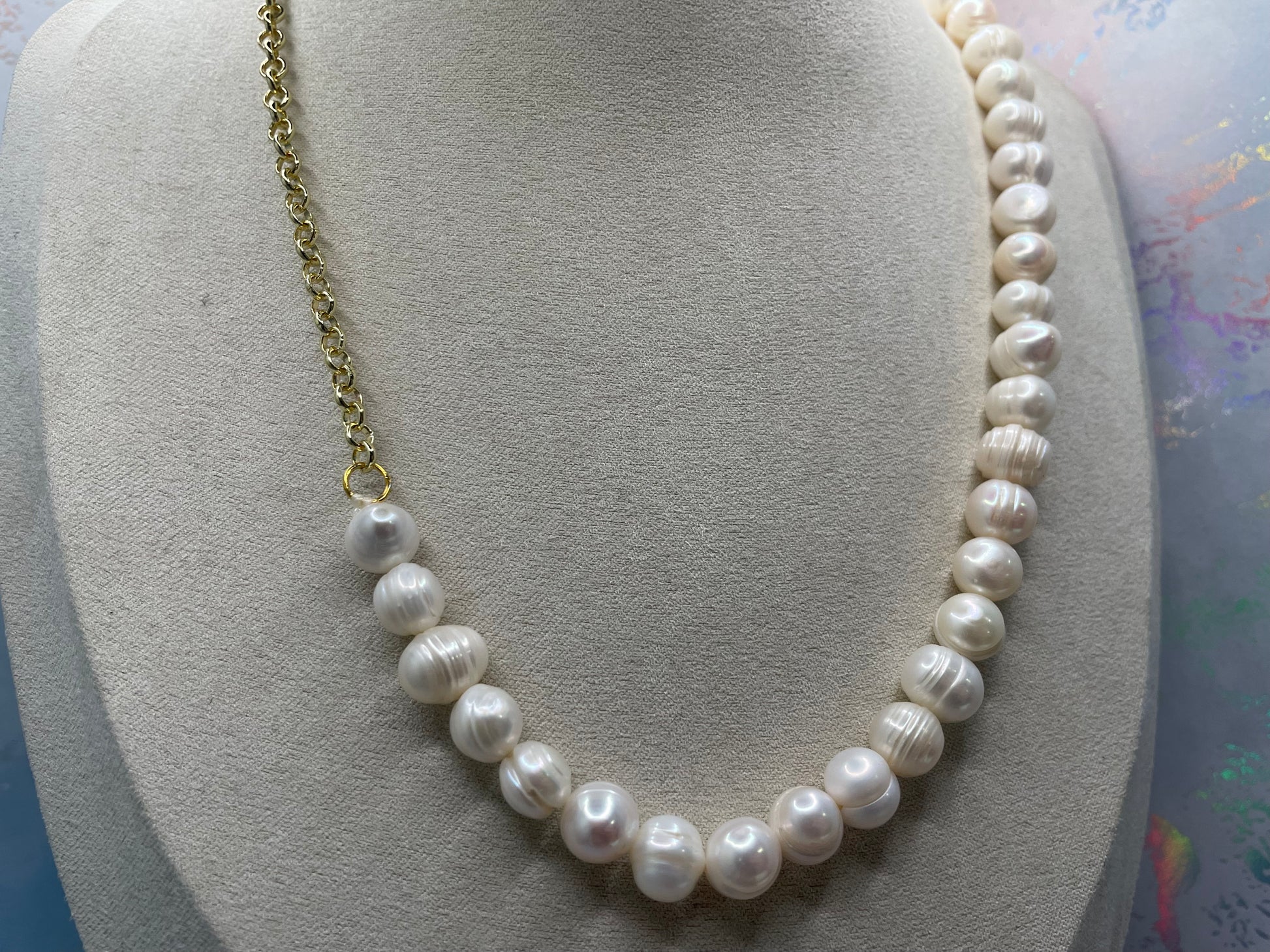 This elegant Pearl Necklace features beautiful irregular freshwater-style pearls delicately paired with a gold-tone cable chain. The asymmetrical design highlights the natural charm of each pearl, making every necklace truly unique.