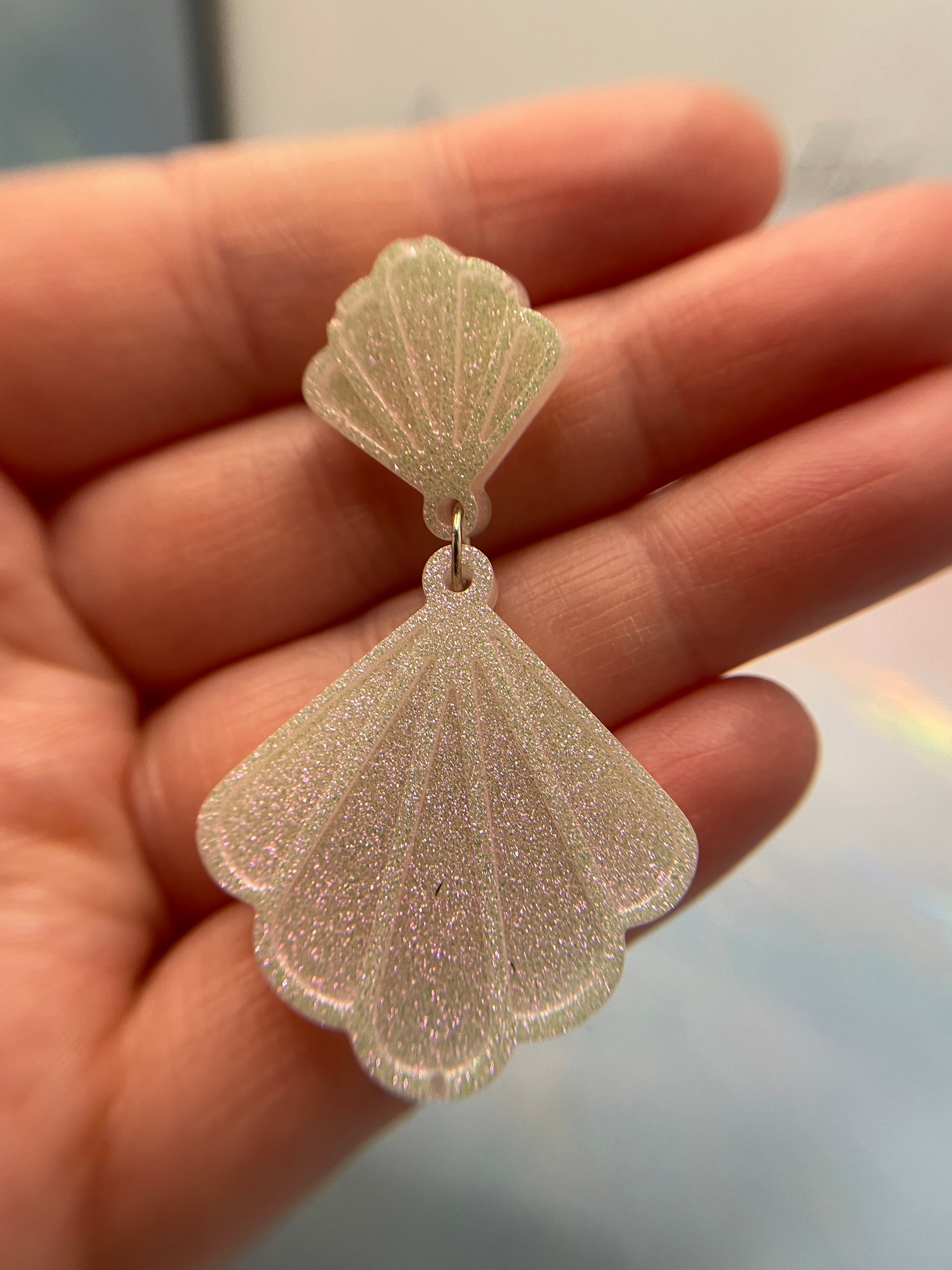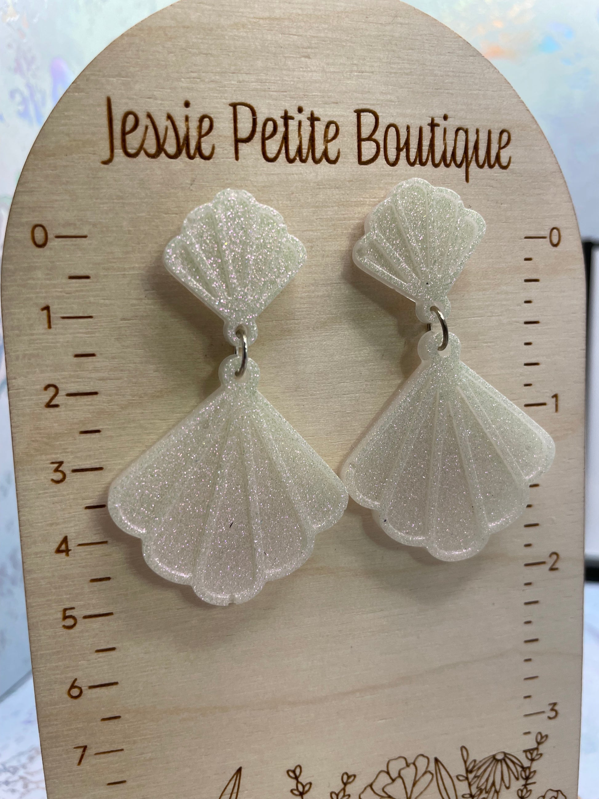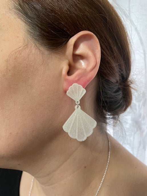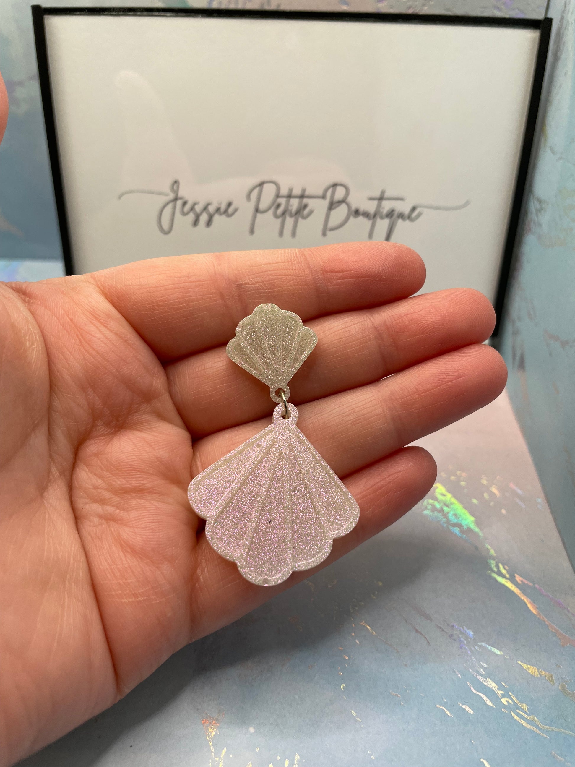 Elevate your style with these Sparkly White Kalita Earrings. Designed in an elegant clam shape, these earrings shimmer beautifully with their sparkly white finish, crafted from resin, mica powder, and glitter for a dazzling effect. The hypoallergenic plastic stud and butterfly closure ensure a secure and comfortable fit, making these earrings perfect for sensitive ears. Lightweight and durable, they offer effortless wear for any occasion.