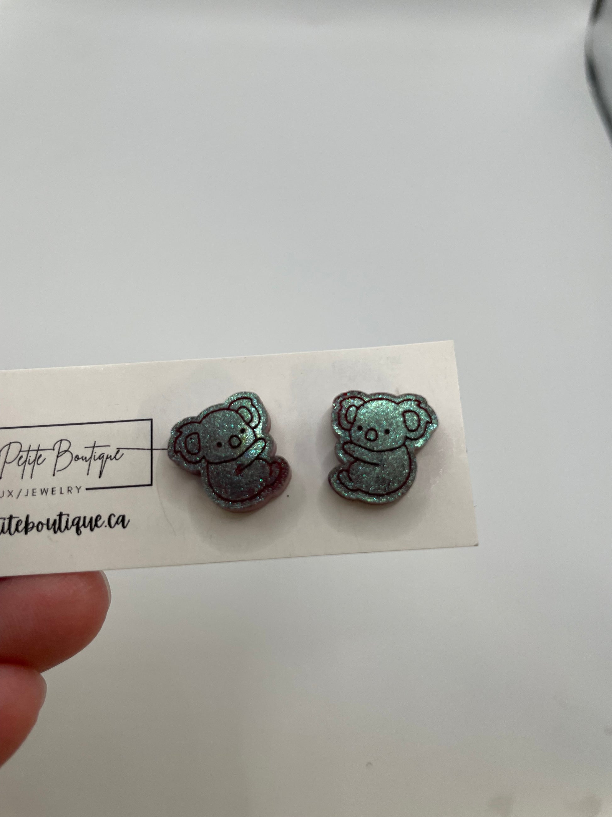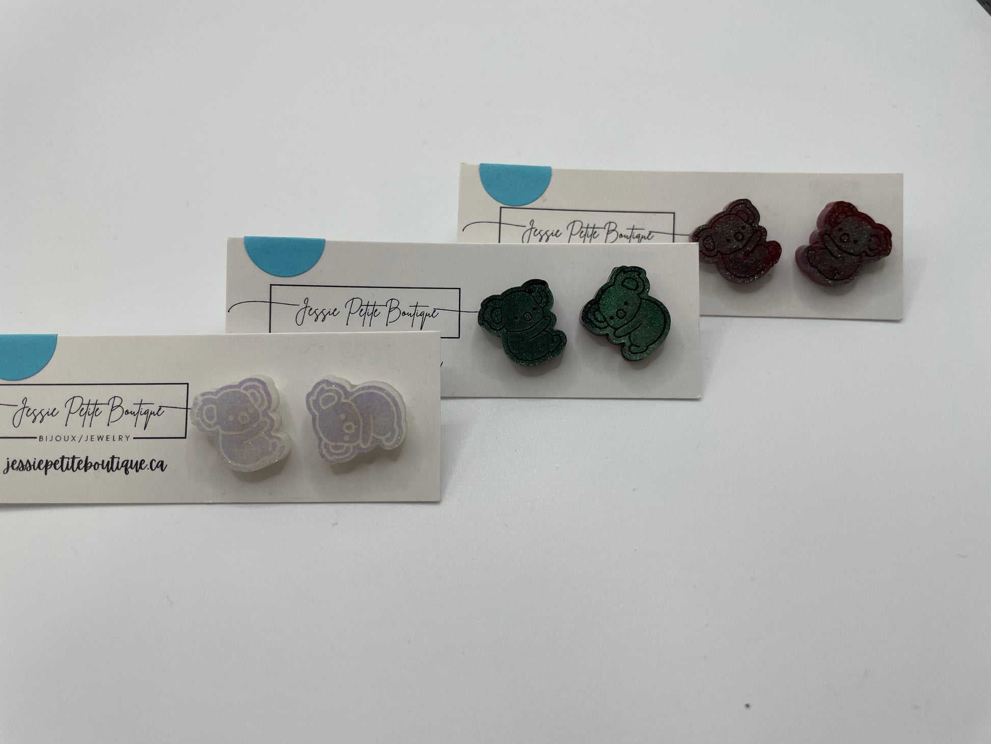 Adorable and full of personality, these handmade koala stud earrings add a playful touch to any outfit. Made from resin with shimmering mica powder, they shift color beautifully under the light thanks to their chameleon finish. Lightweight and nickel-free, they’re gentle on sensitive ears and perfect for daily wear. Available in three captivating color options — white, green, and plum.