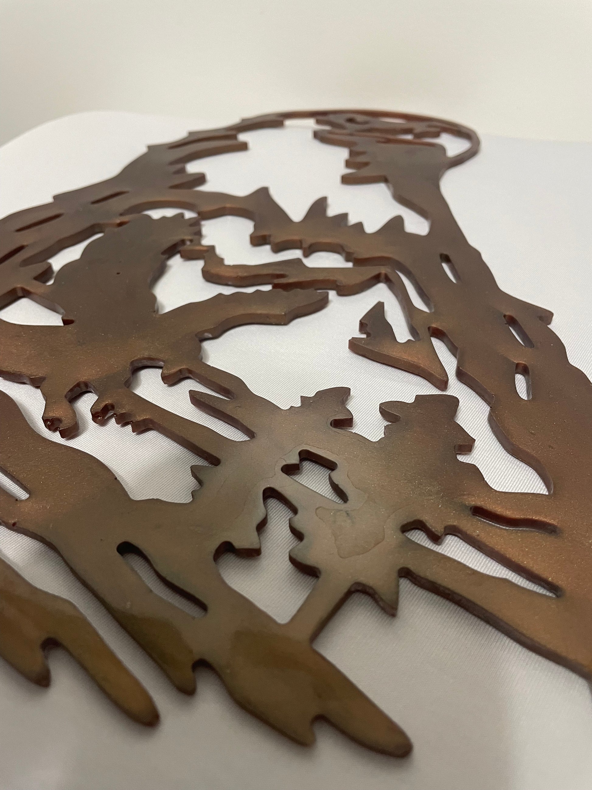 Handcrafted from resin mixed with mica powder, this piece captures a detailed silhouette of an eagle overlooking a mountain landscape. Its earthy tones and smooth finish add depth and texture, making it a perfect accent for rustic, cabin, or nature-inspired décor.
