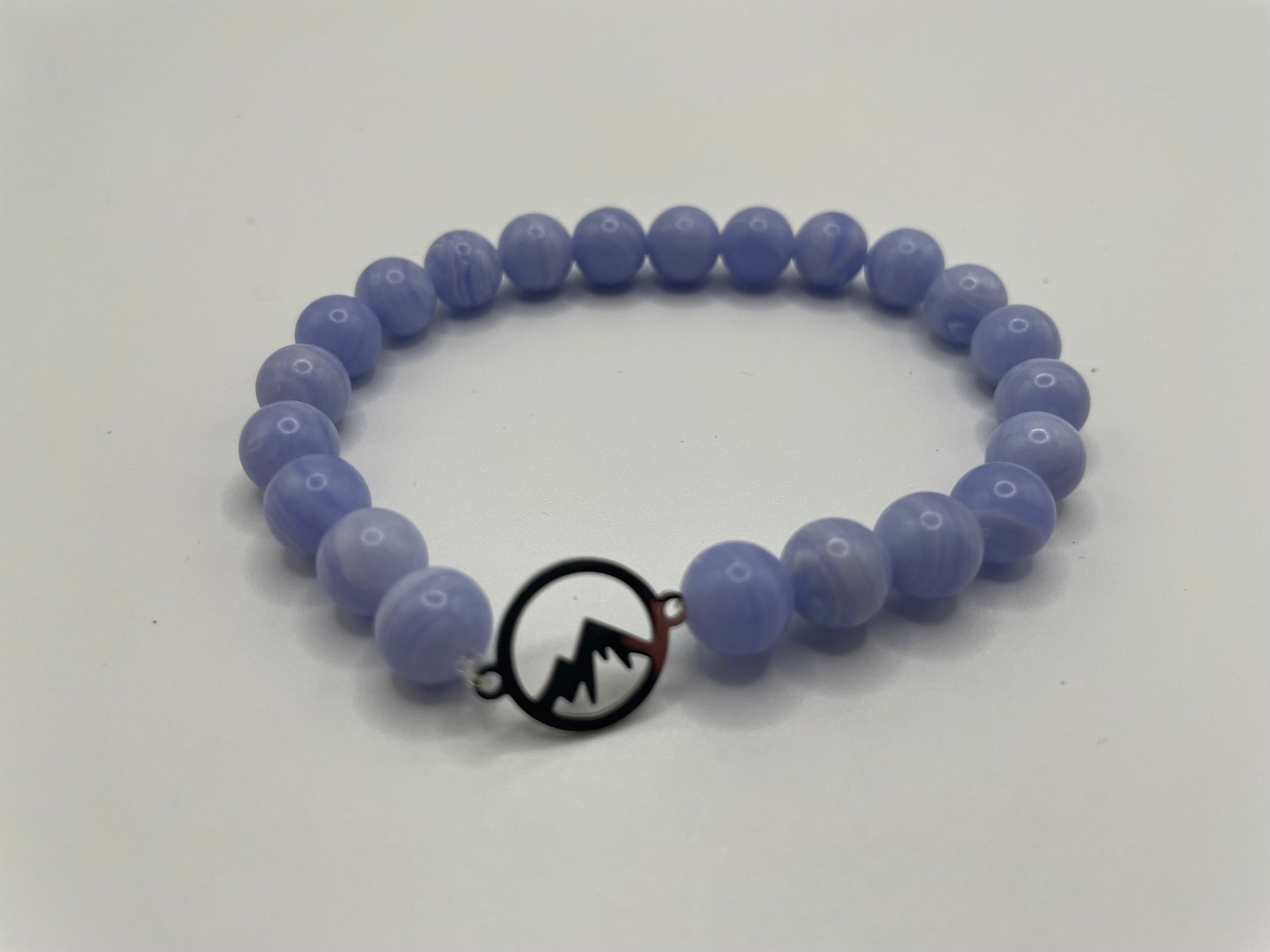 Elegant and modern, this bracelet features 0.8 cm lavender-hued round beads paired with a sleek stainless steel charm showcasing a mountain silhouette. Its soothing tones and minimalist design make it a refined accessory for everyday wear or as part of a layered look.