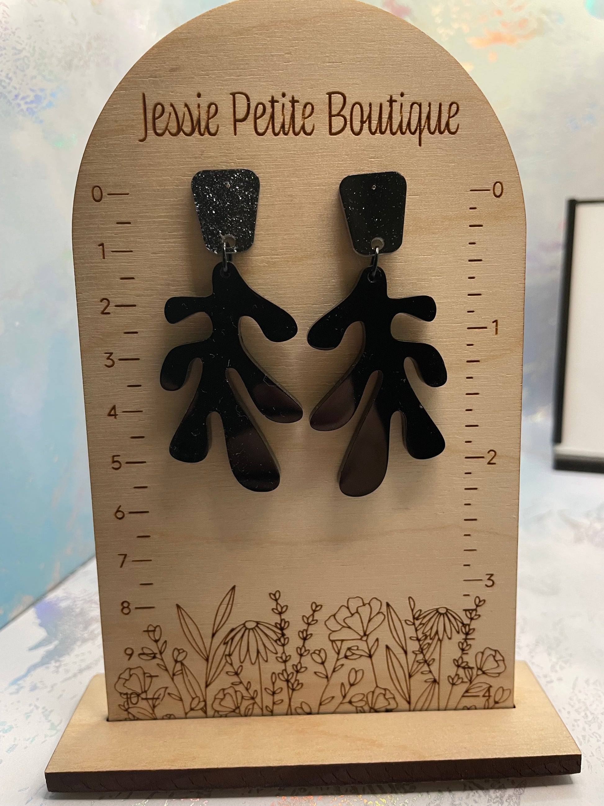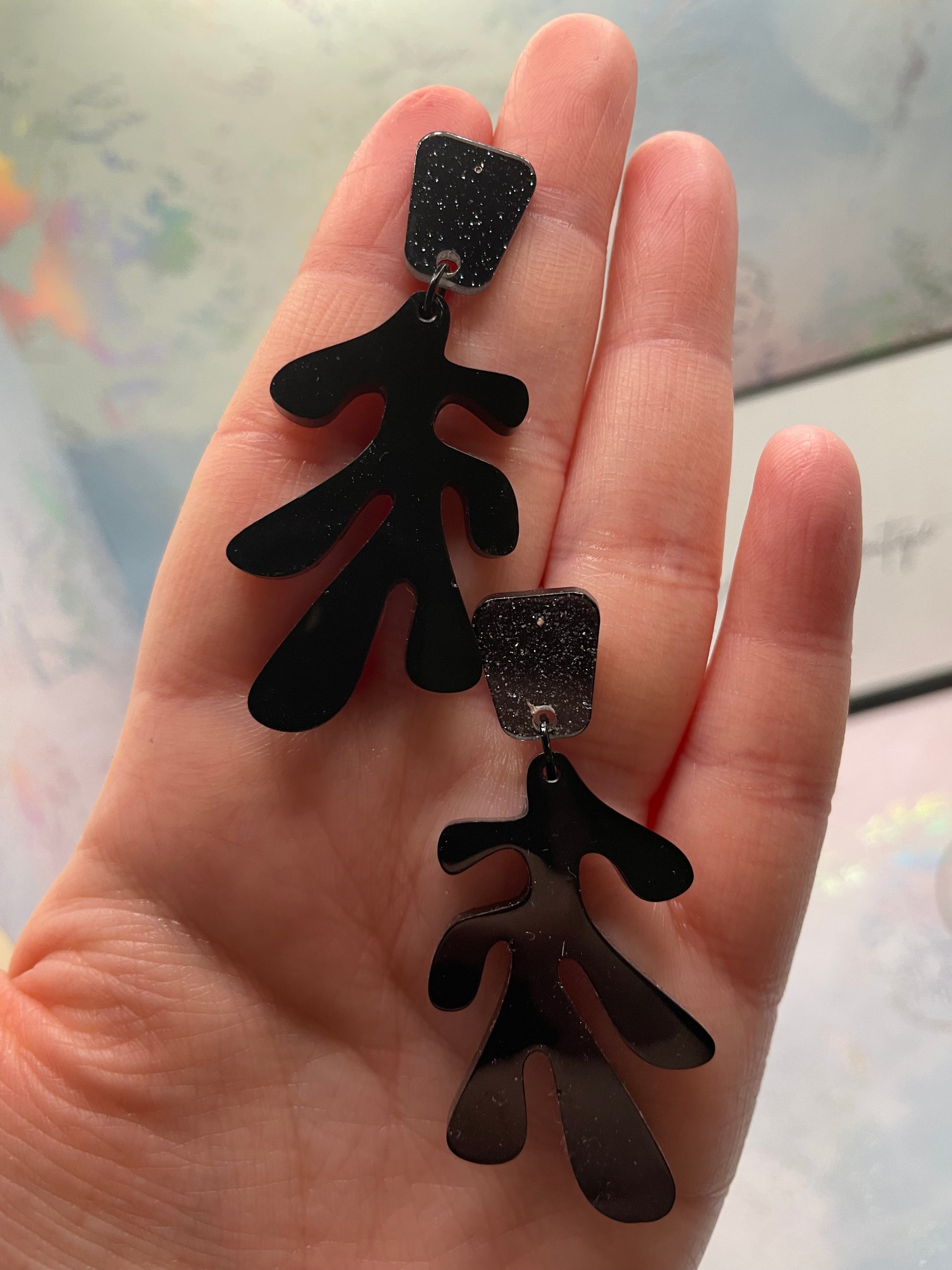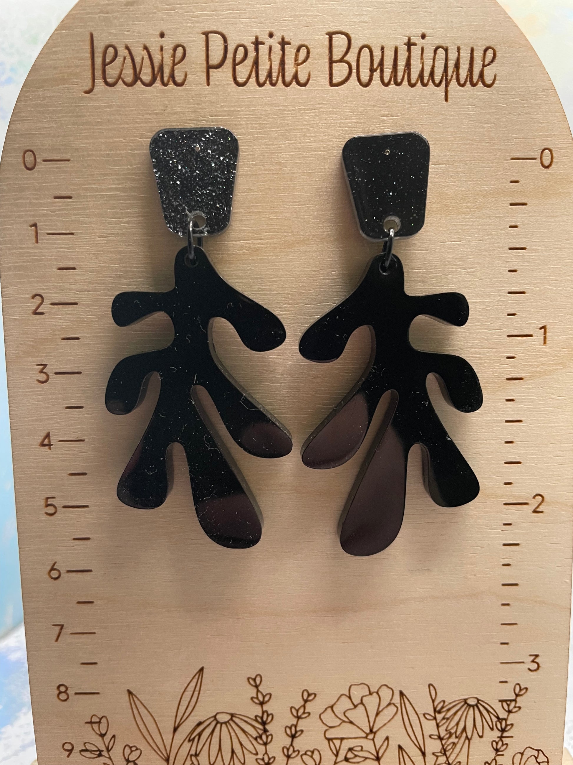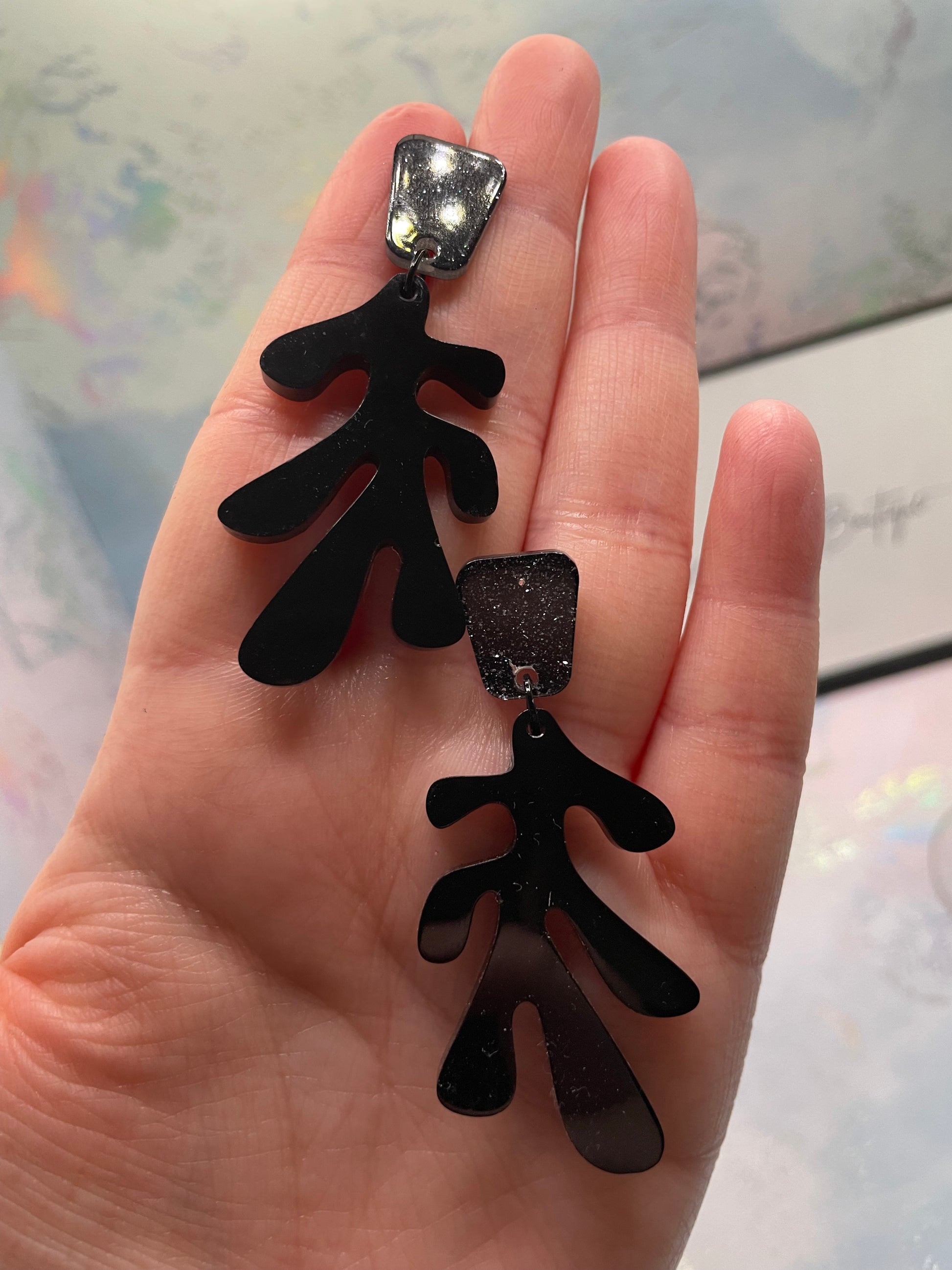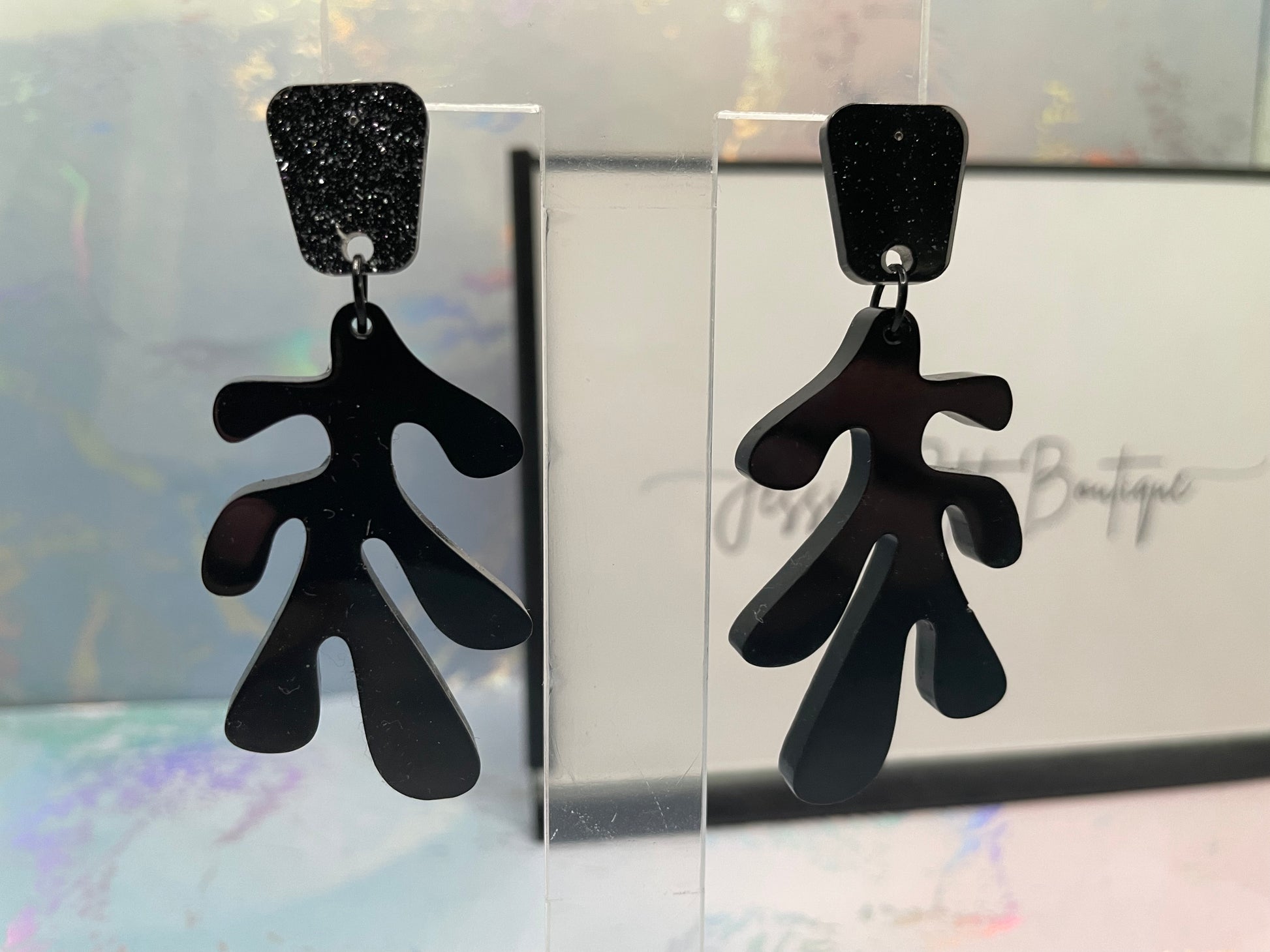 Elevate your style with our "Lea" earrings, a perfect blend of classic elegance and modern design. These captivating earrings feature an organic plant shape in a black colour, complemented by a sparkly black stud, for a touch of classic and timeless touch.