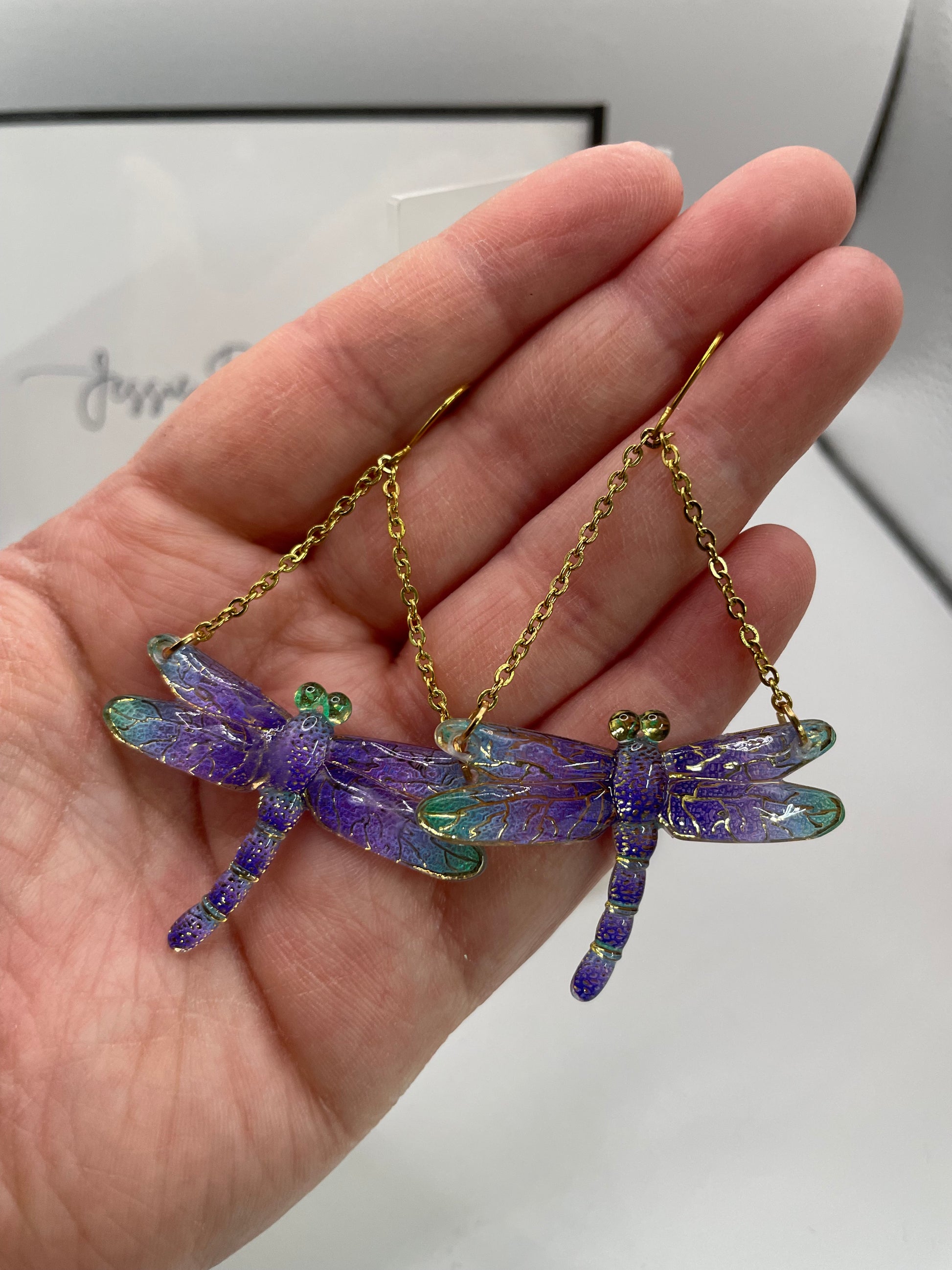 Each dragonfly shimmers with violet tones, delicate blue accents, and golden details, capturing the magic of warm-weather evenings and nature’s lightness. Whether you’re dressing up for a garden party or adding a standout piece to your everyday outfit, this set will make you feel radiant and unique.