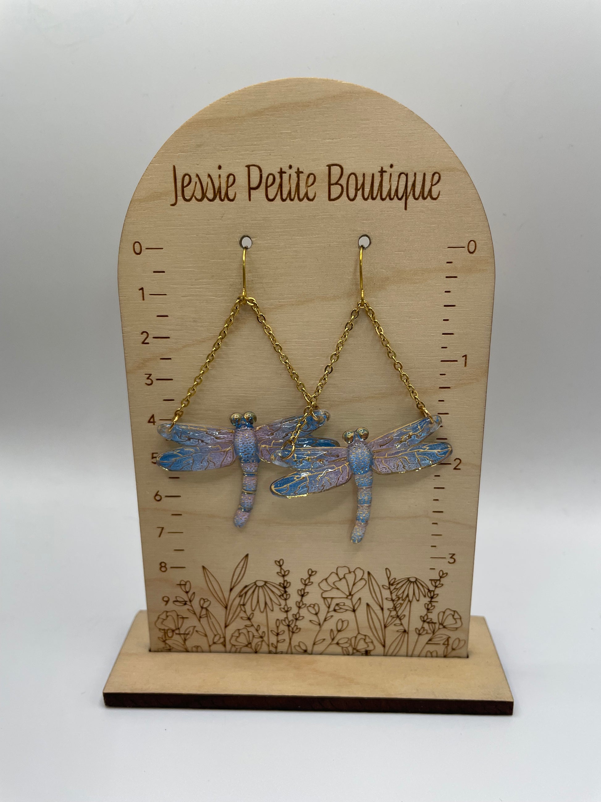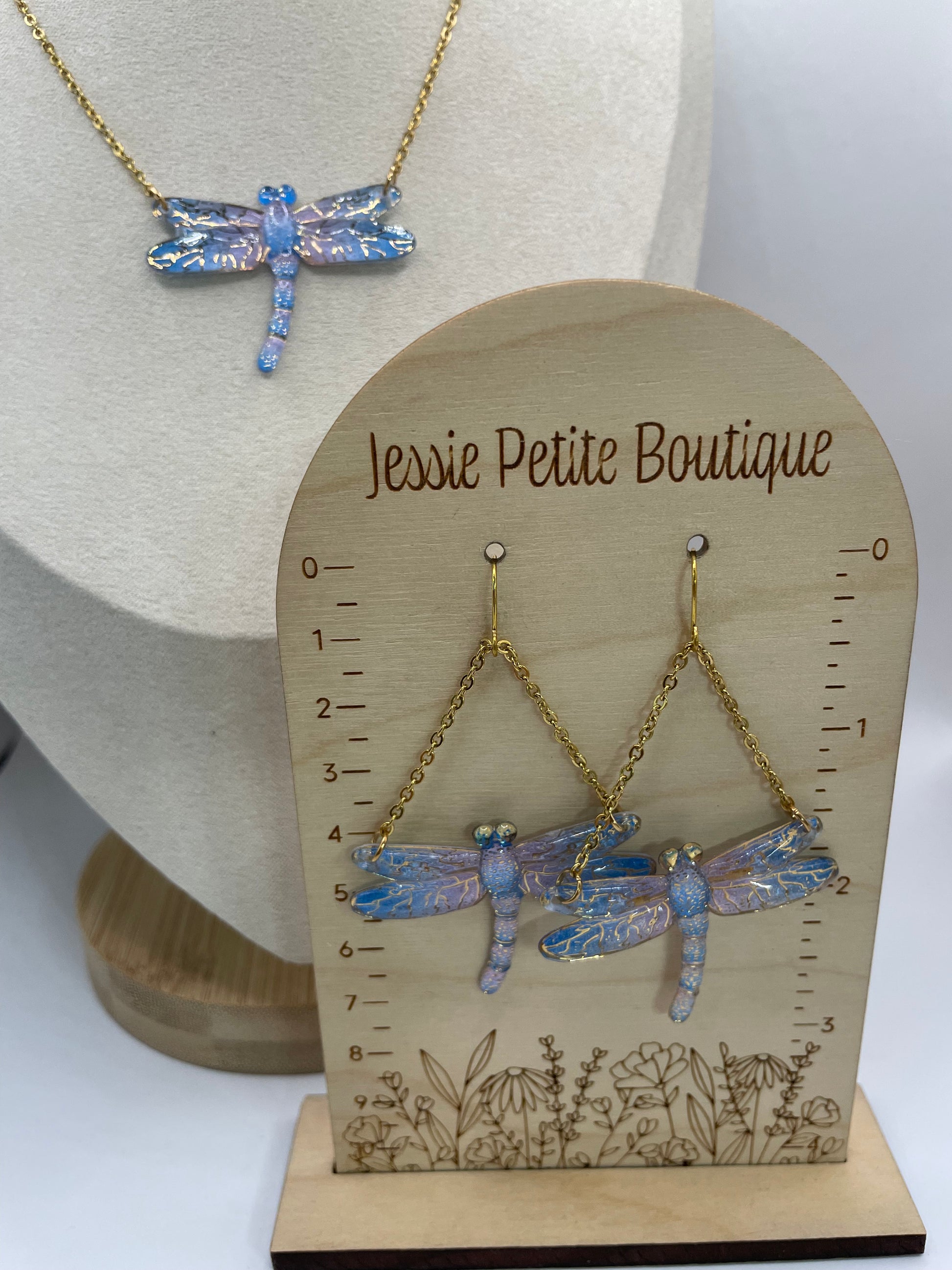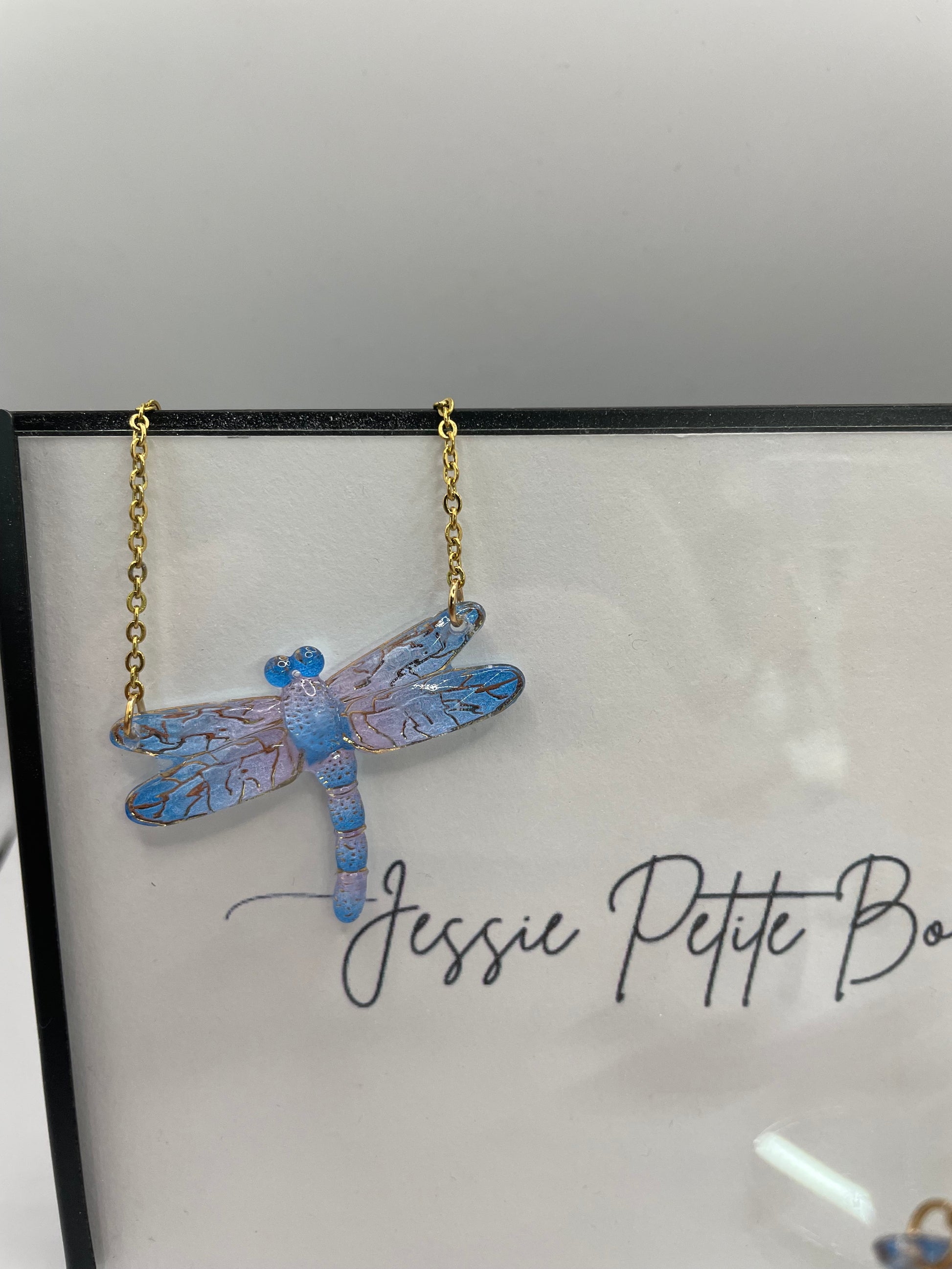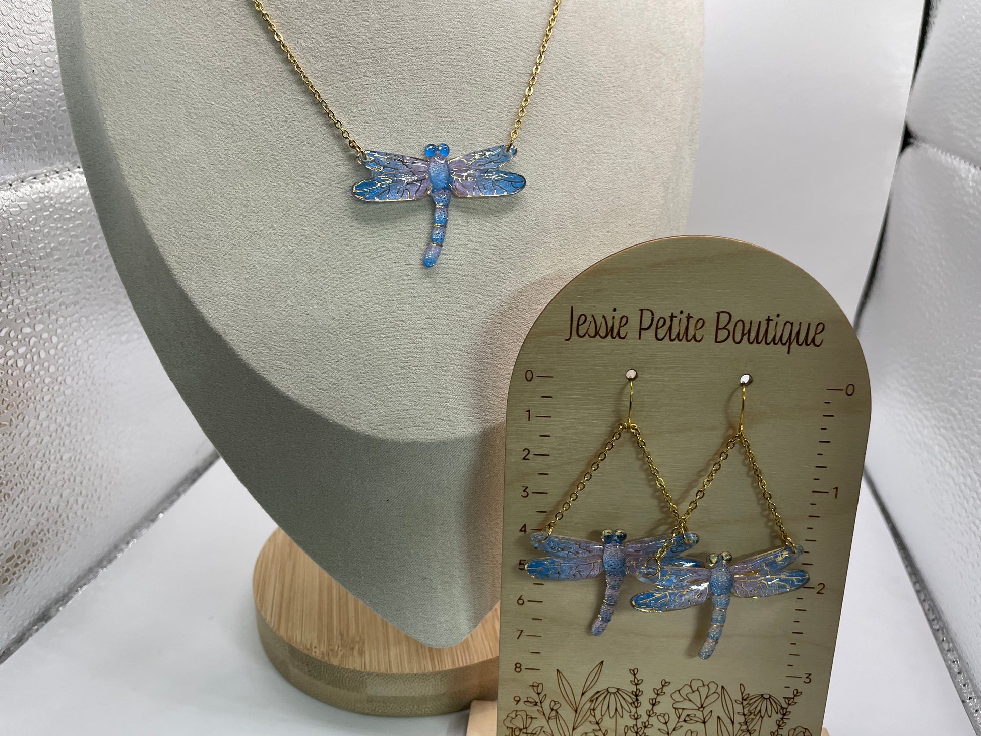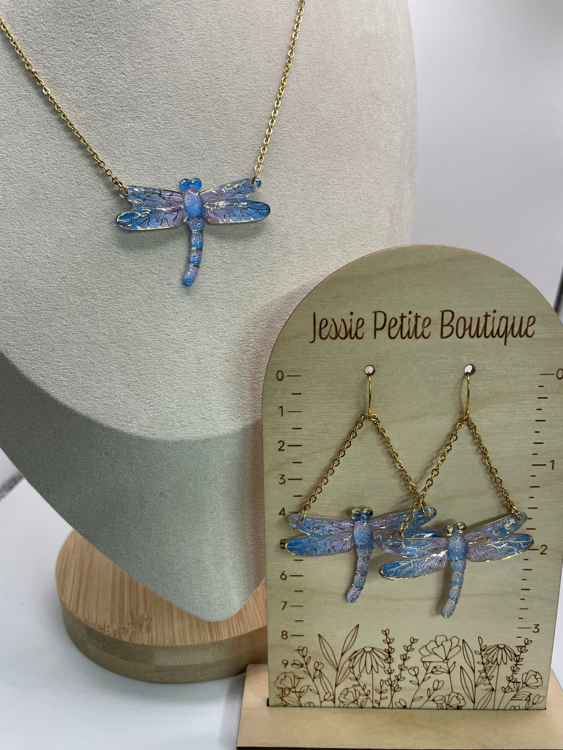 Add a touch of whimsy and elegance to your summer look with this one-of-a-kind dragonfly jewelry set from Jessie Petite Boutique. Featuring a matching necklace and earrings, this exclusive blue set is the only one of its kind – part of a limited edition crafted in three dreamy colour ways: purple, yellow, and blue.