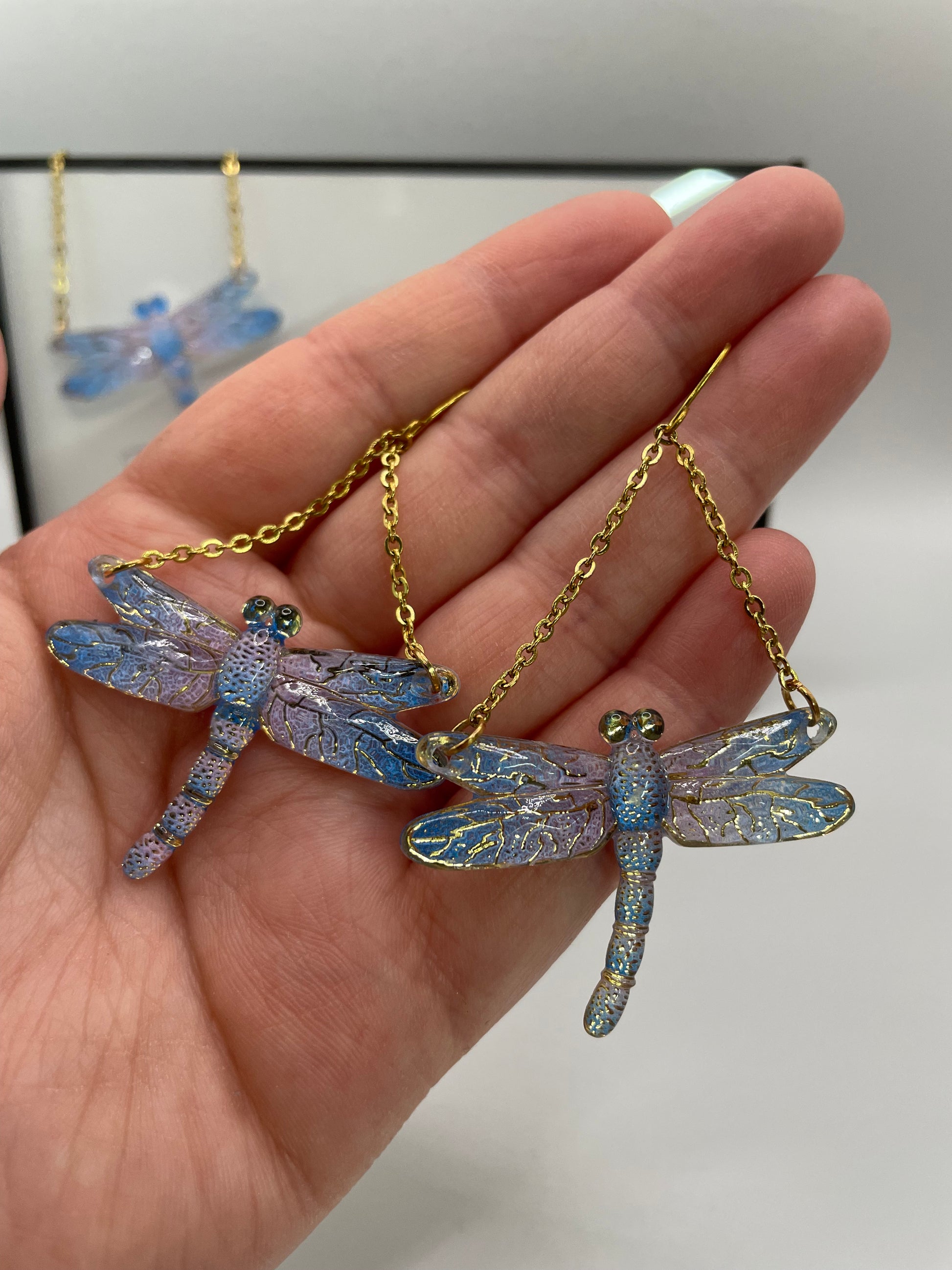 Each dragonfly shimmers with blue tones and delicate golden details, capturing the magic of warm-weather evenings and nature’s lightness. Whether you’re dressing up for a garden party or adding a standout piece to your everyday outfit, this set will make you feel radiant and unique.