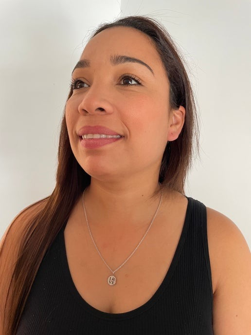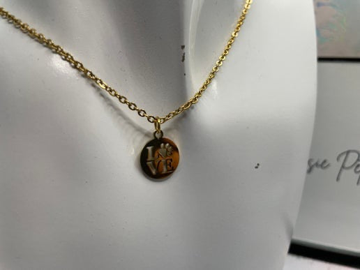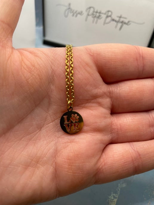 This minimalist necklace features a round tag pendant with "Love" written with a paw print design, perfect for animal lovers. The necklace is crafted from stainless steel and zinc alloy, ensuring durability and a nickel-free composition for sensitive skin.