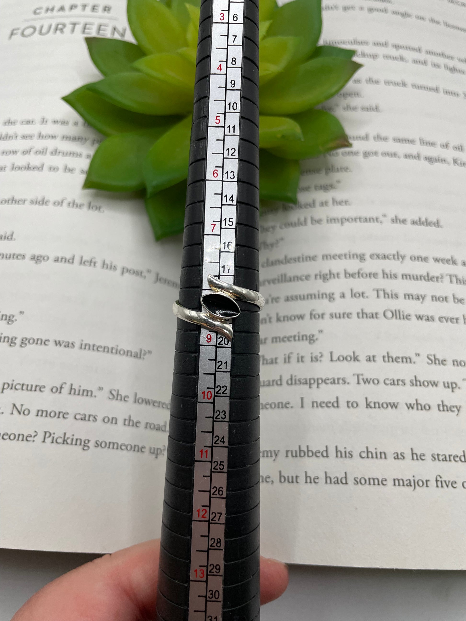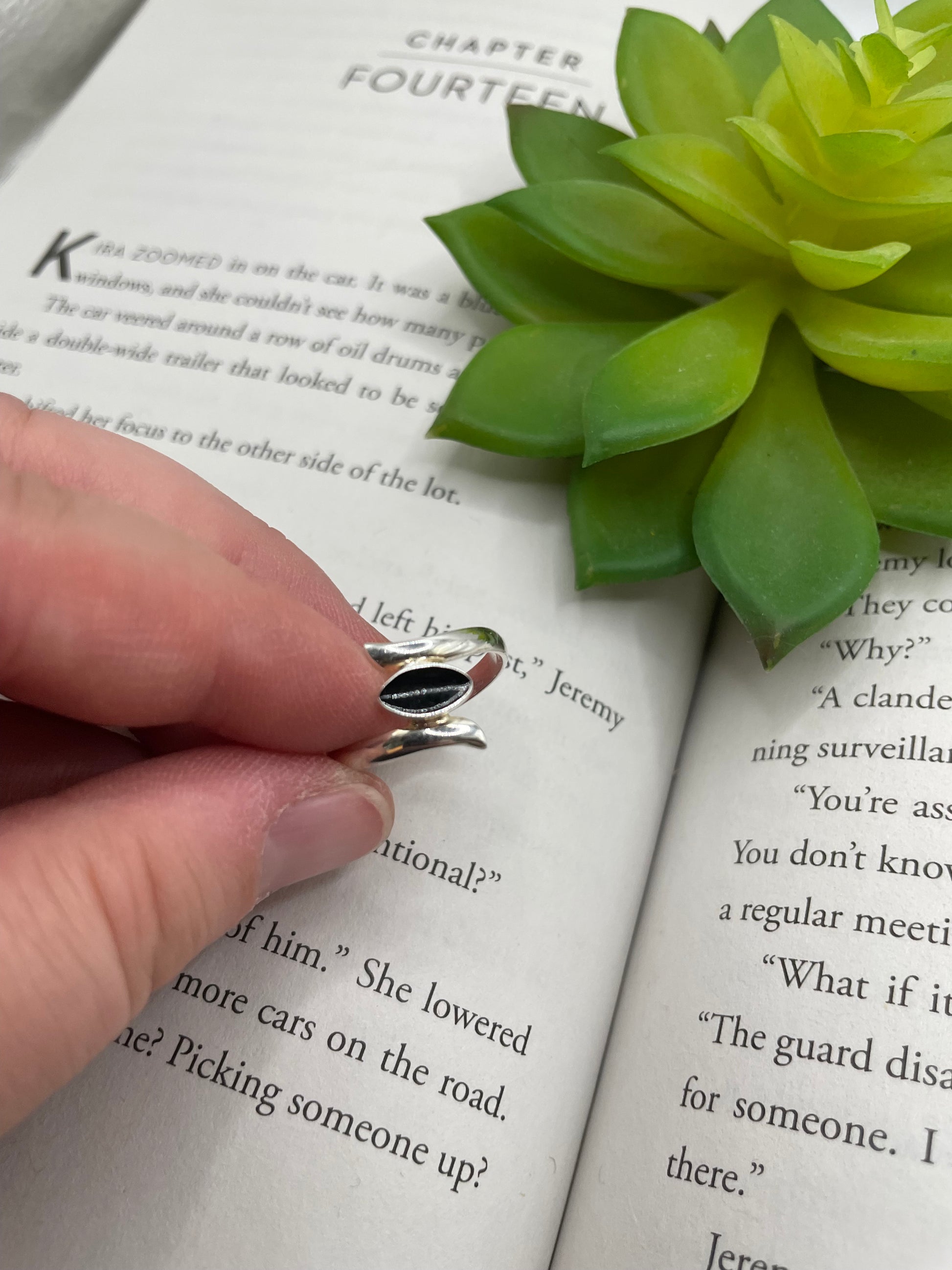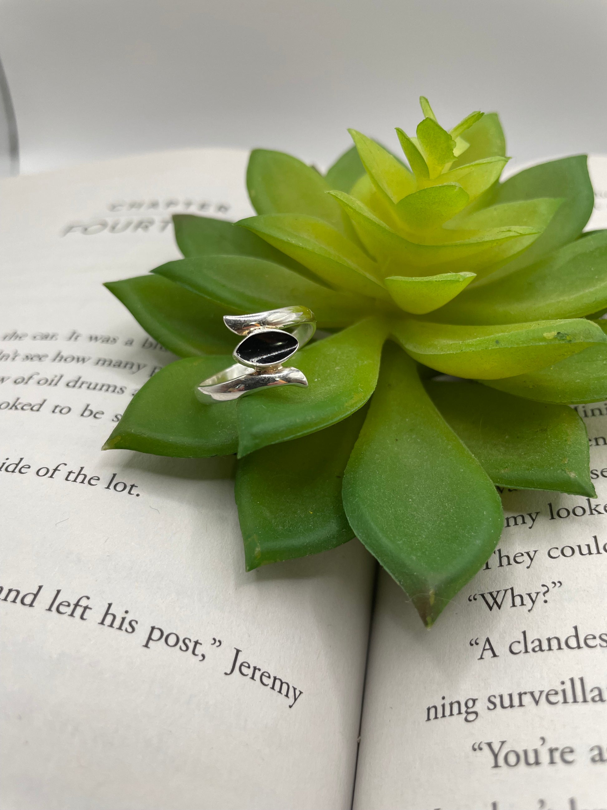 Sleek and contemporary, this handcrafted 925 sterling silver ring features an elegant marquise-shaped bezel filled with black resin and mica powder, creating a smooth, glossy finish with subtle shimmer.