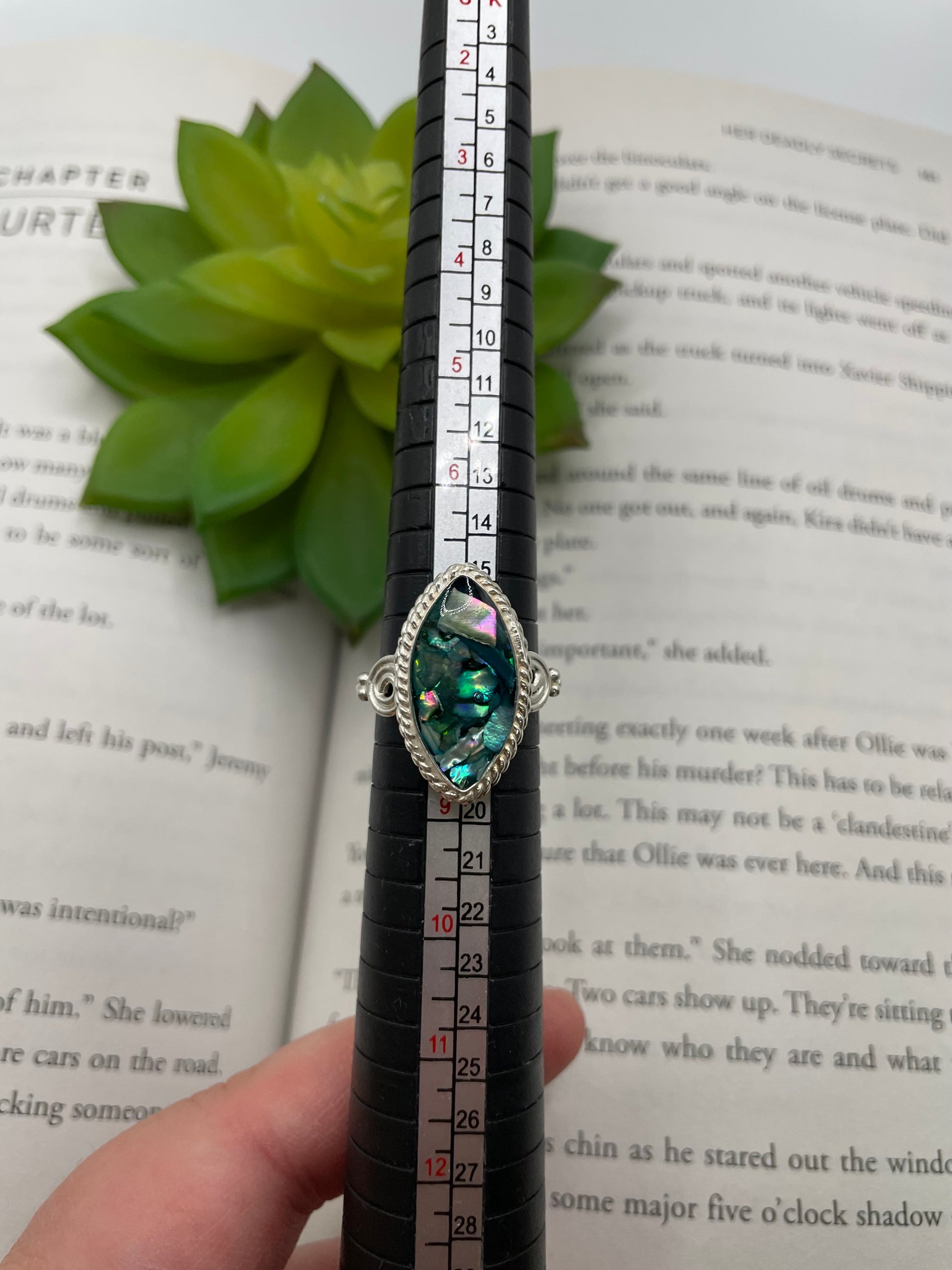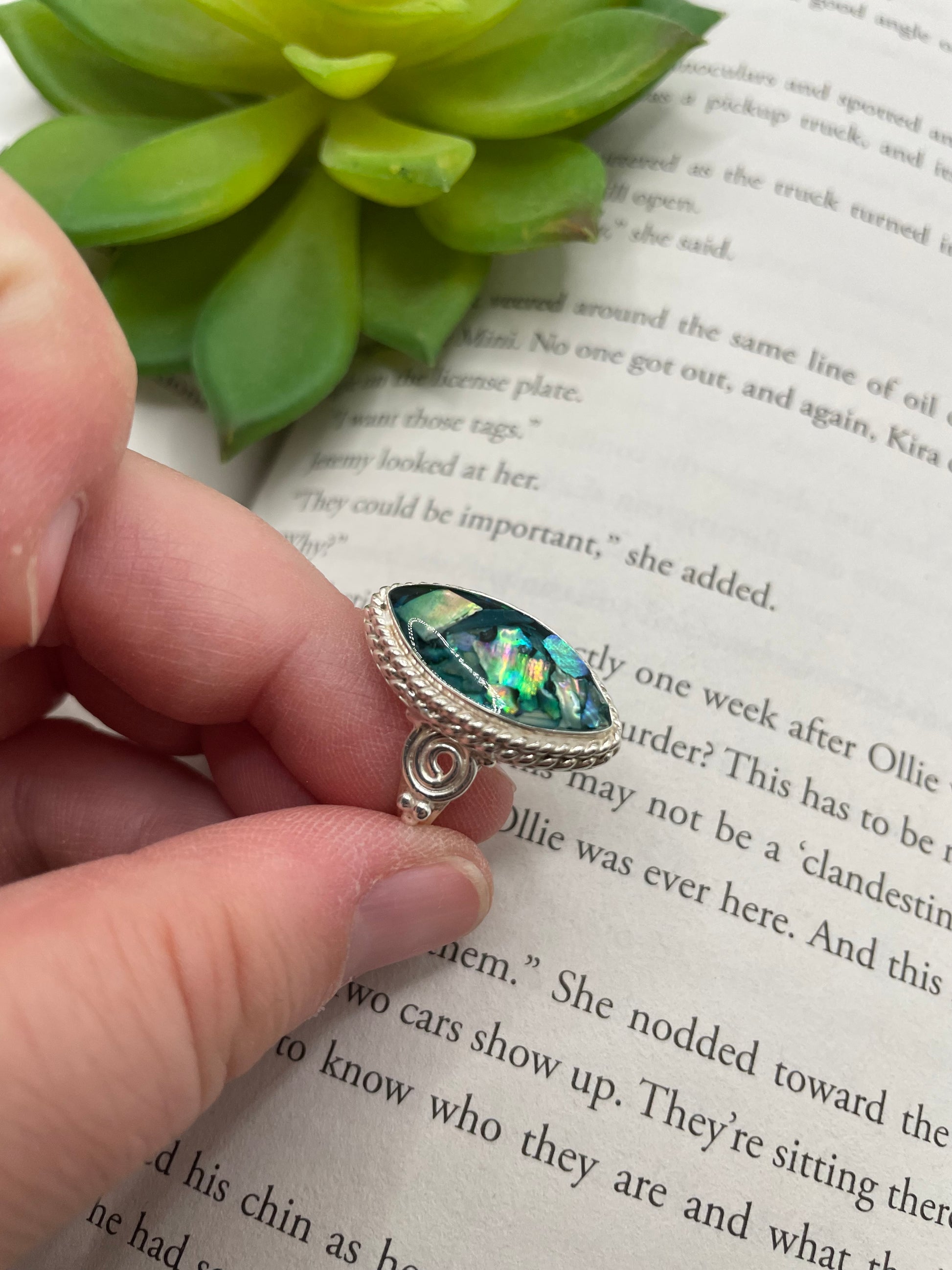 A statement of elegance and craftsmanship, this 925 sterling silver ring features an elongated marquise-shaped bezel (11×21 mm) showcasing a mesmerizing blue shell preserved in clear resin.