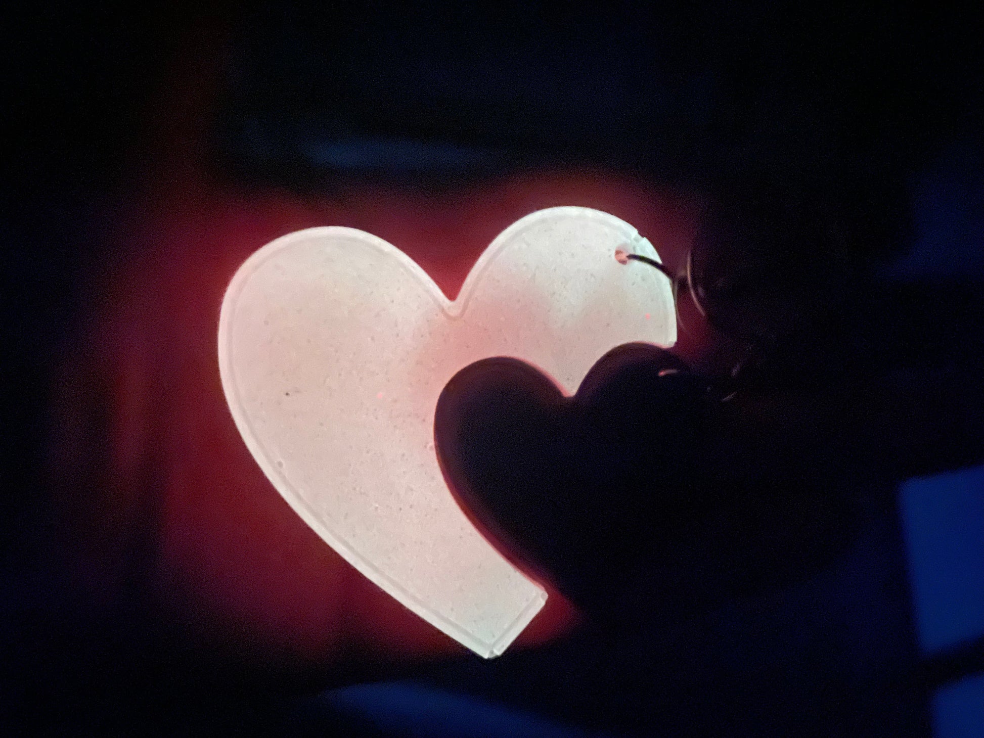This handmade matching keychain set features two complementary heart shapes designed to stay together. Crafted from resin and finished with mica powder and glitter, each heart has a smooth, glossy surface with rich colour depth and sparkle. The larger heart pairs perfectly with the smaller one, making this set ideal for sharing between two people or keeping both on a single set of keys or bag. Each set is individually made, ensuring subtle variations that make every piece unique.