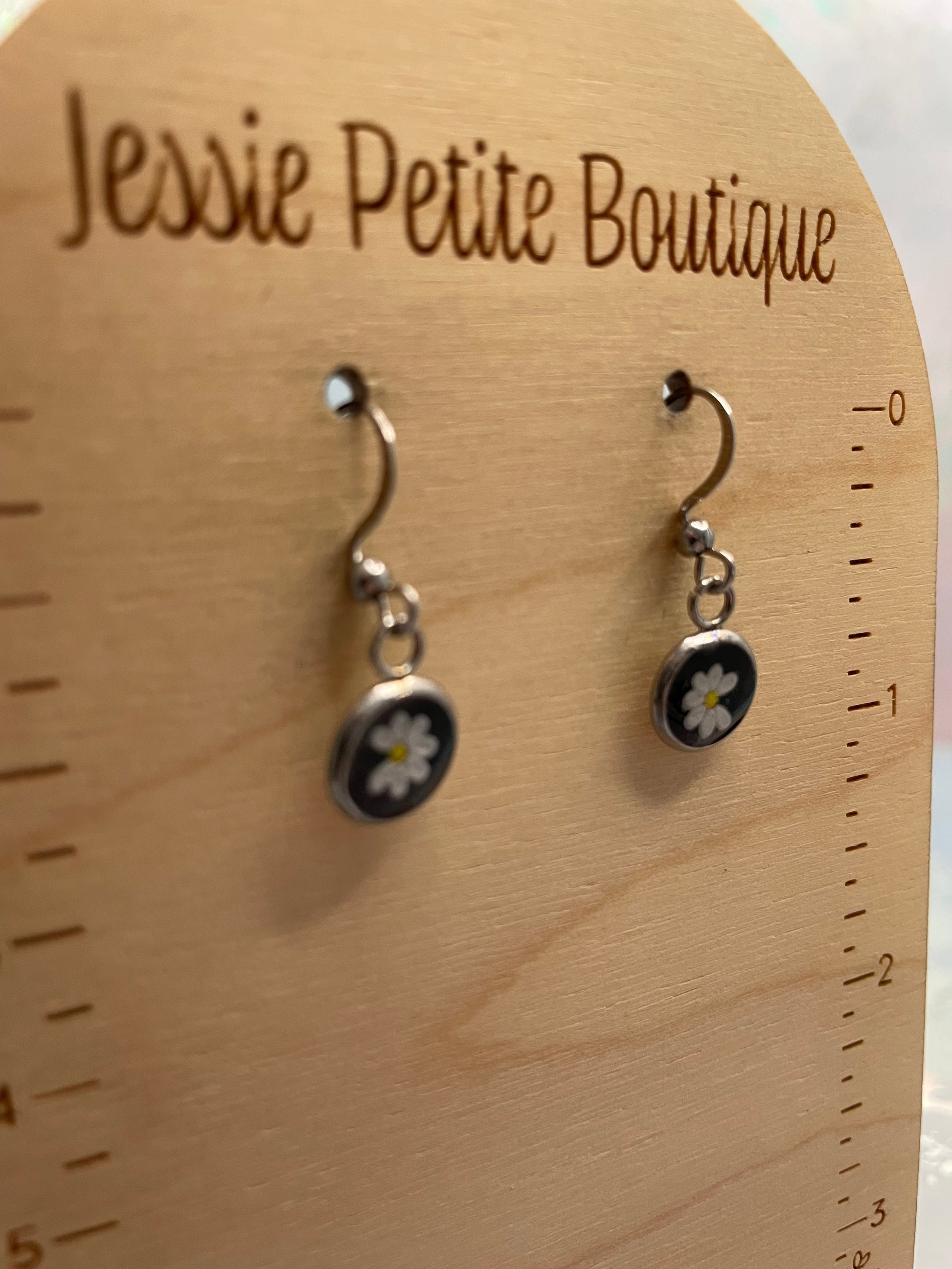 These delicate mini round bezel earrings feature a charming white flower set against a deep black background. The simple floral design creates a lovely contrast, giving the earrings a timeless and versatile look that’s easy to wear every day.