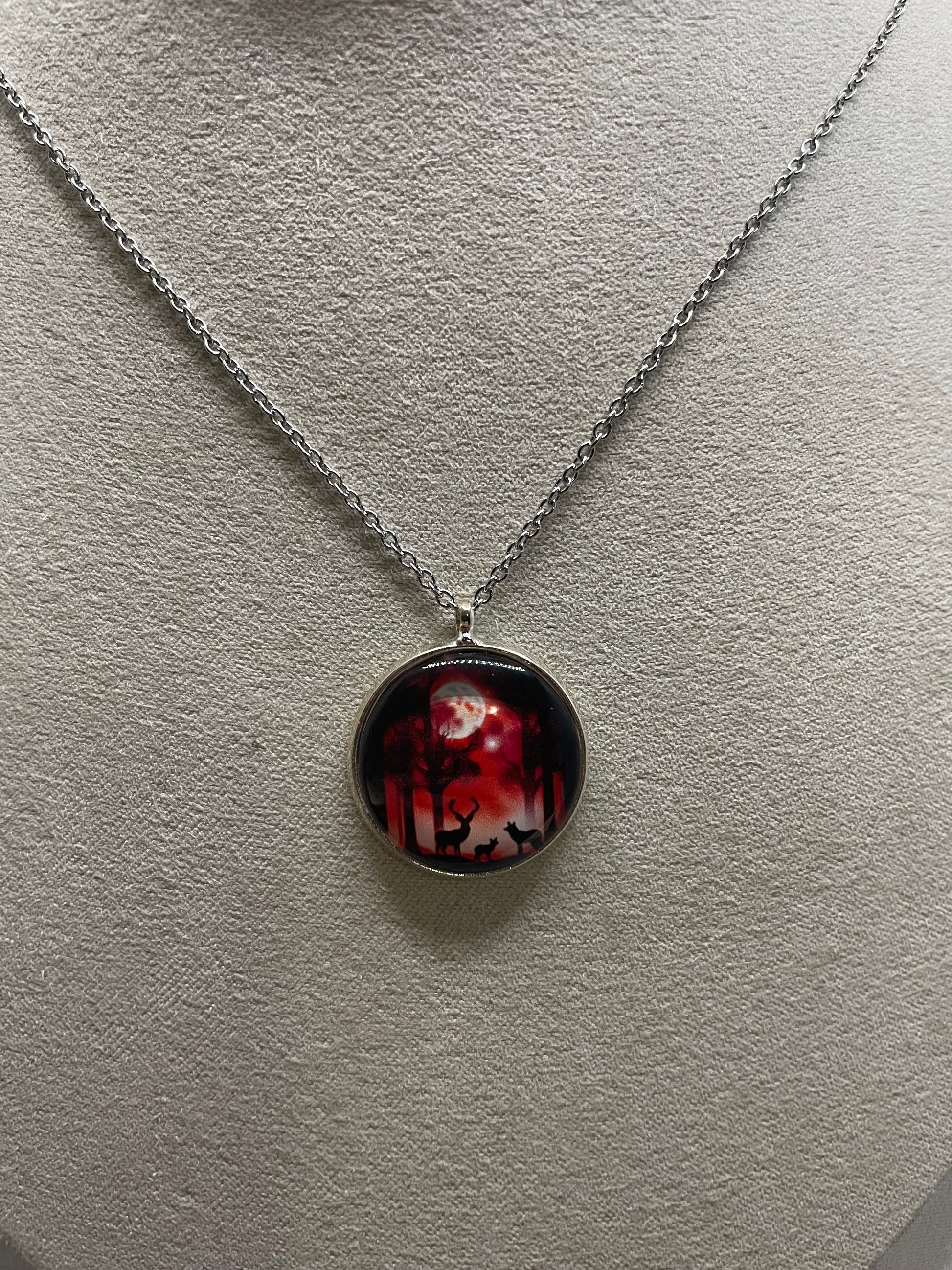 Step into a dreamy, storybook atmosphere with this delicate medallion necklace featuring a deer and its fawn, silhouetted in a moonlit forest. Each pendant captures a soft, enchanting scene, offering a poetic and mysterious touch that will appeal to nature lovers and those drawn to whimsical, narrative-inspired jewelry.