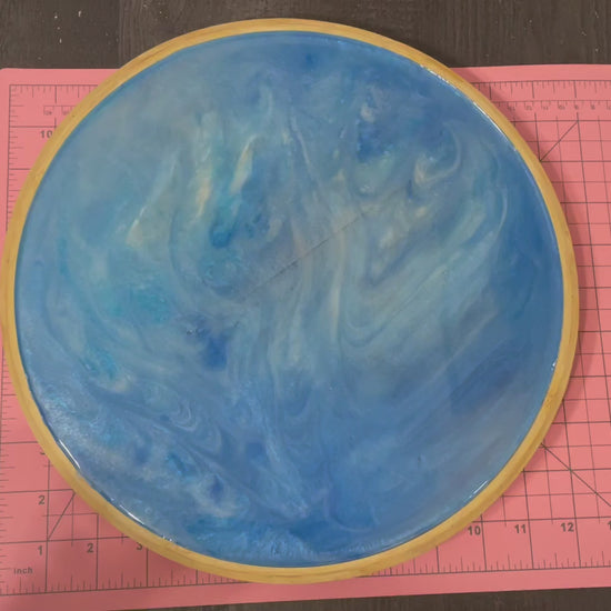 Bring a touch of elegance and uniqueness to your table with this handmade Lazy Susan. Crafted from natural wood, the surface is coated with a glossy layer of resin enhanced with blue mica powder, creating a shimmering, ocean-inspired effect that looks just like swirling waves.