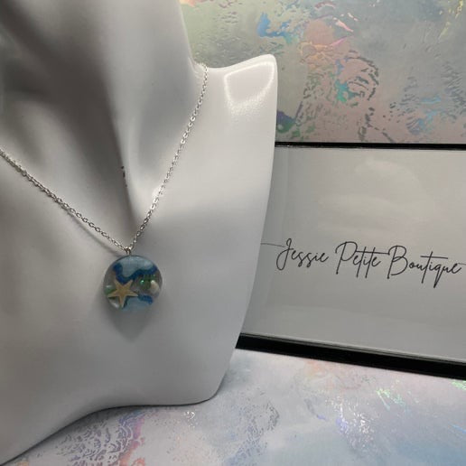 This round pendant captures a miniature seascape featuring a real starfish, natural shells, sand, and blue resin waves with shimmering mica reflections. Every pendant is one of a kind, just like nature itself.