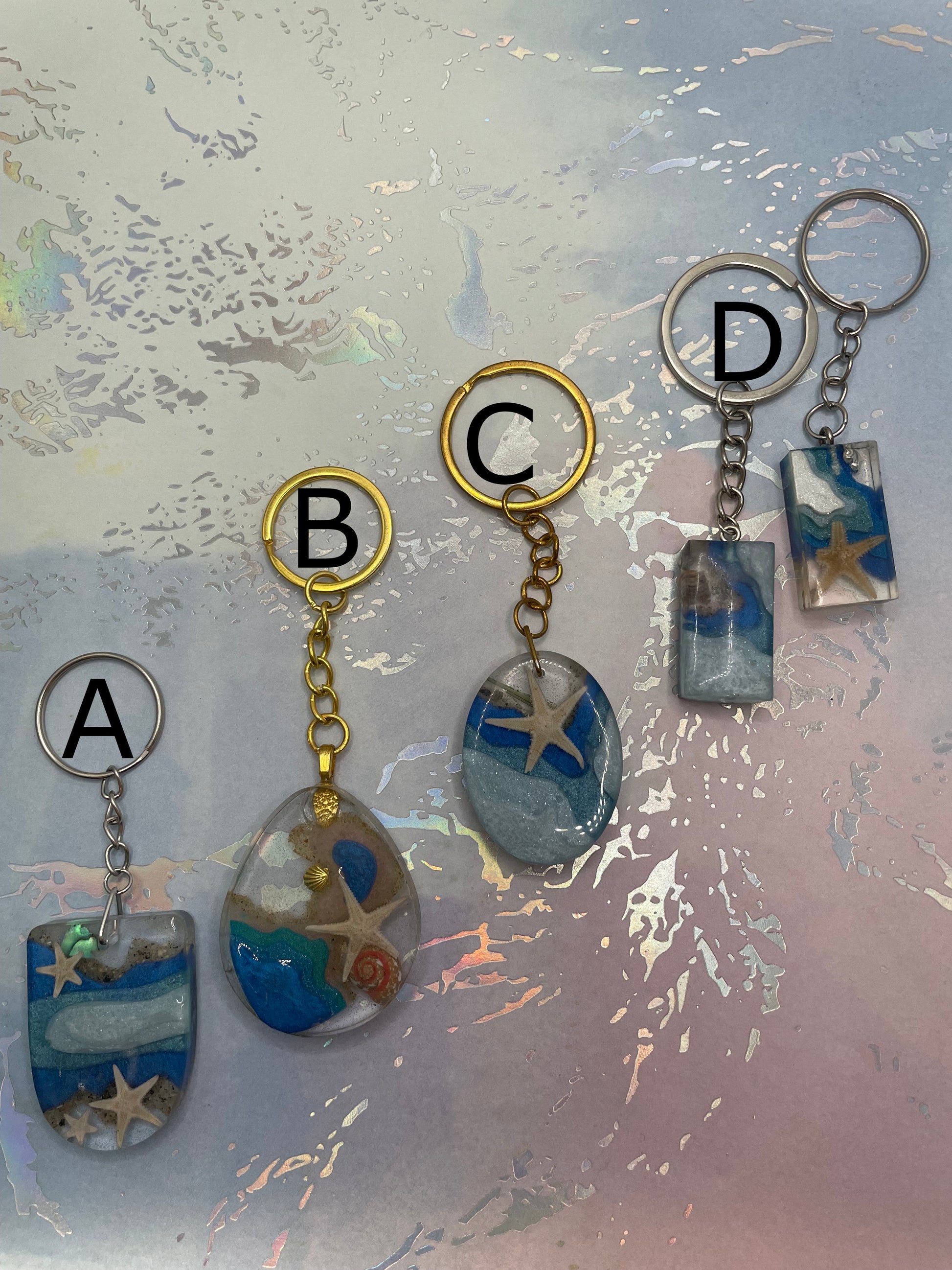 Bring a touch of the sea wherever you go with this ocean-inspired resin keychain, carefully handcrafted to capture the beauty of coastal landscapes. Each piece features layered shades of blue and sandy tones, accented with natural elements such as starfish, shells, and sand. The flowing design evokes gentle waves meeting the shore, making every keychain truly unique.