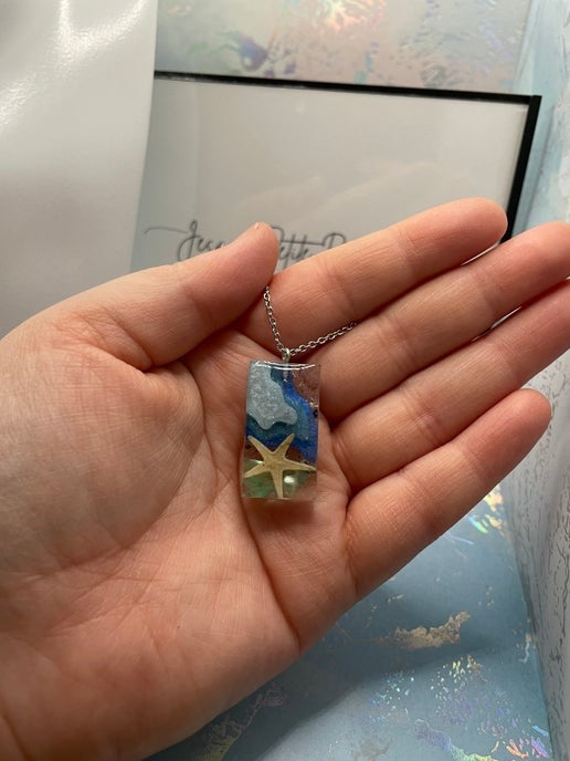 Bring a touch of seaside serenity wherever you go with this stunning Ocean Starfish Rectangle Necklace. Handcrafted from clear resin, it captures the beauty of the ocean depths — featuring real starfish, delicate shell accents, and layers of shimmering blue and green mica powder that mimic the waves.