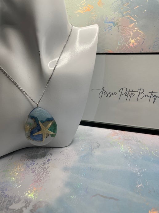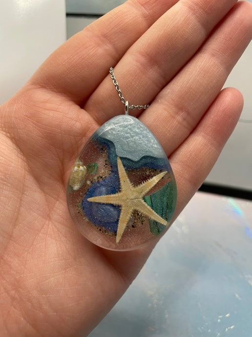 Materials: Resin, mica powder, shell, starfish, sand, nickel-free stainless steel chain