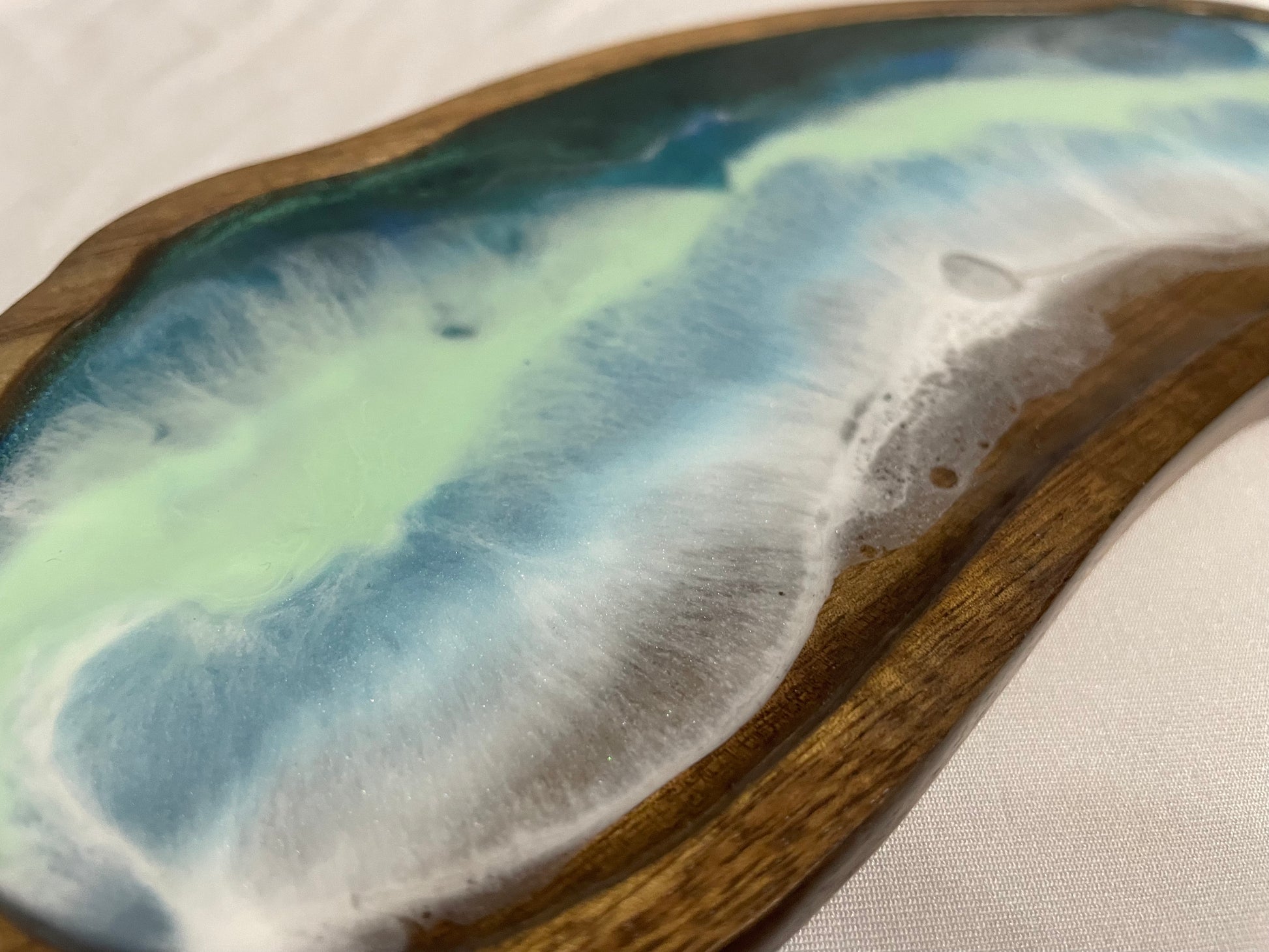 Invite coastal calm into your home with this stunning ocean-inspired acacia board. Handcrafted with layers of resin, mica powder, and alcohol ink, it creates the illusion of rolling waves and foamy shoreline over rich natural wood grain.