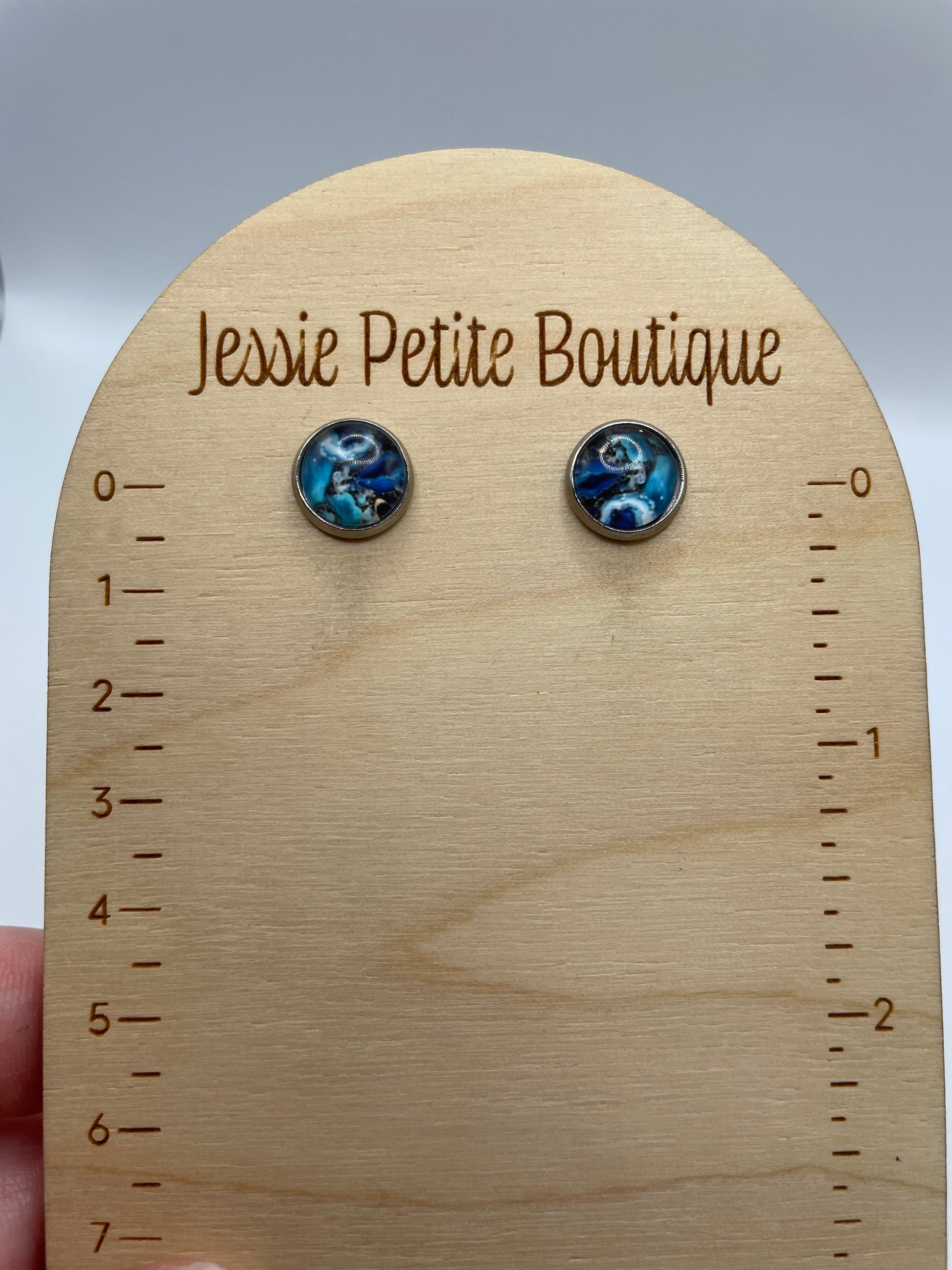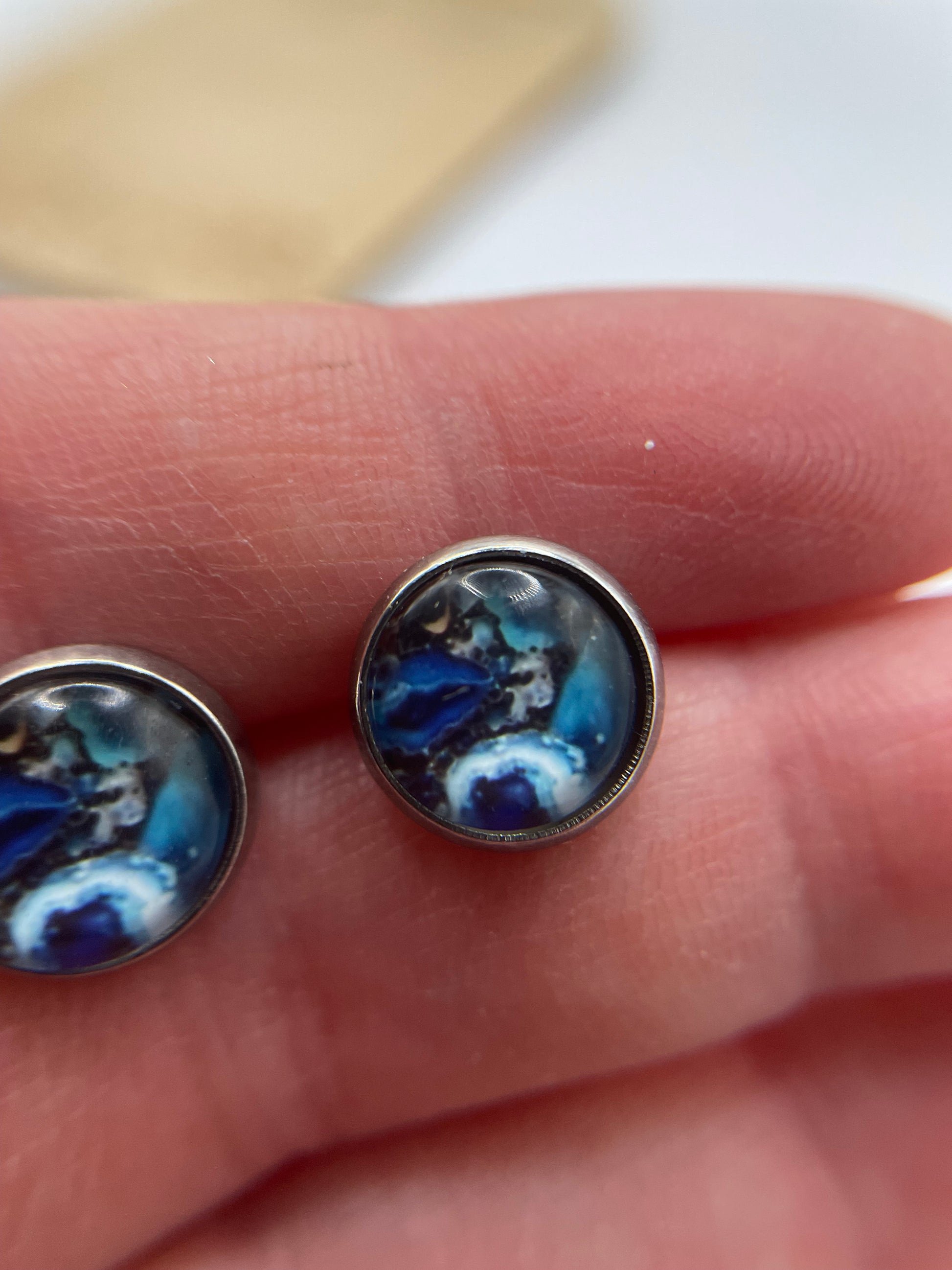Crafted from nickel-free +stainless steel, each pair features a glass cabochon (11 mm) with a smooth marble design available in four variations — green/teal marble or blue marble, on either a silver or black stud base.