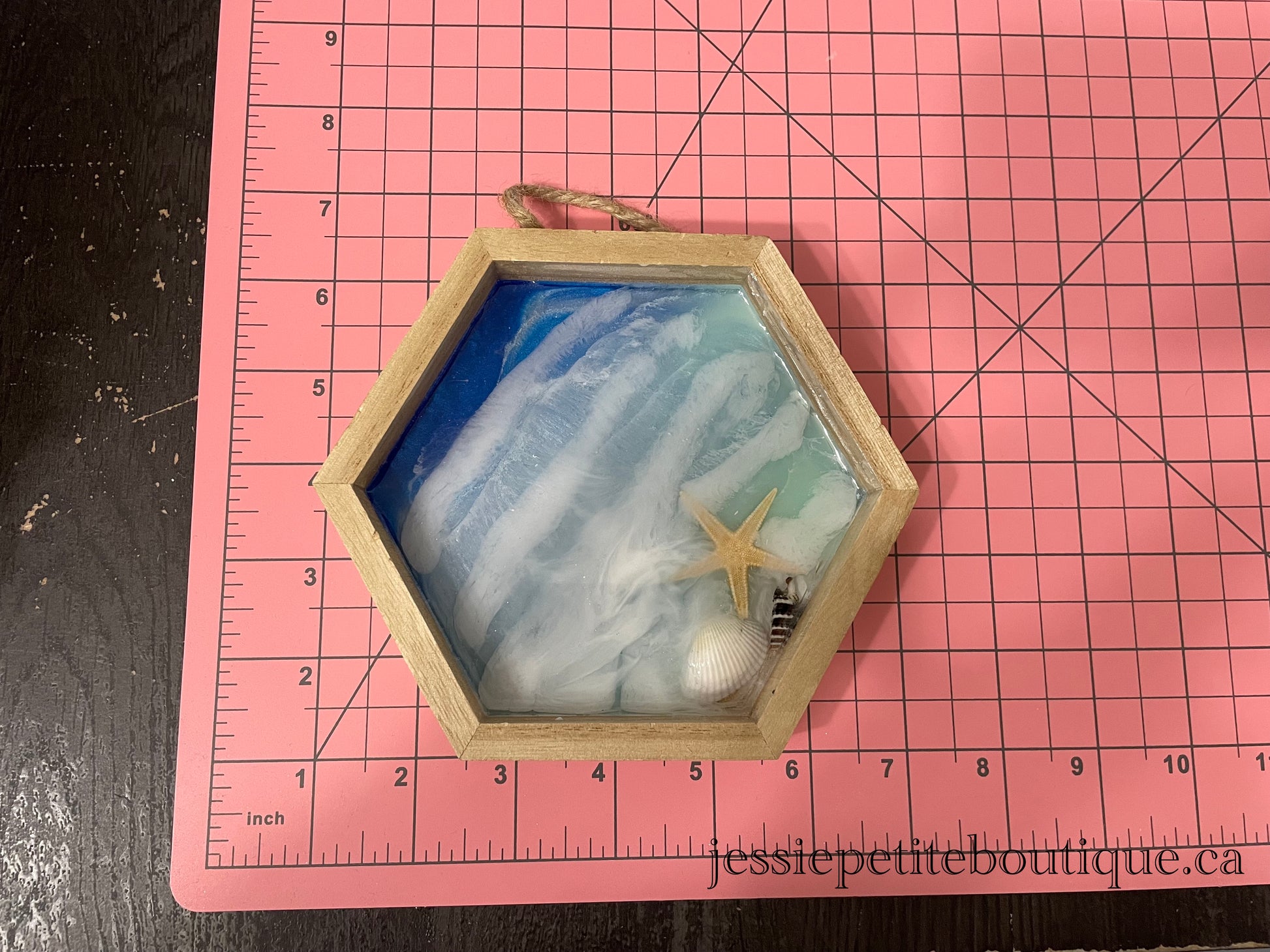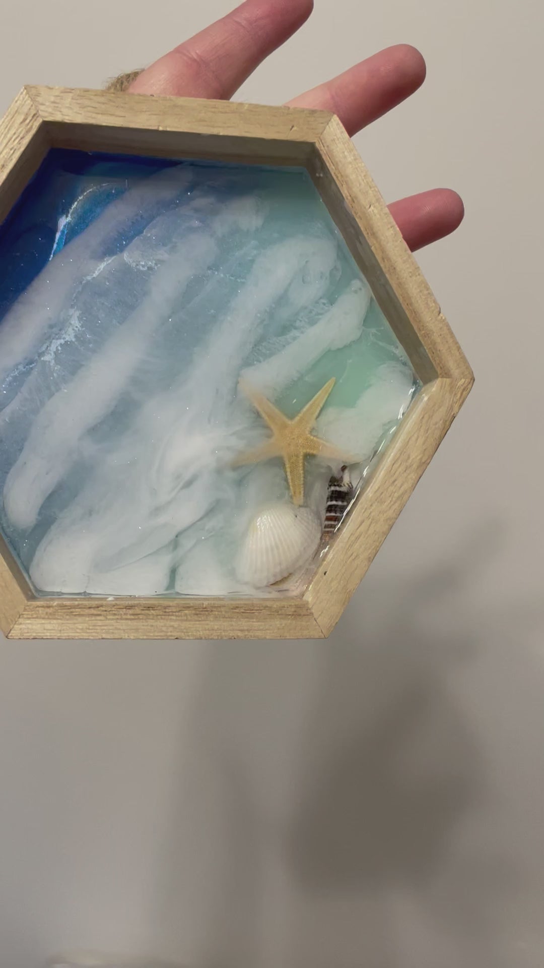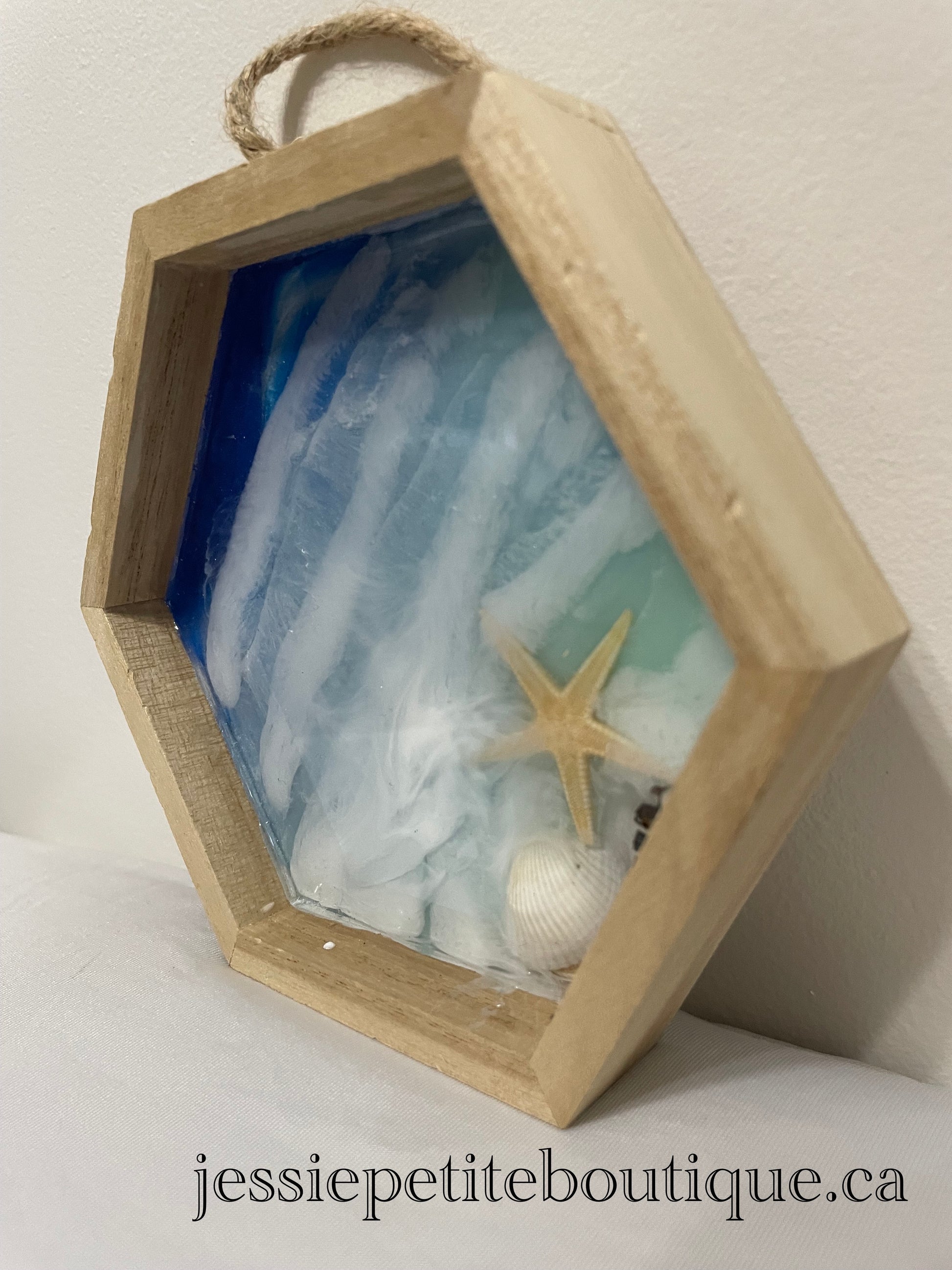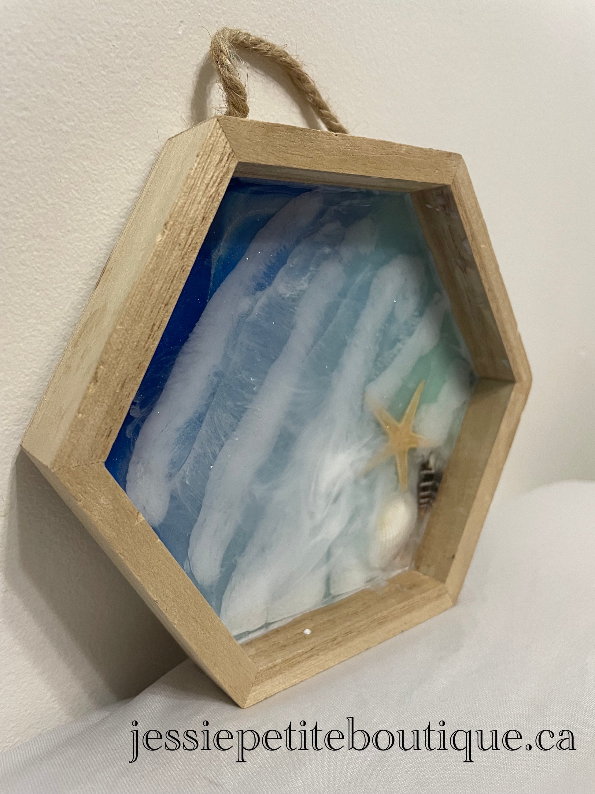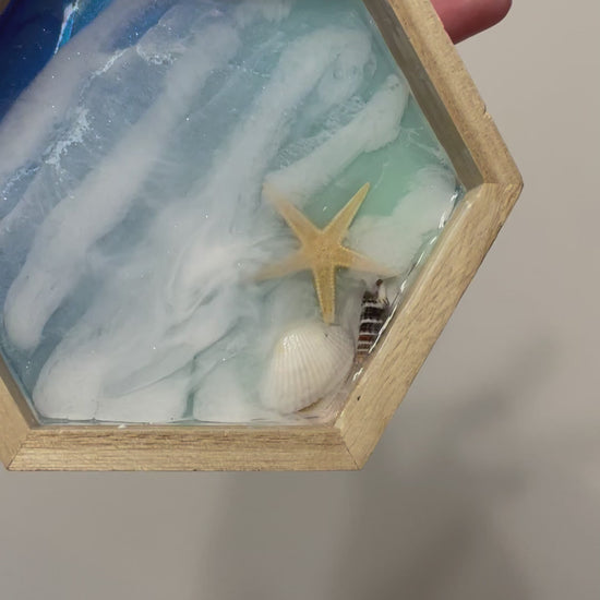 Bring a touch of coastal charm to your space with this exquisite hexagon wall decoration. Handmade with care, it features a natural wood base (14.9 cm x 13 cm) adorned with shimmering resin, mica powder, delicate starfish, and seashell accents. The interplay of textures and subtle sparkle evokes the serene beauty of the ocean, making it a perfect addition to any beach-inspired or nautical décor. Lightweight at just 134 g, it’s easy to display and adds a unique, artisanal touch to your home.