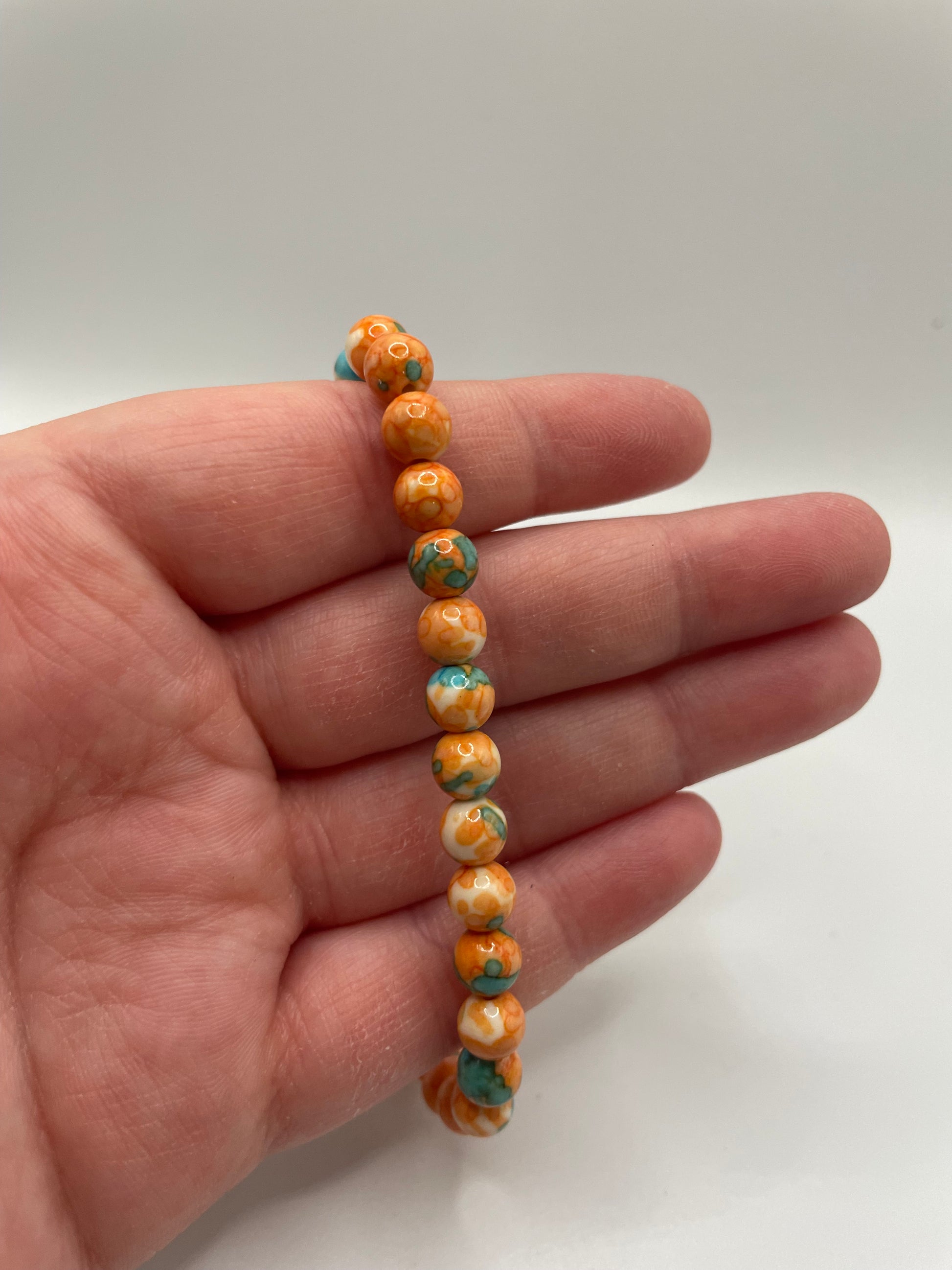 Add a cheerful pop of colour to your look with this vibrant bracelet featuring 0.6 cm glossy beads in lively shades of orange, turquoise, and cream. The marbled pattern gives each bead a unique, handcrafted appearance, creating a playful yet elegant style.
