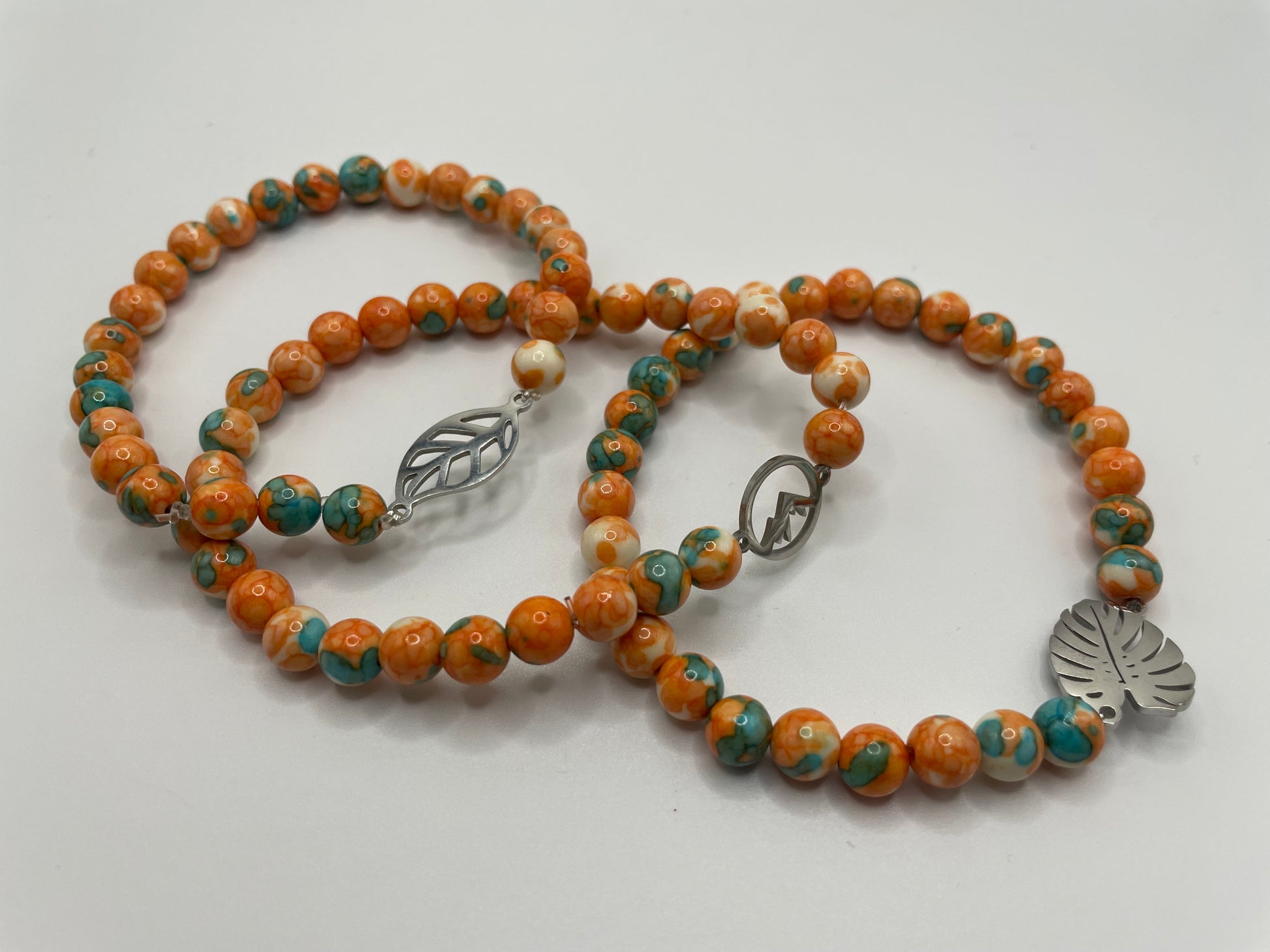 These vibrant bracelets feature 0.6 cm glossy beads in a lively mix of orange, turquoise, and cream tones, each with unique marbled patterns that catch the light beautifully. Adorned with a polished stainless steel charm, each design offers a playful yet refined touch — choose from a leaf, monstera, or mountain motif to suit your style.