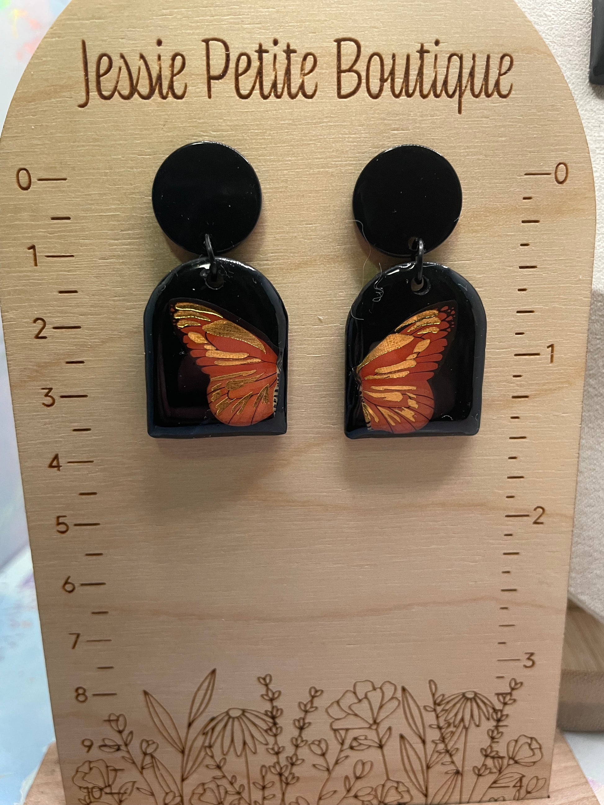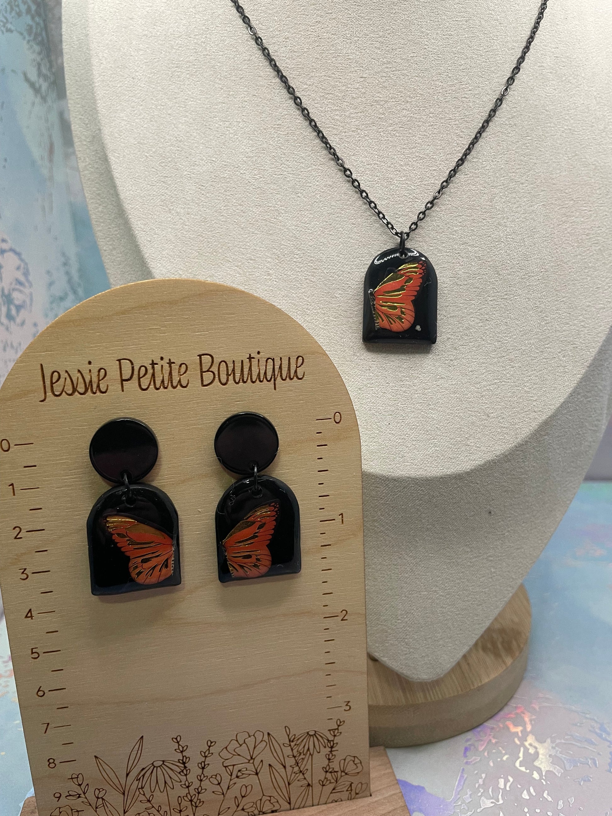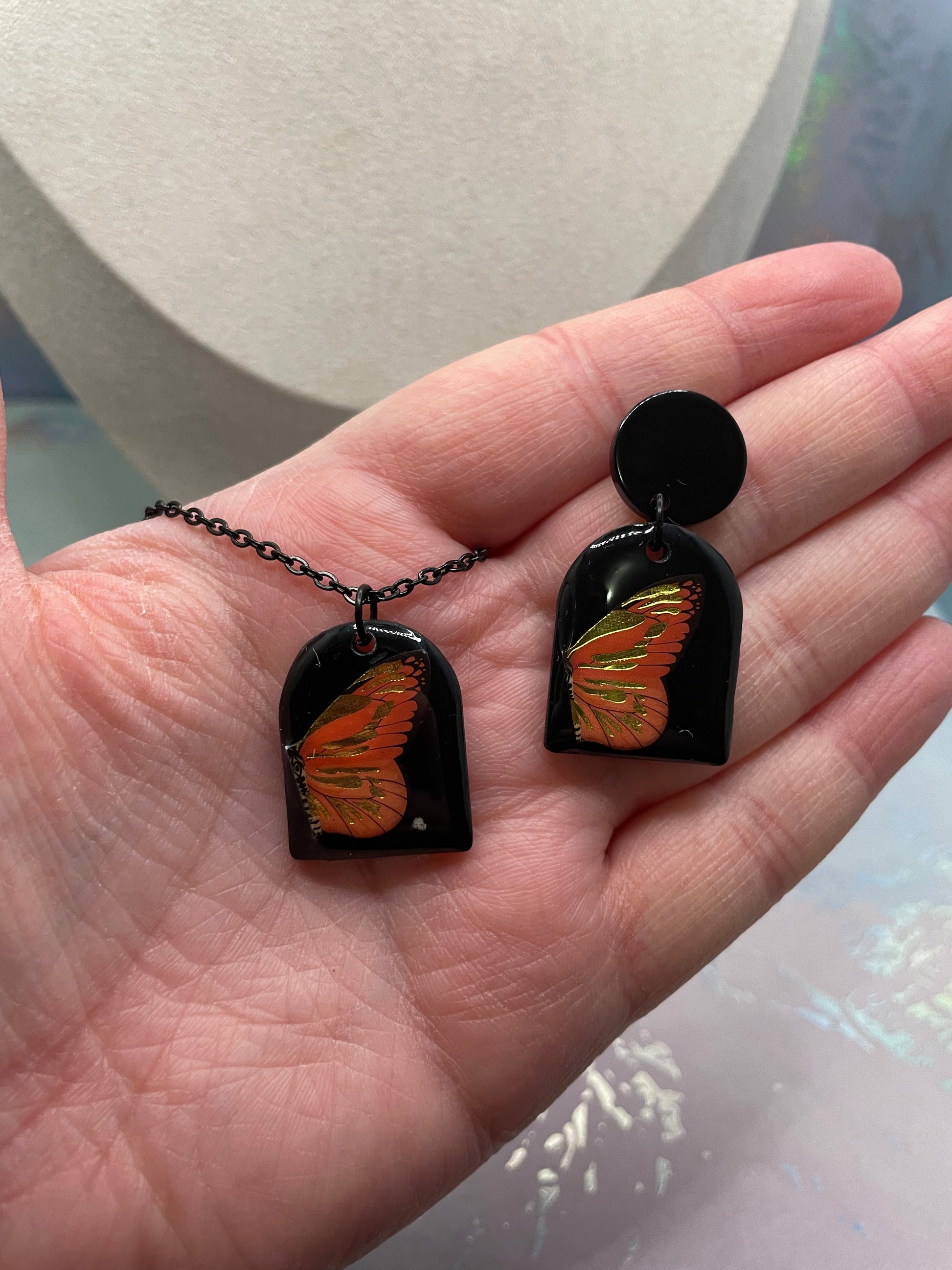 A bold and artistic set featuring a vibrant orange butterfly wing delicately framed against a deep black background. The softly rounded arch shape enhances the contrast between the warm orange and subtle golden accents, creating a striking yet refined look. Lightweight and eye-catching, this set adds a dramatic touch while remaining easy to wear.