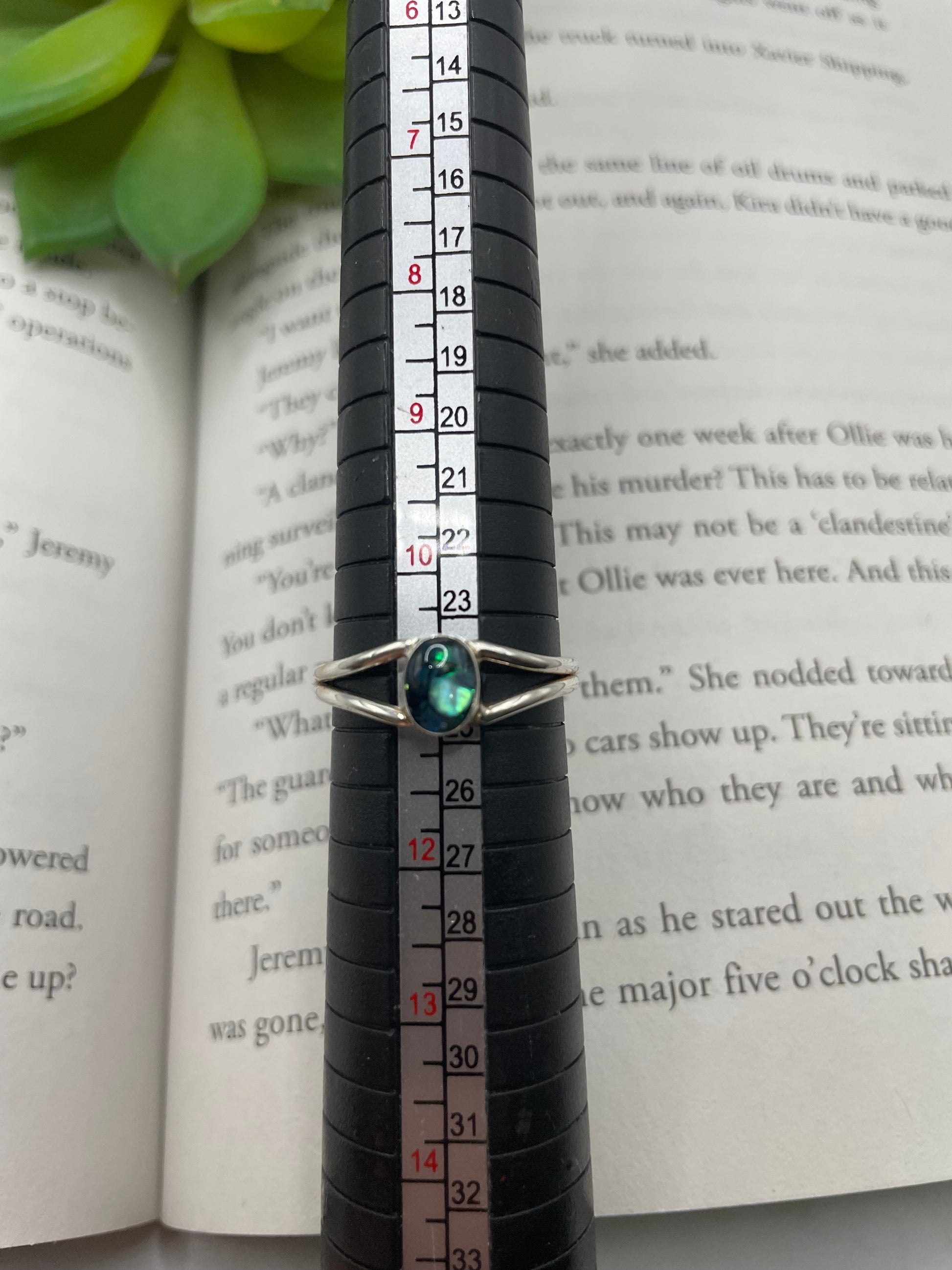 Elegant and minimal, this 925 sterling silver ring features a delicate 5×7 mm oval bezel filled with shimmering blue shell encapsulated in resin.