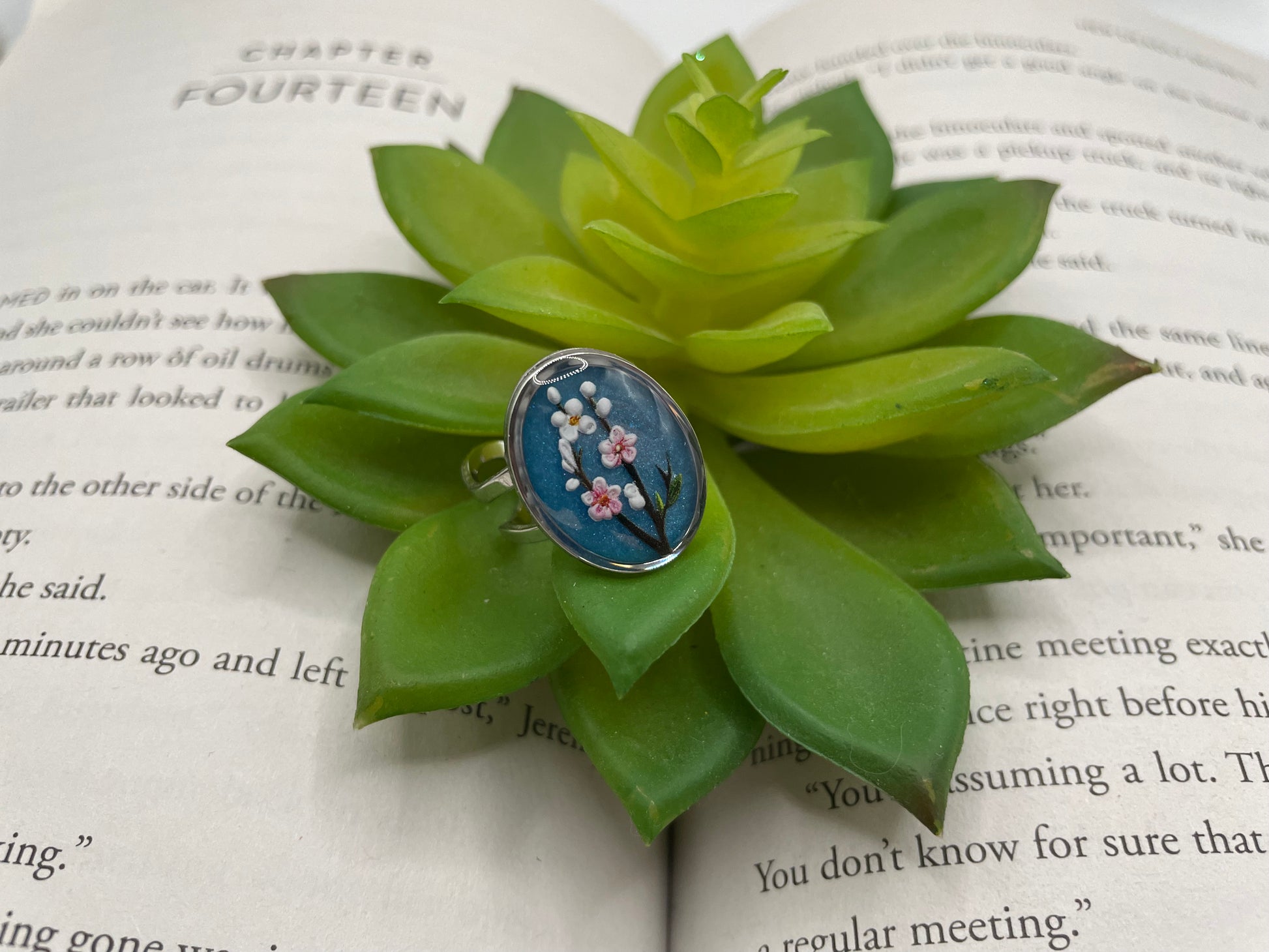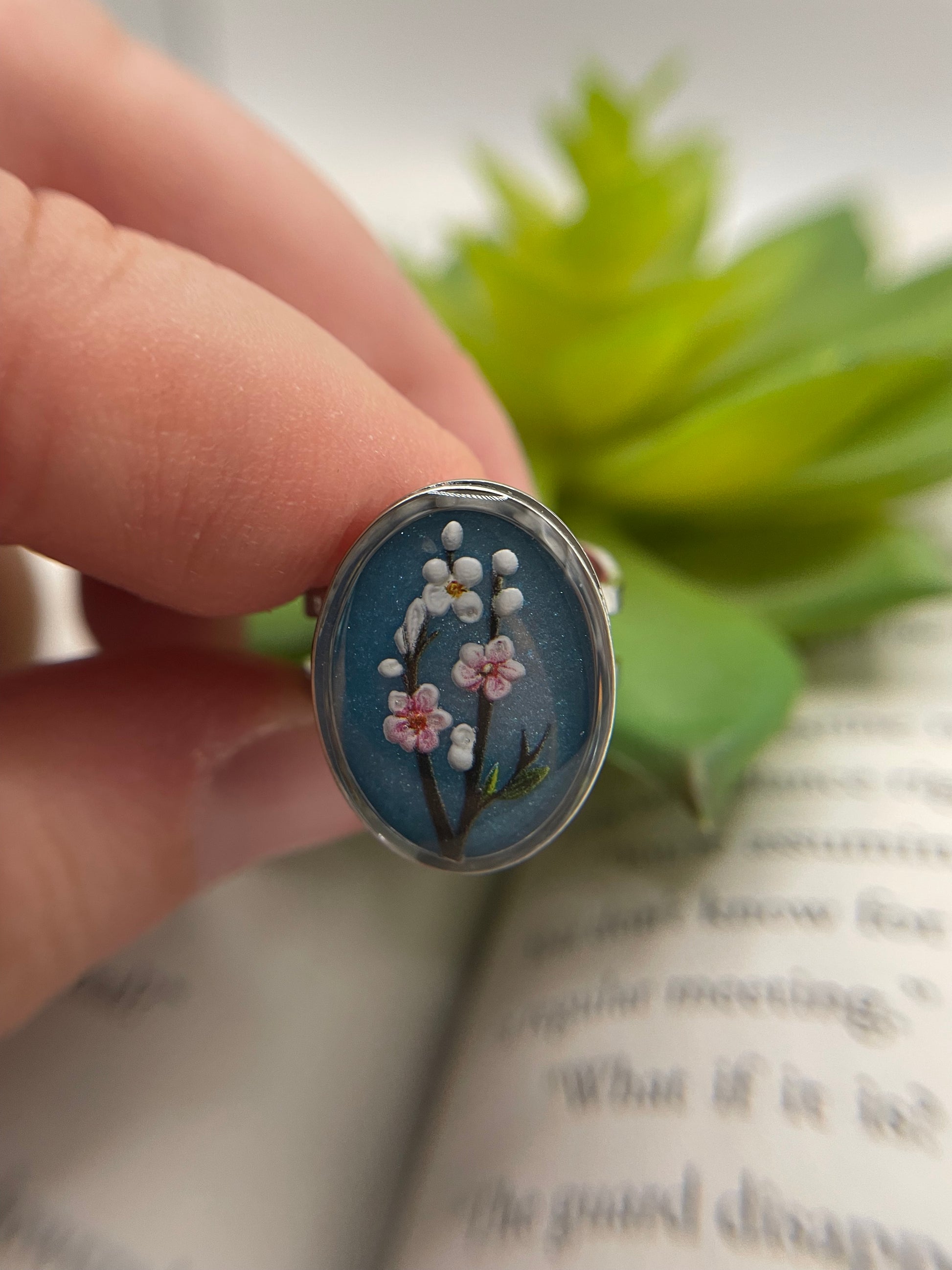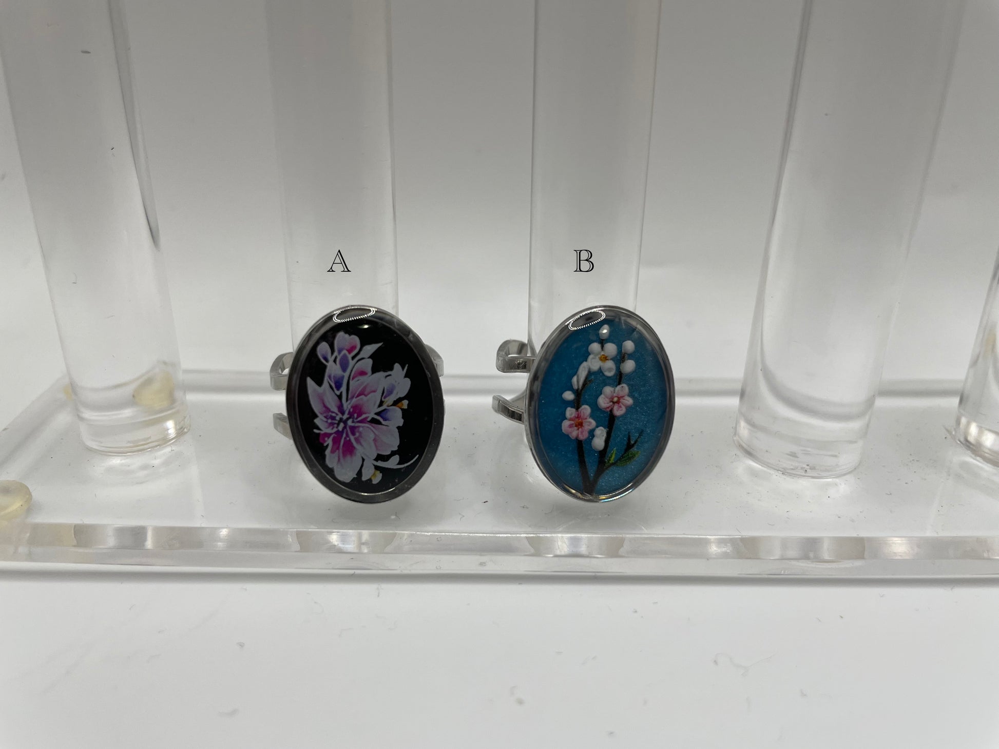 Graceful and timeless, these oval rings showcase delicate floral motifs encased in clear resin with a subtle shimmer from mica powder.