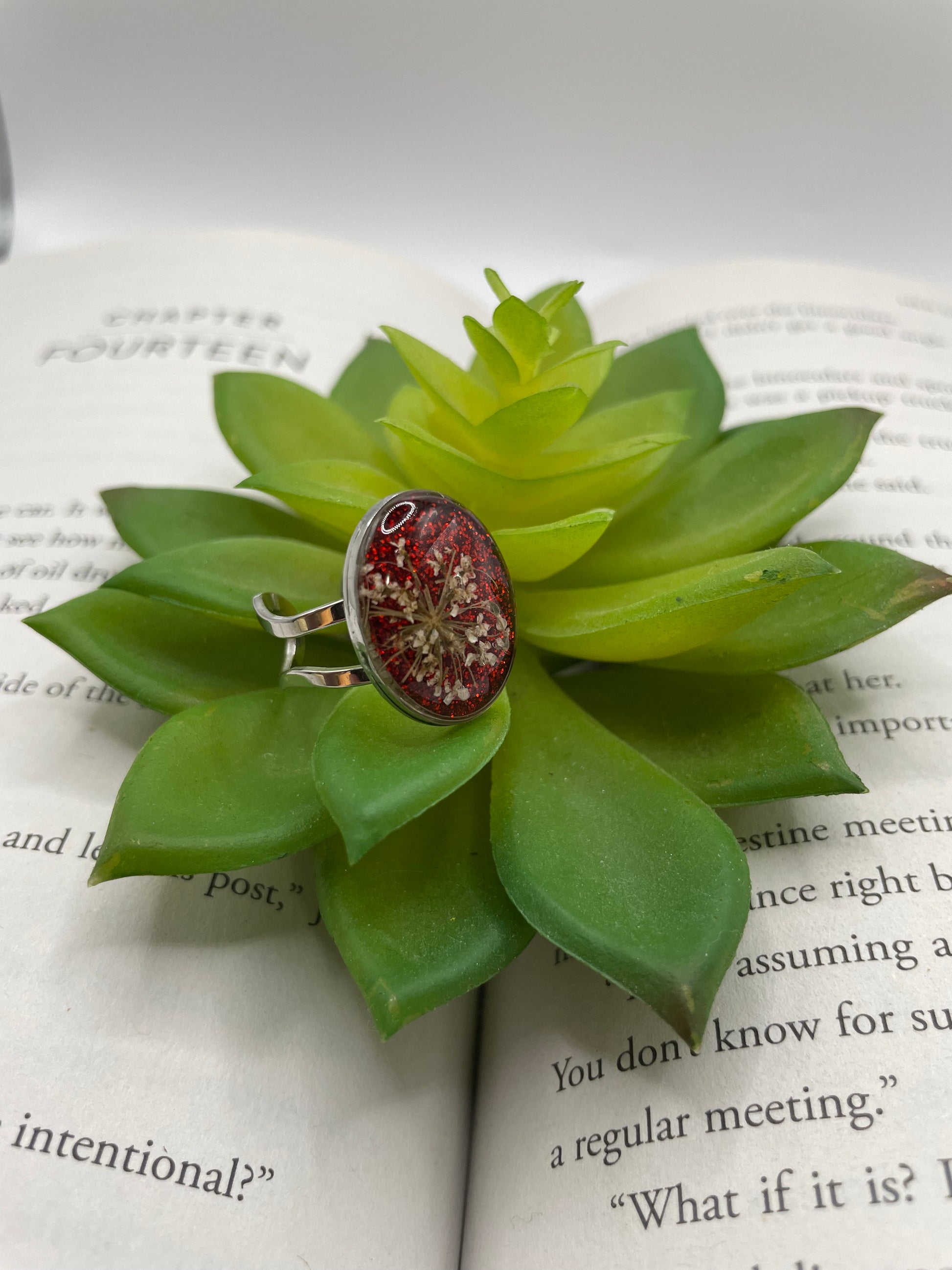 Delicate and timeless, these oval rings capture the beauty of nature with real pressed flowers encased in clear resin. The soft shimmer of mica powder enhances each petal’s detail, creating a piece that’s both natural and refined.