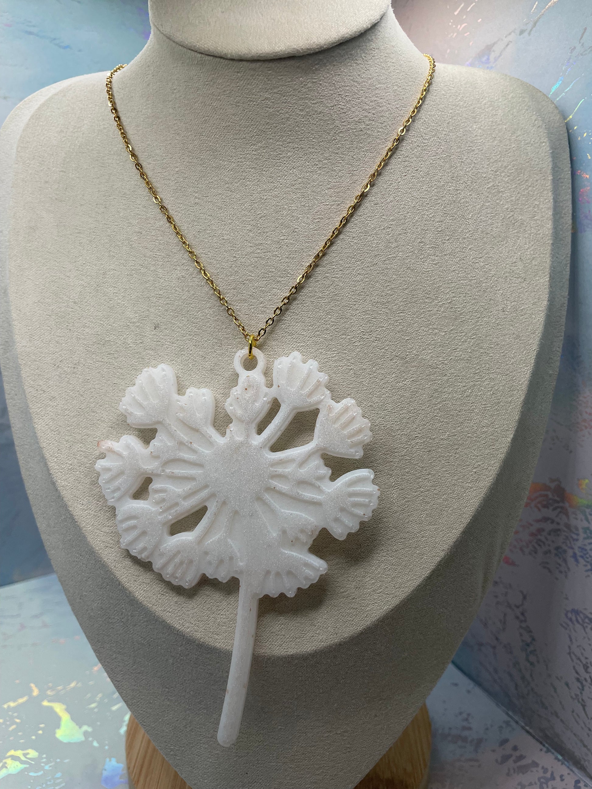 This statement necklace features a striking oversized dandelion pendant with a soft chameleon shimmer that subtly shifts with the light. Handcrafted from resin and mica powder, the detailed silhouette creates a bold yet airy design that stands out while remaining lightweight and comfortable to wear.