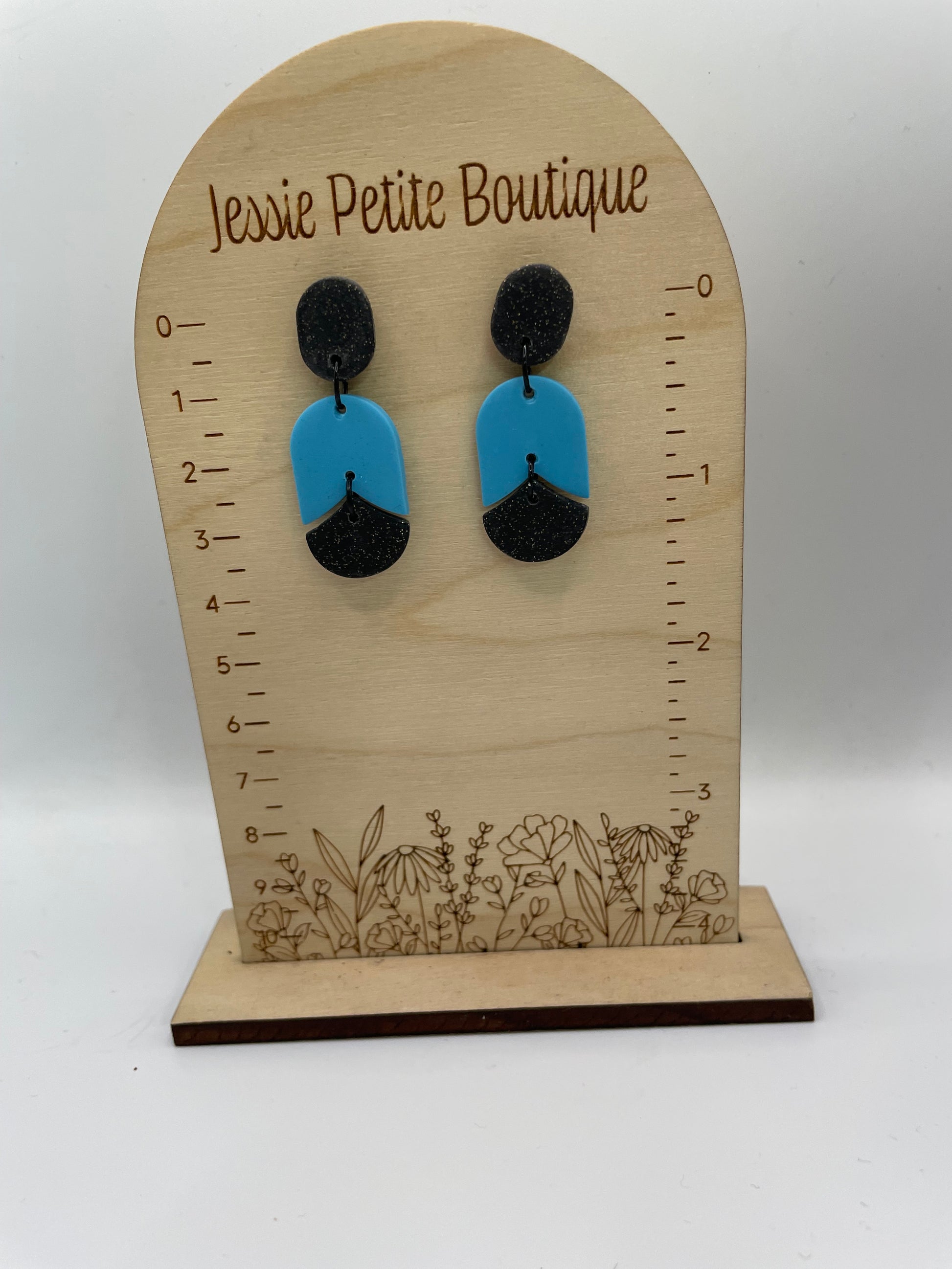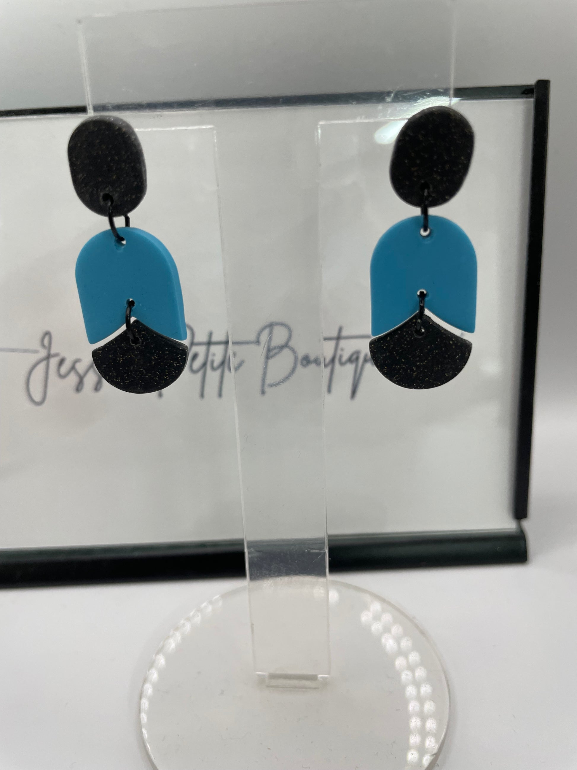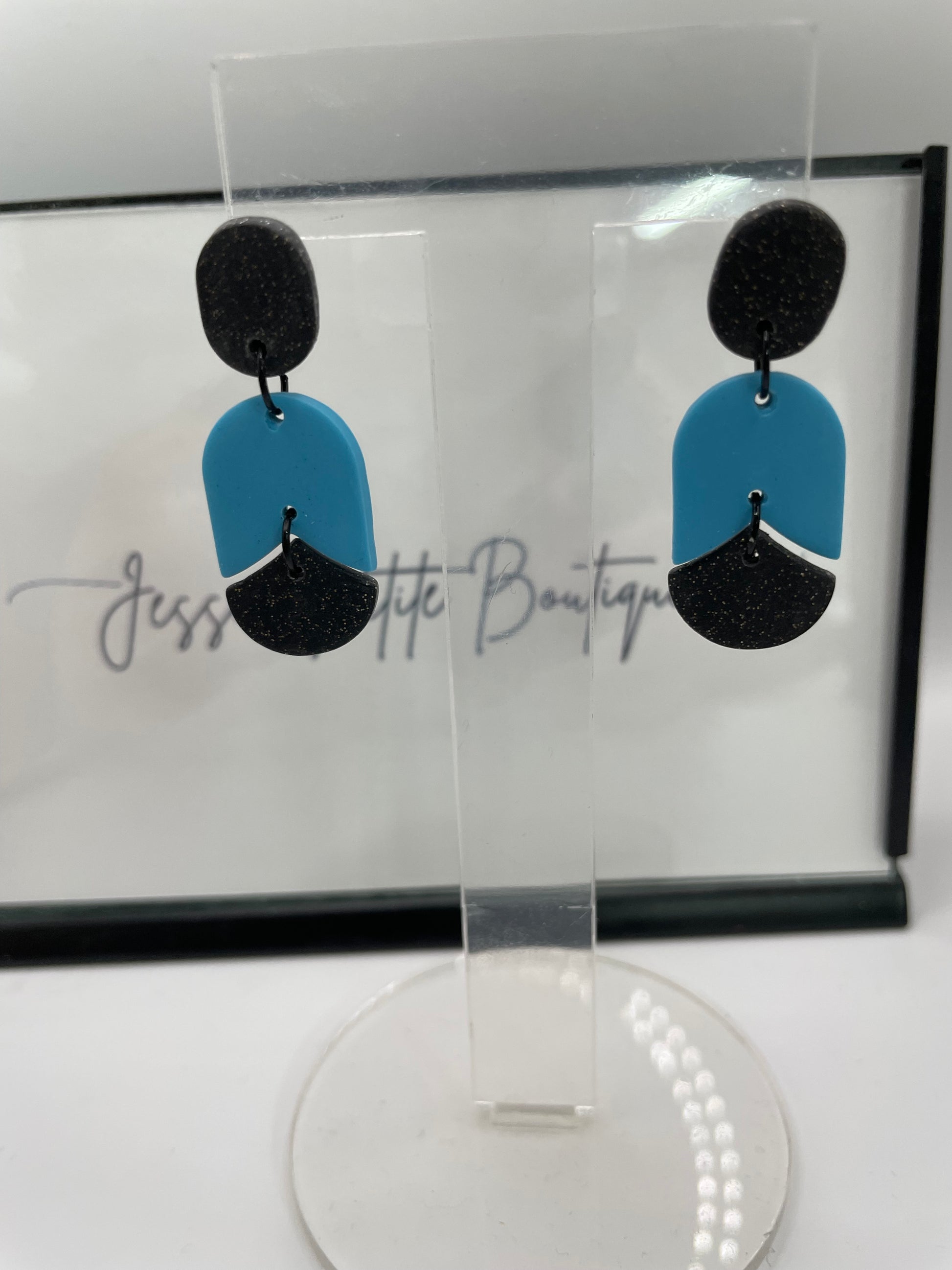 Modern and playful, the Paula earrings combine bold contrast with minimalist curves. Featuring layered ovals in matte black and vibrant blue, these handmade polymer clay earrings are a lightweight statement piece perfect for adding a pop of color to your look.