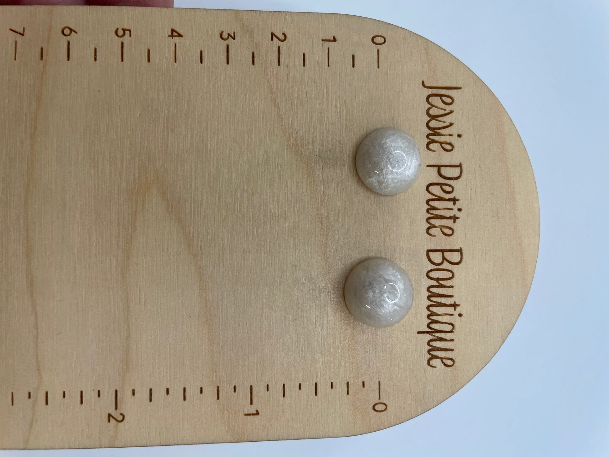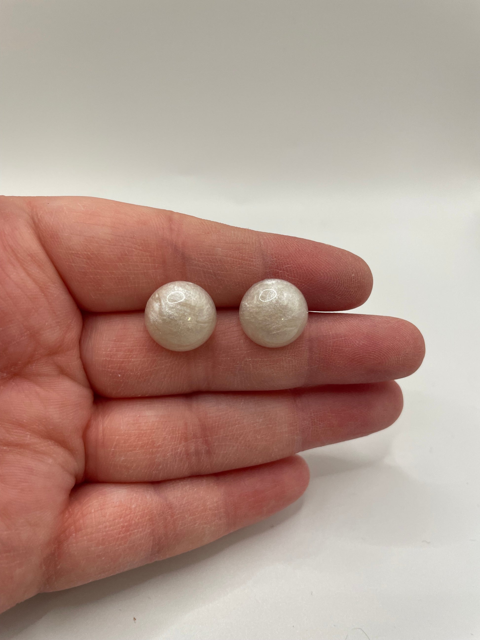 Elegant and timeless, these pearlescent white stud earrings add a soft, refined glow to any outfit. Their subtle shimmer comes from a blend of resin and mica powder, creating a smooth finish that reflects light beautifully. Perfect for both casual days and special occasions.