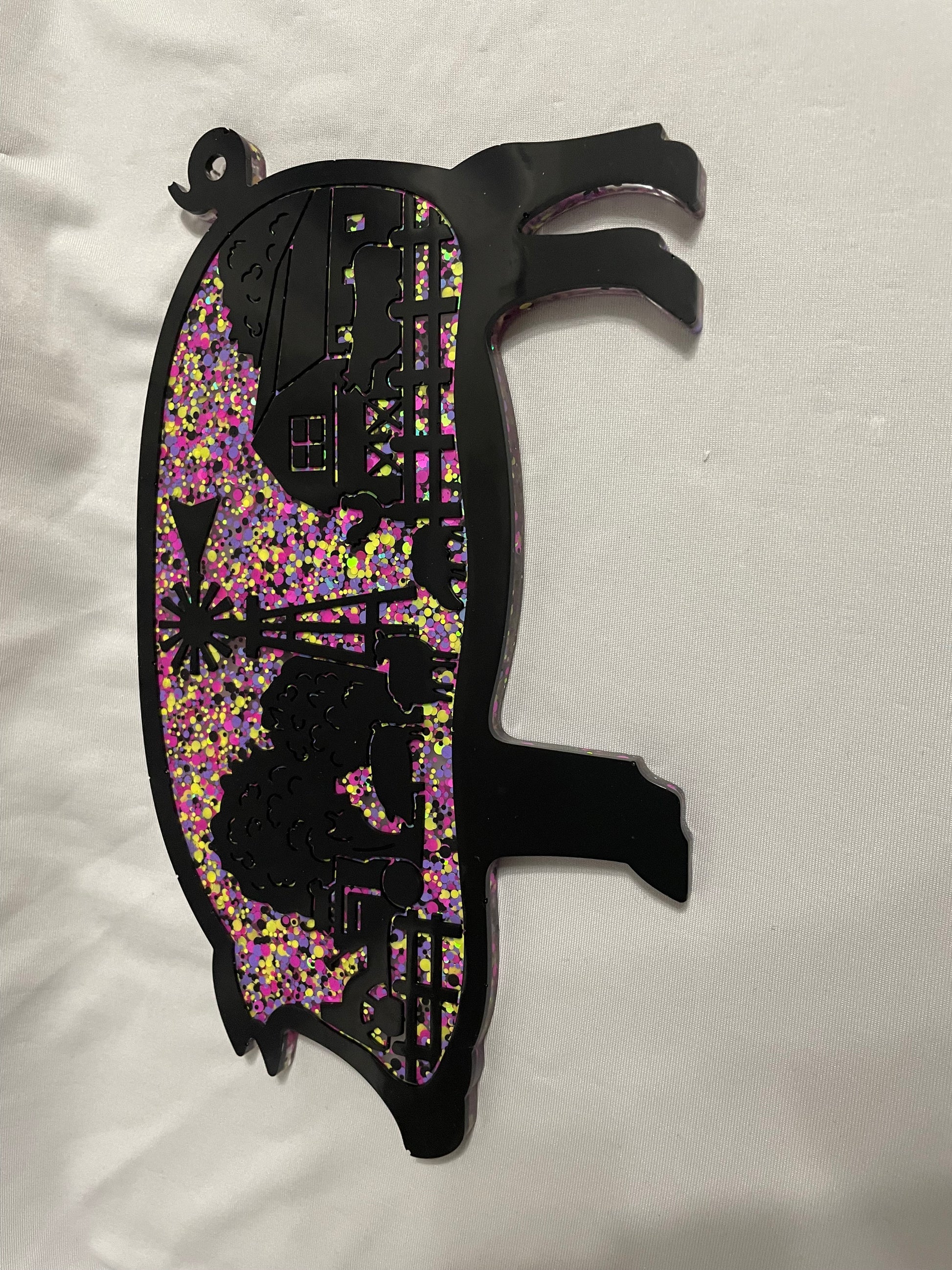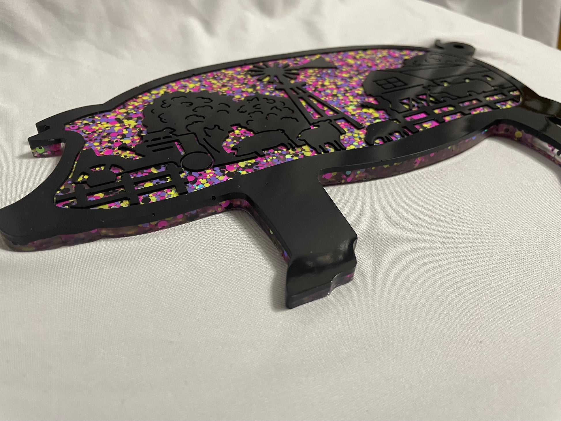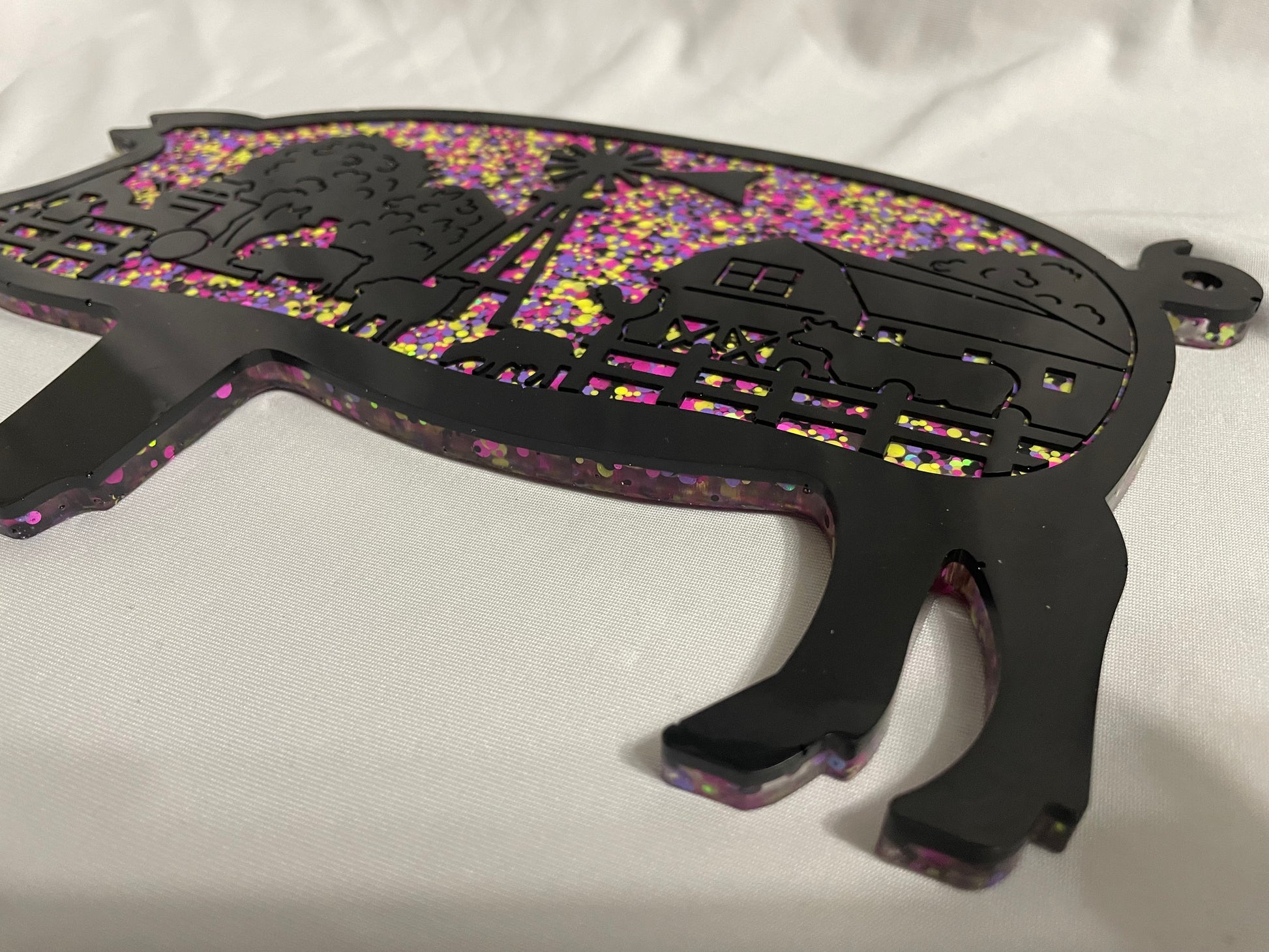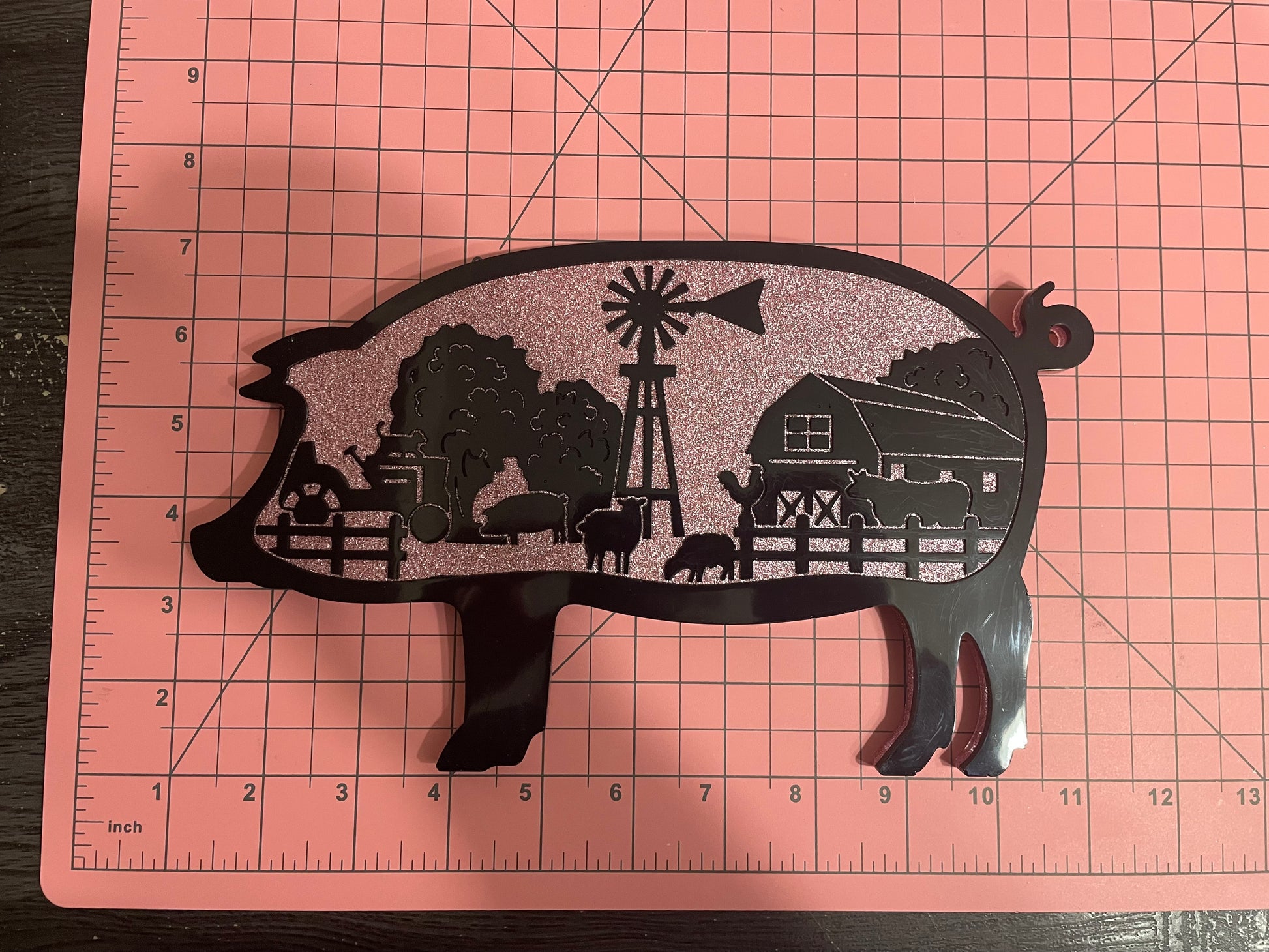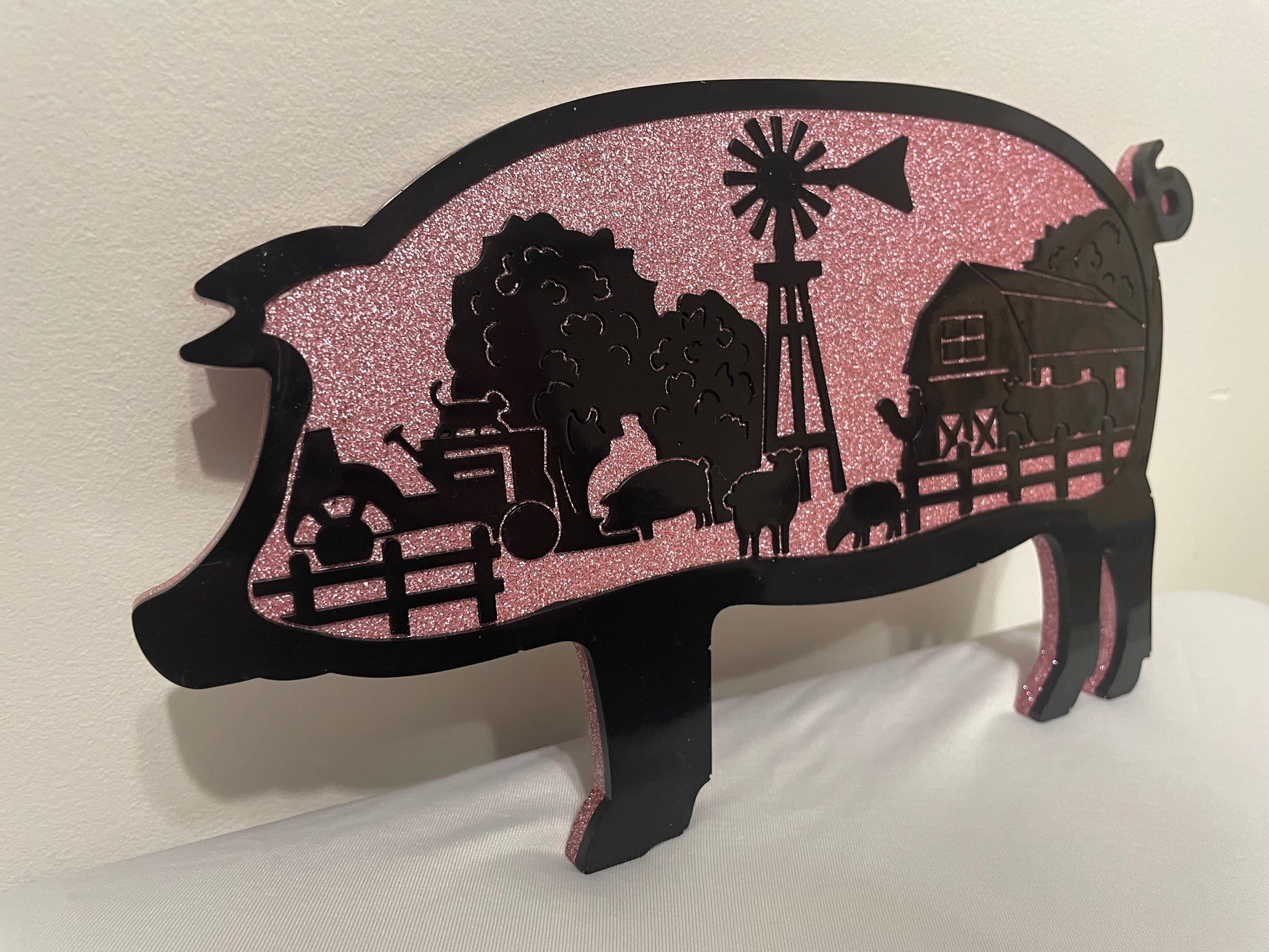 Add a fun and rustic sparkle to your home with this charming pig-shaped wall decoration featuring a detailed farm scene silhouette.