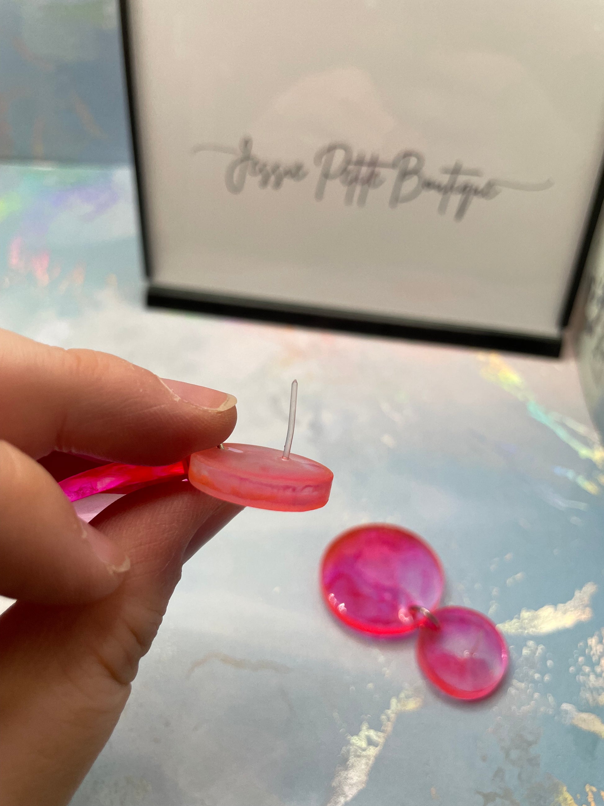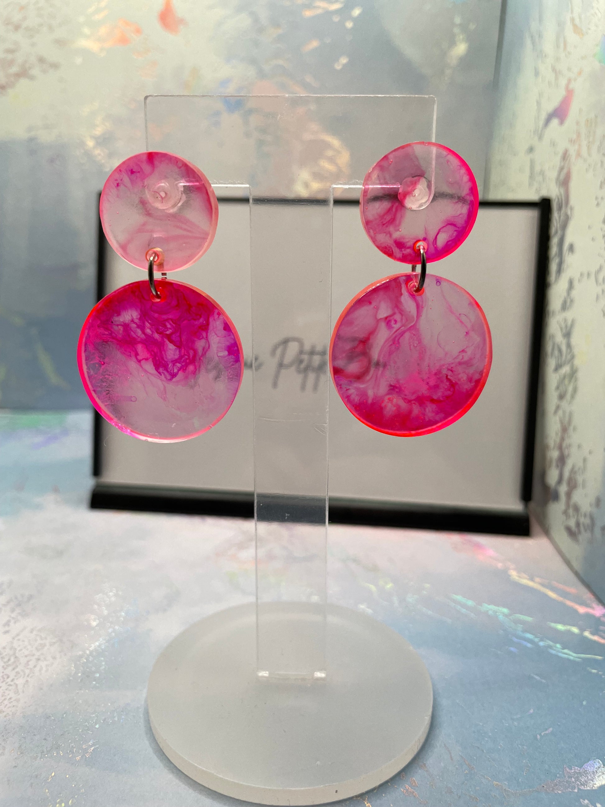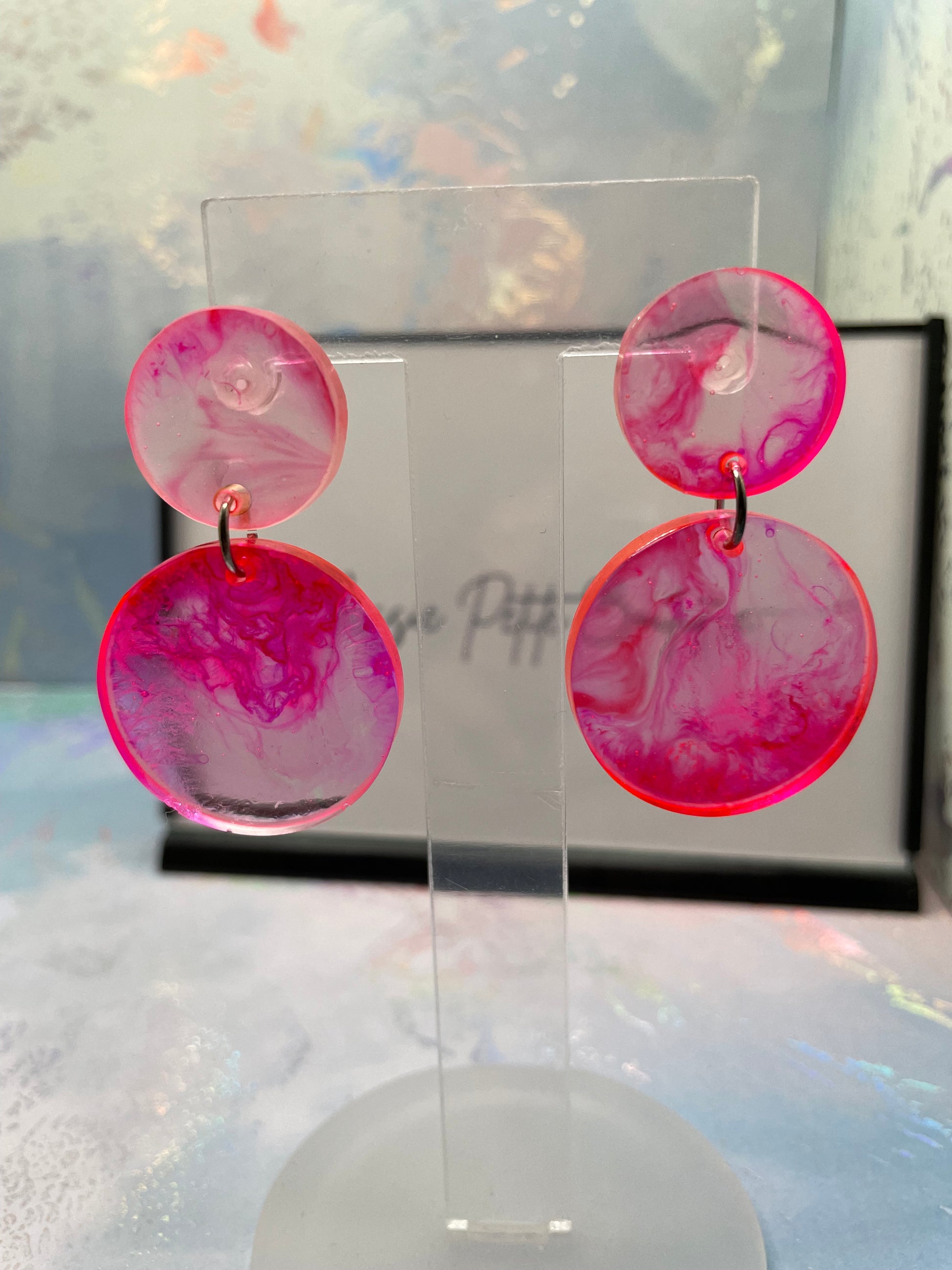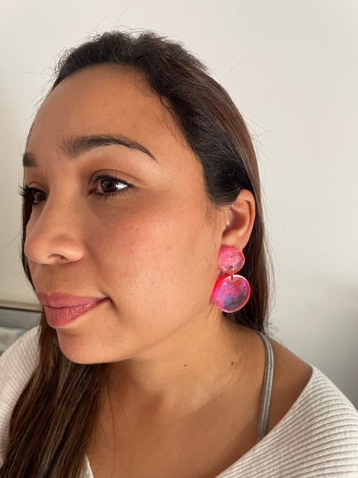 These elegant earrings showcase a soft pink hue blended with clear resin, forming a charming circular design. Made with alcohol ink and resin, the earrings are lightweight and eye-catching, perfect for a subtle yet sophisticated look. The plastic stud and butterfly closure make them suitable for sensitive ears.