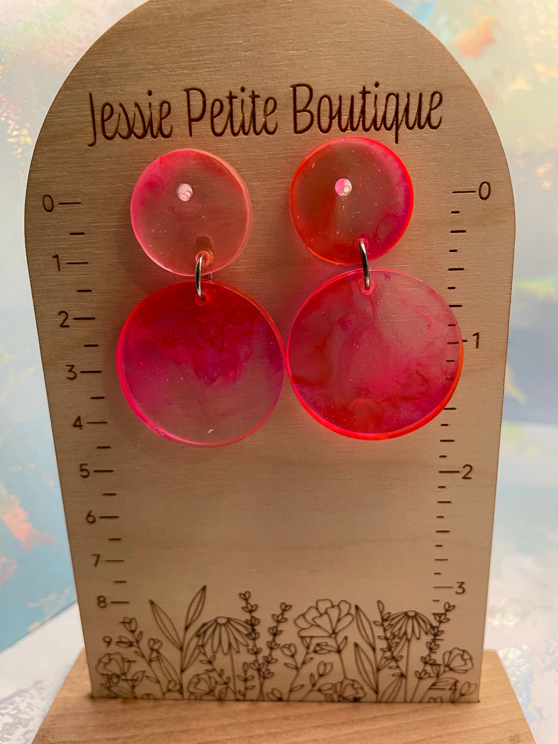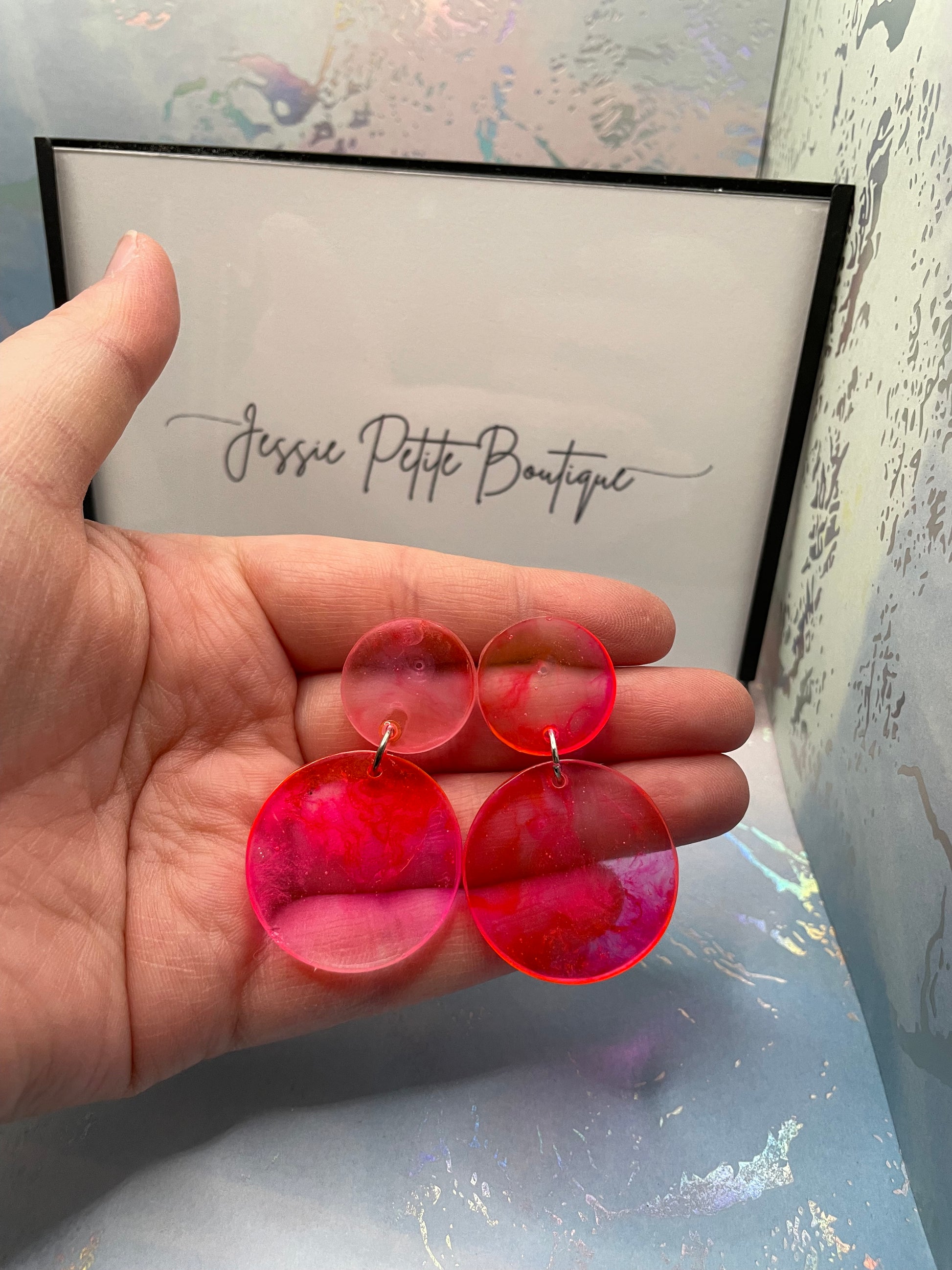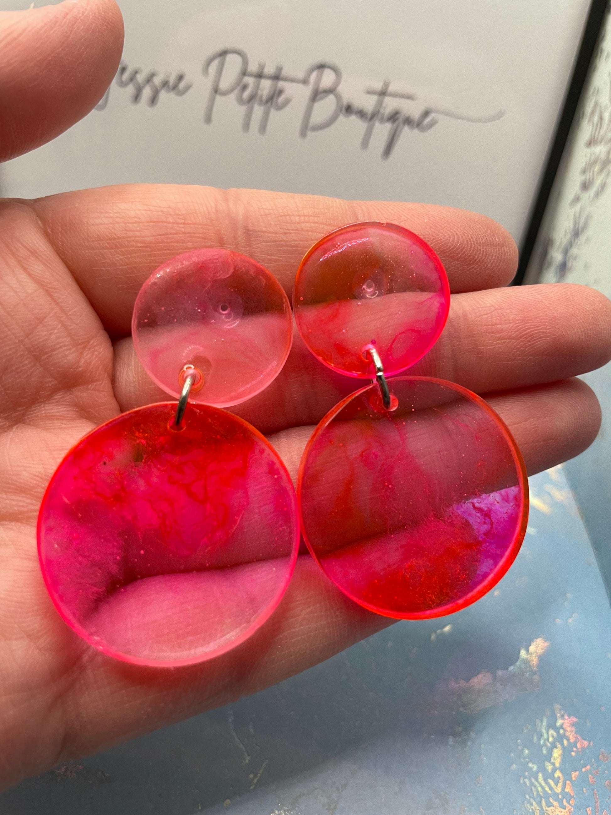 These elegant earrings showcase a soft pink hue blended with clear resin, forming a charming circular design. Made with alcohol ink and resin, the earrings are lightweight and eye-catching, perfect for a subtle yet sophisticated look. The plastic stud and butterfly closure make them suitable for sensitive ears.
