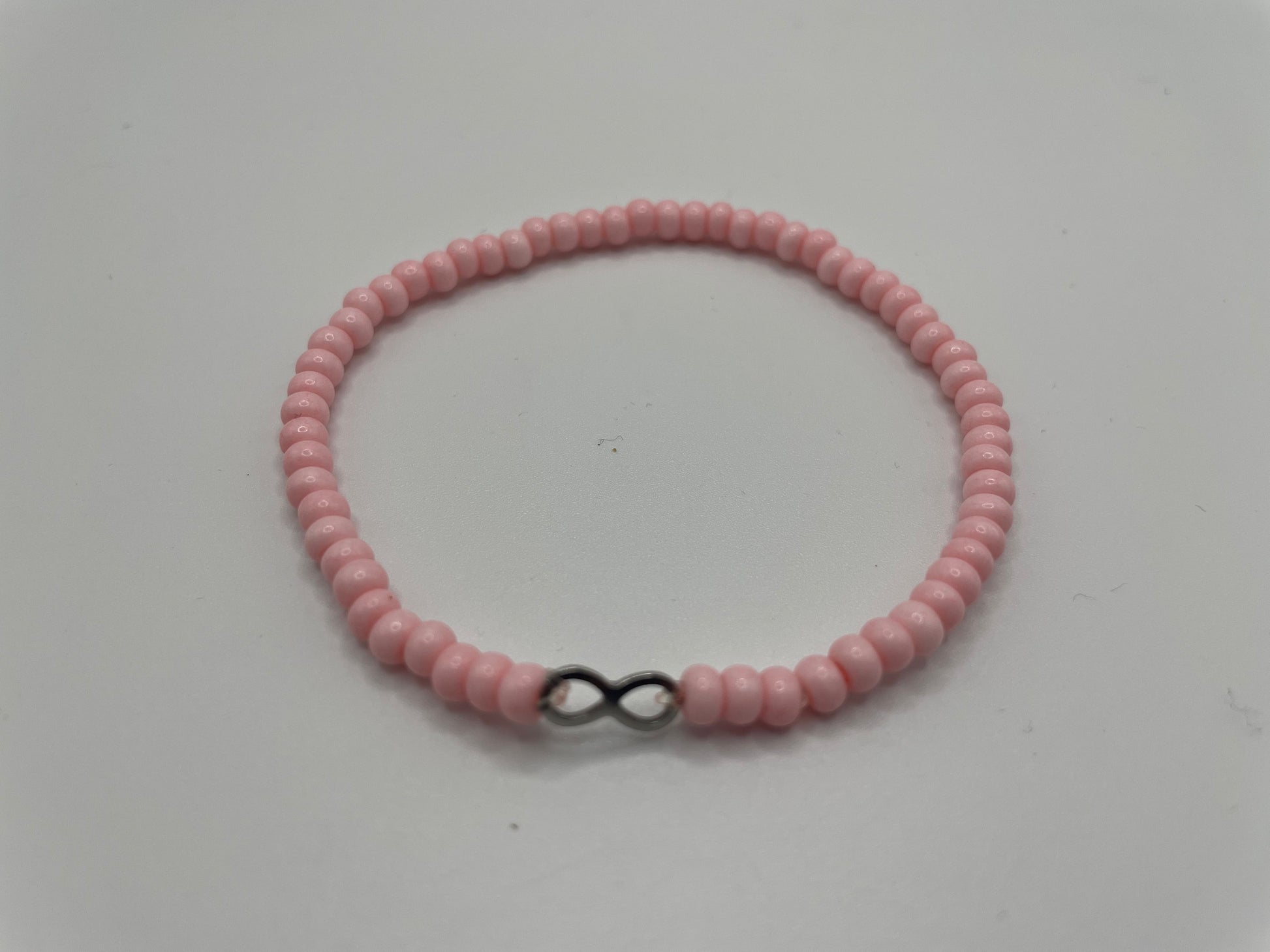 Delicate and minimalist, this bracelet features 0.4 cm soft pink round beads accented with a sleek infinity connector in a modern design. Its gentle hue and lightweight feel make it a perfect everyday accessory — subtle, feminine, and easy to pair with any outfit.