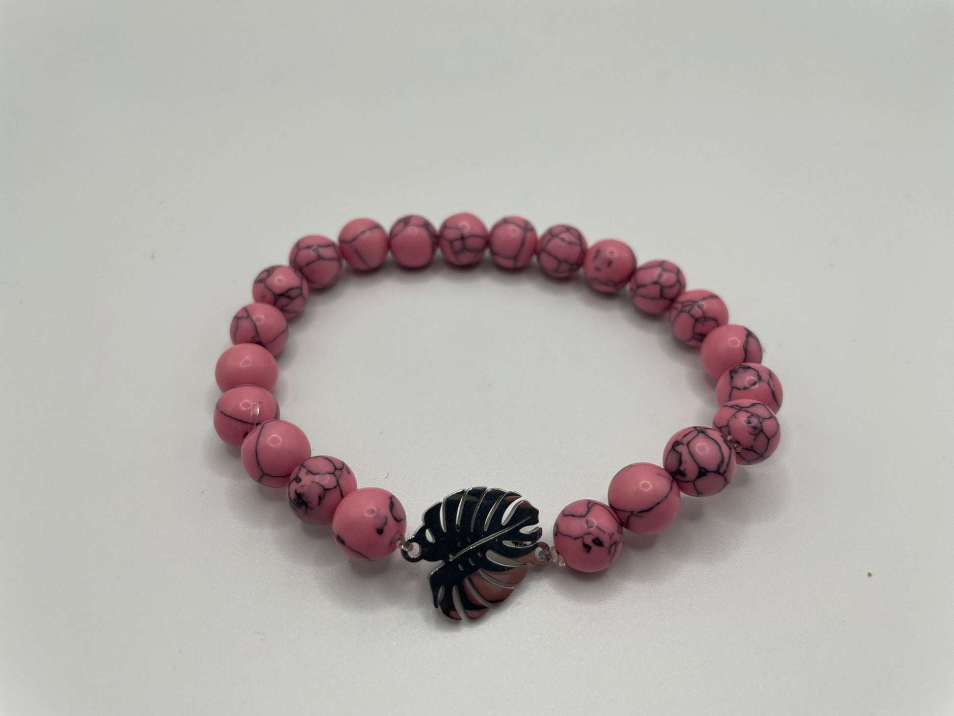 Add a pop of color to your look with this handmade bracelet featuring vibrant pink marbled beads and a sleek stainless steel Monstera leaf charm. The tropical-inspired design combines elegance and fun, making it a standout accessory for any season.