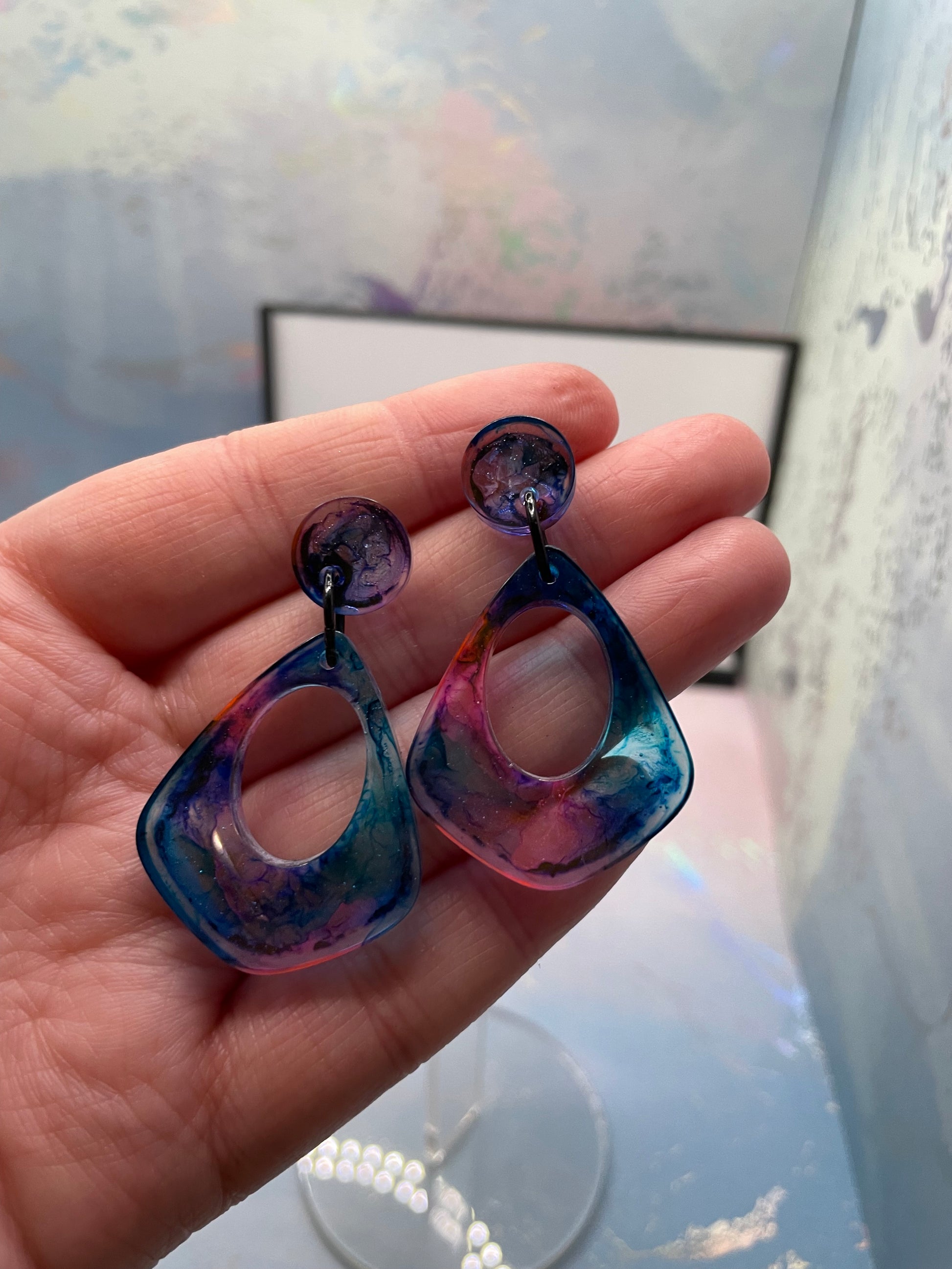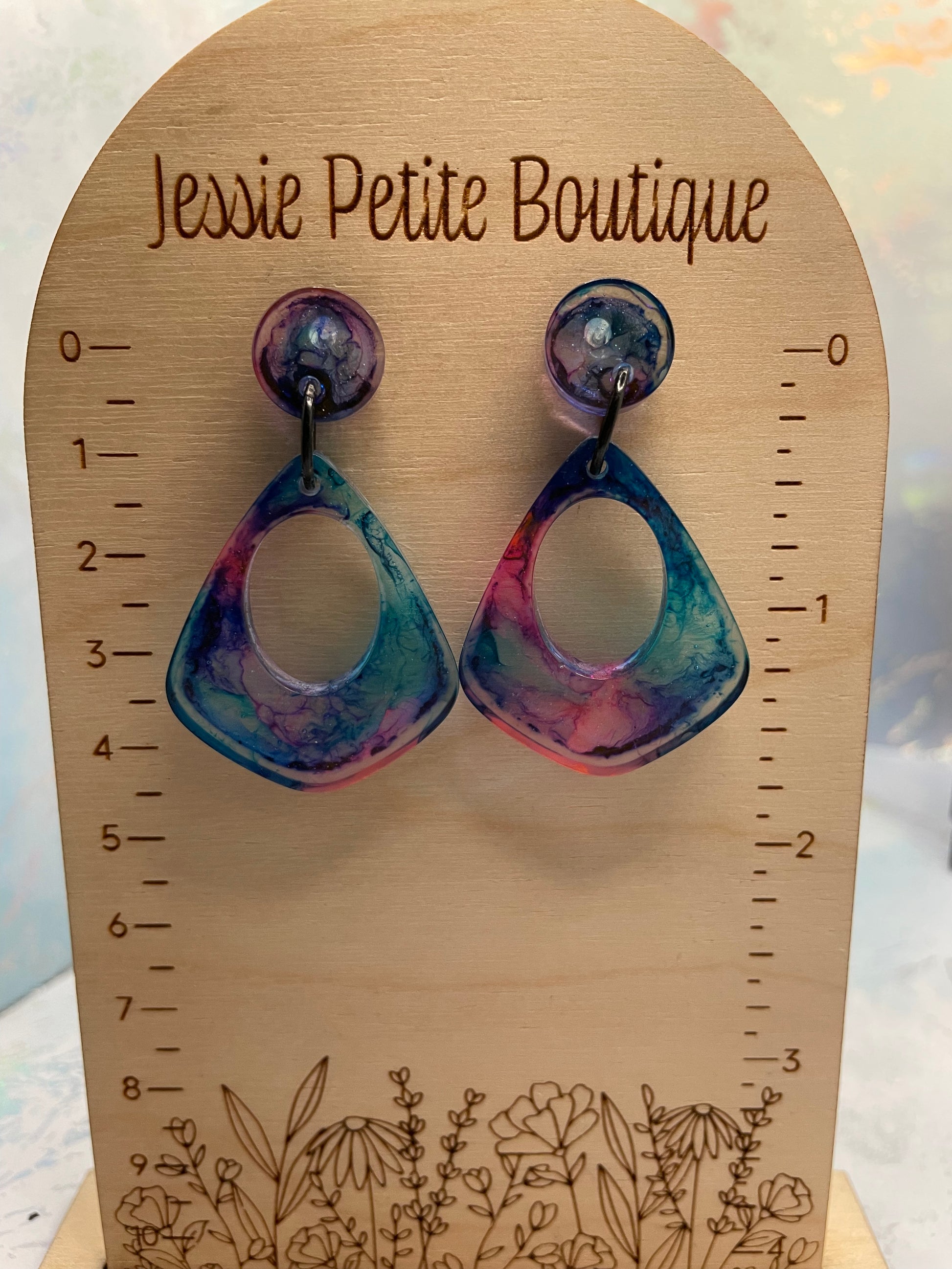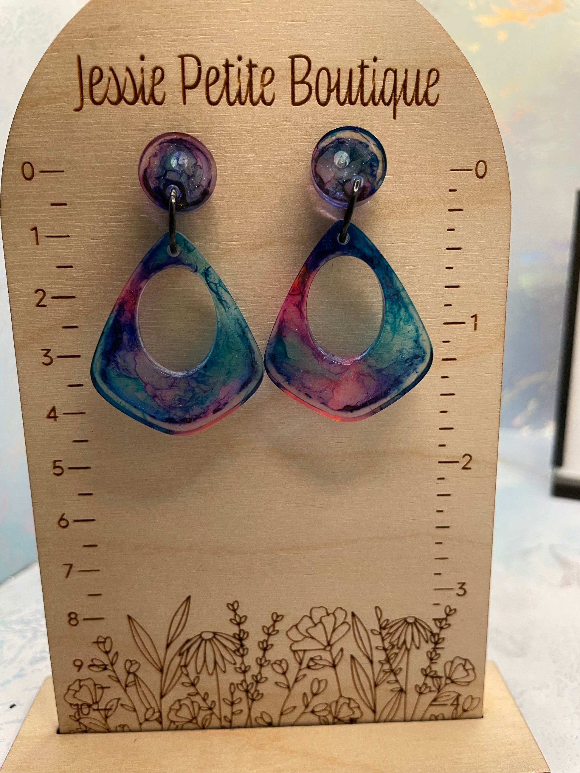 These stunning handcrafted teardrop earrings feature an elegant blend of pink, blue, and purple hues, creating a mesmerizing gradient effect. Made with alcohol ink and resin, their glossy finish catches the light beautifully, making them perfect for adding a pop of colour to any outfit. Lightweight and hypoallergenic, they are designed for both style and comfort.