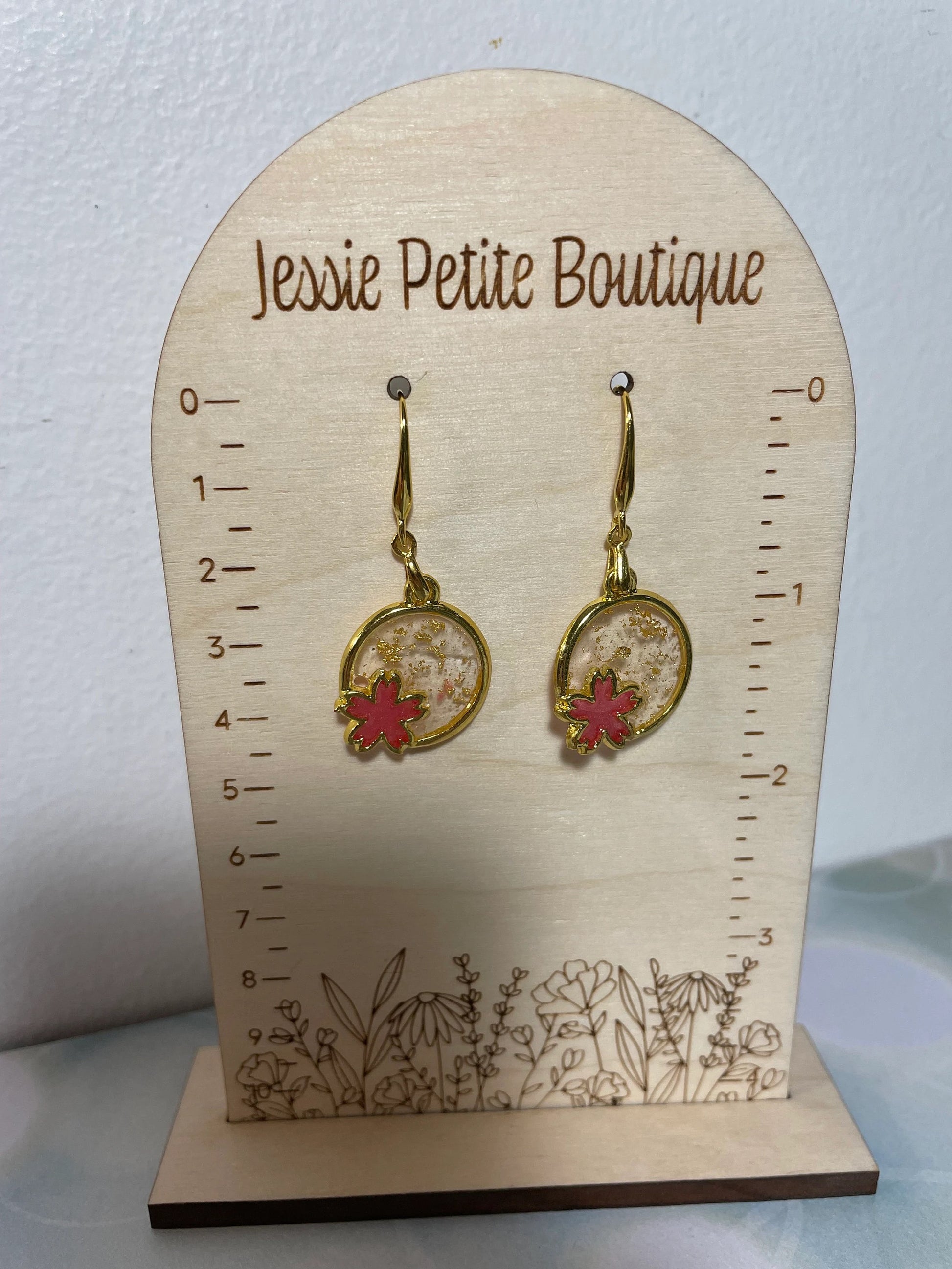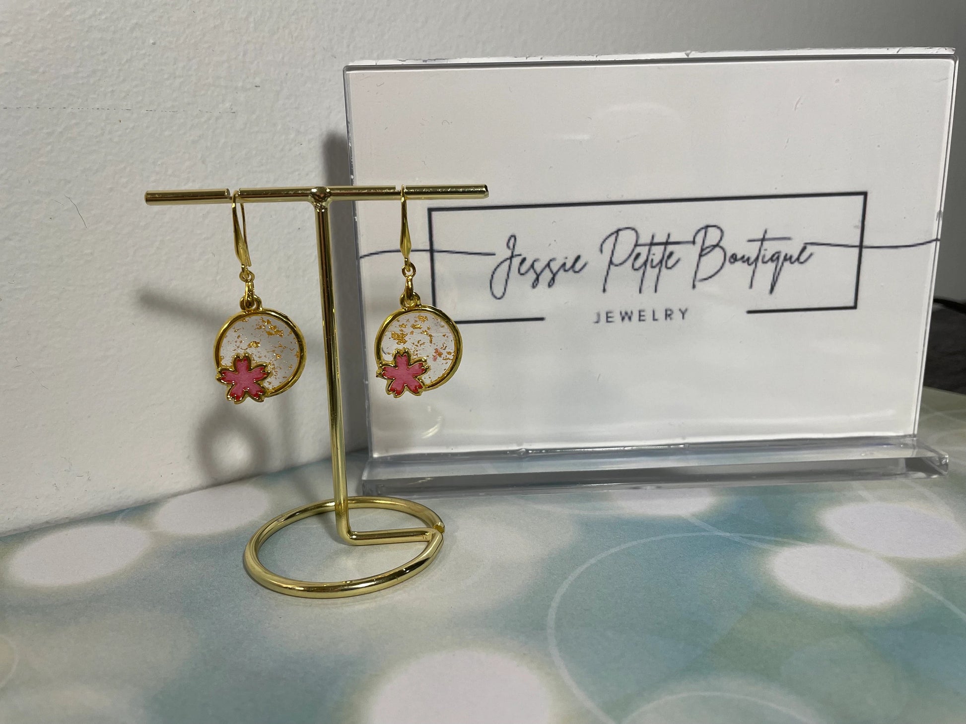 Add a touch of timeless elegance to your look with these delicate gold floral circle earrings. Each piece features a small pink flower framed within a gold-toned circle, filled with a soft shimmer of resin and golden flakes — a perfect balance between charm and sophistication.
