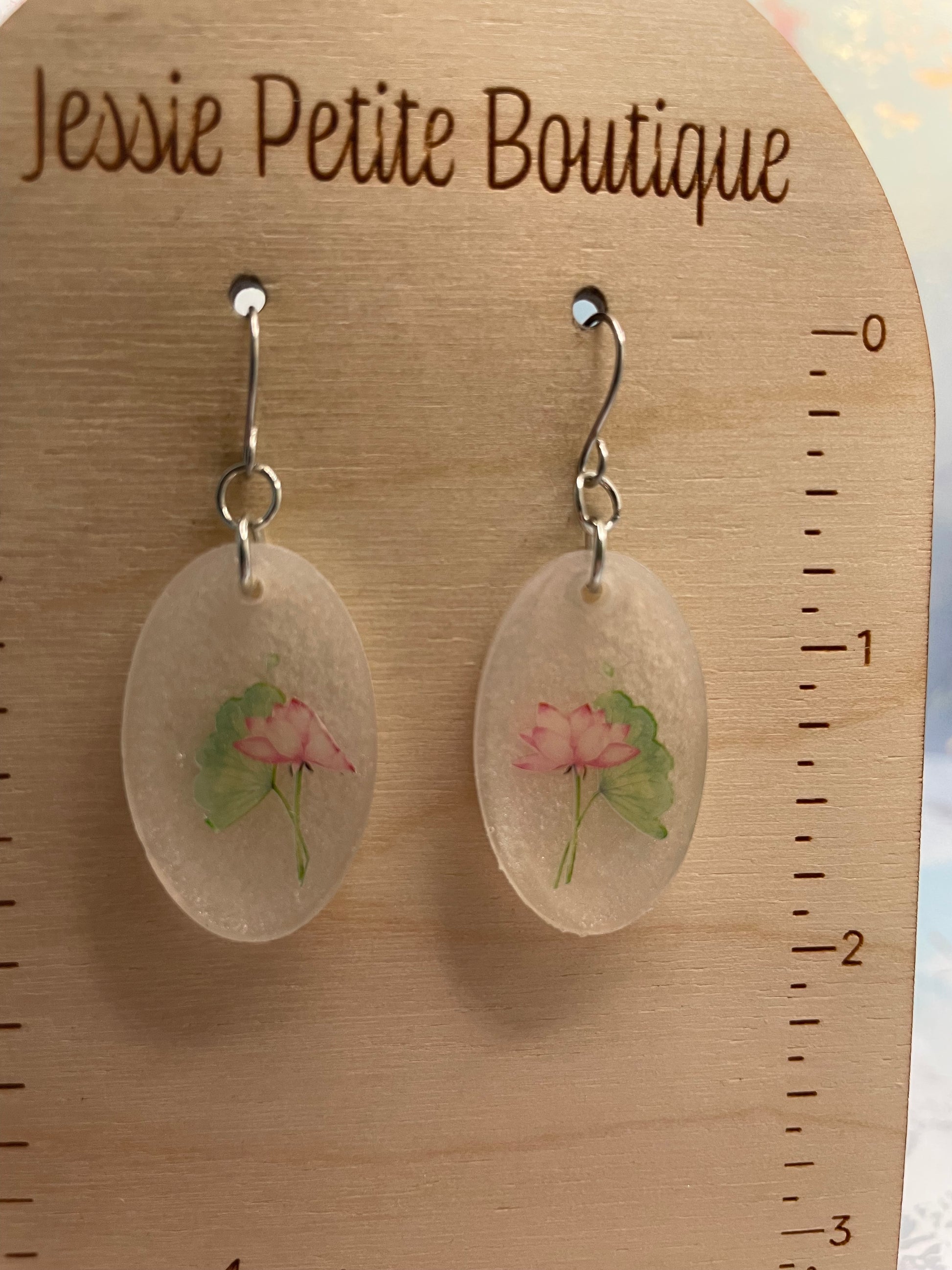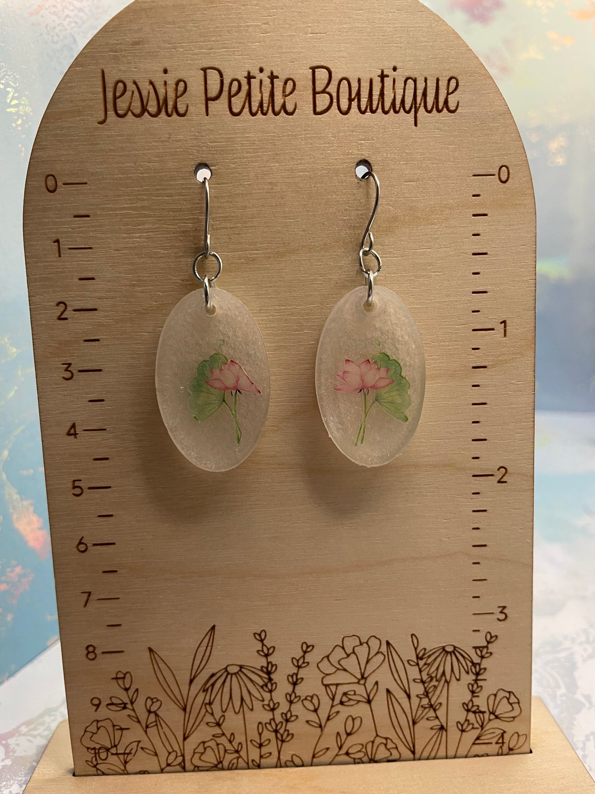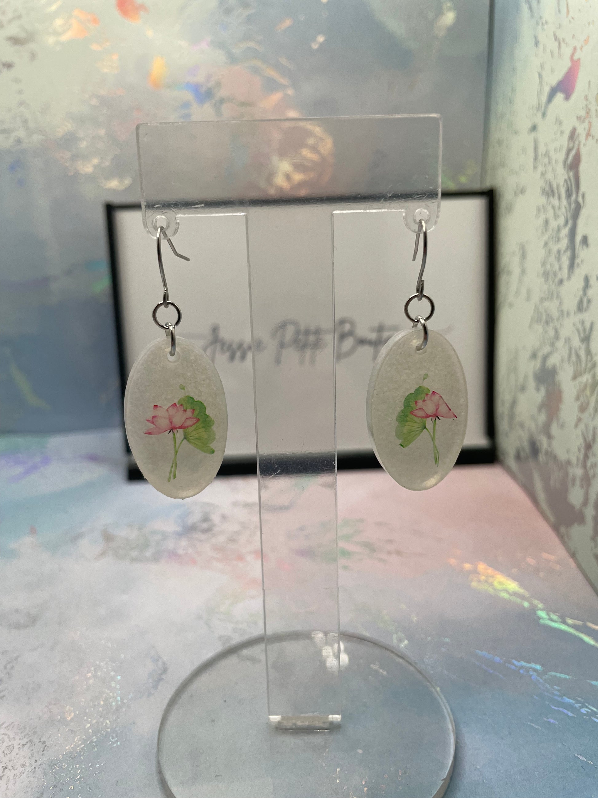 Pink Flower on White Oval Earrings – STAINLESS STEEL